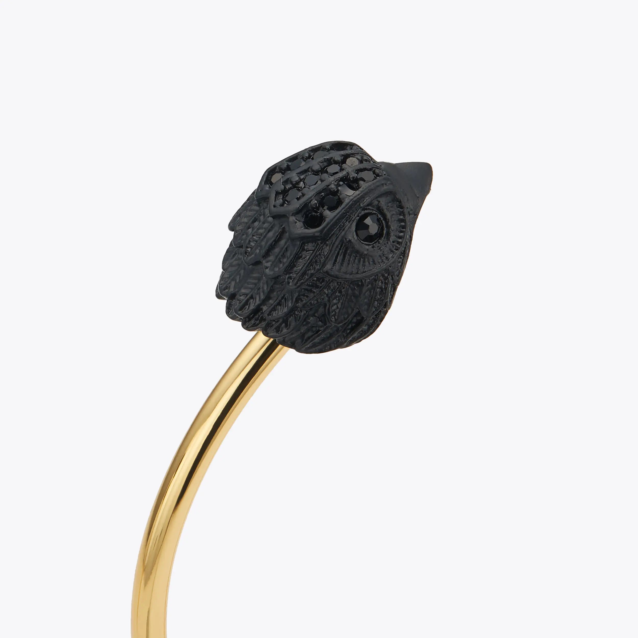 This Micro Eagle Cuff features a thin gold tone band which slips onto the wrist. There are two matte black eagle heads with crystals on each end.