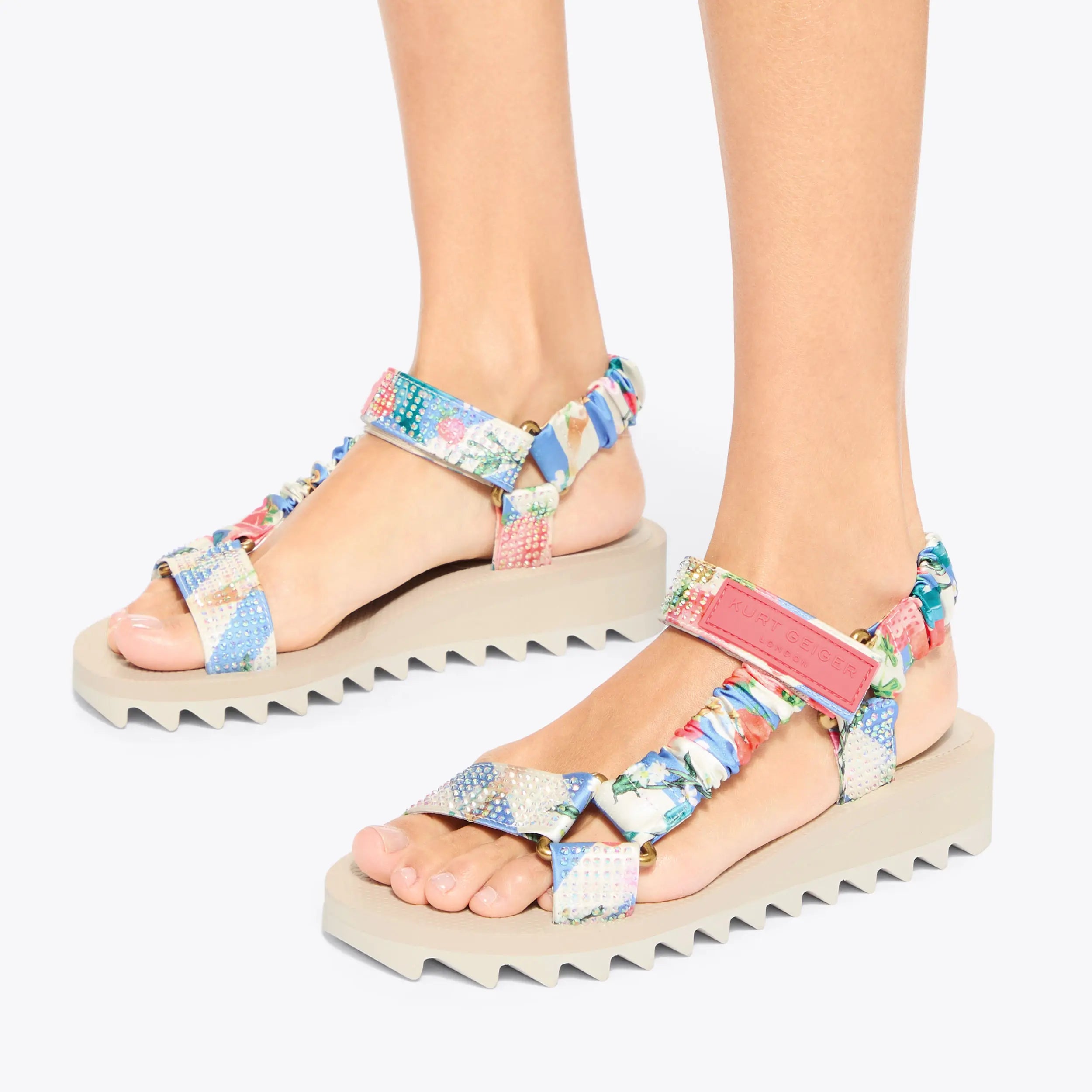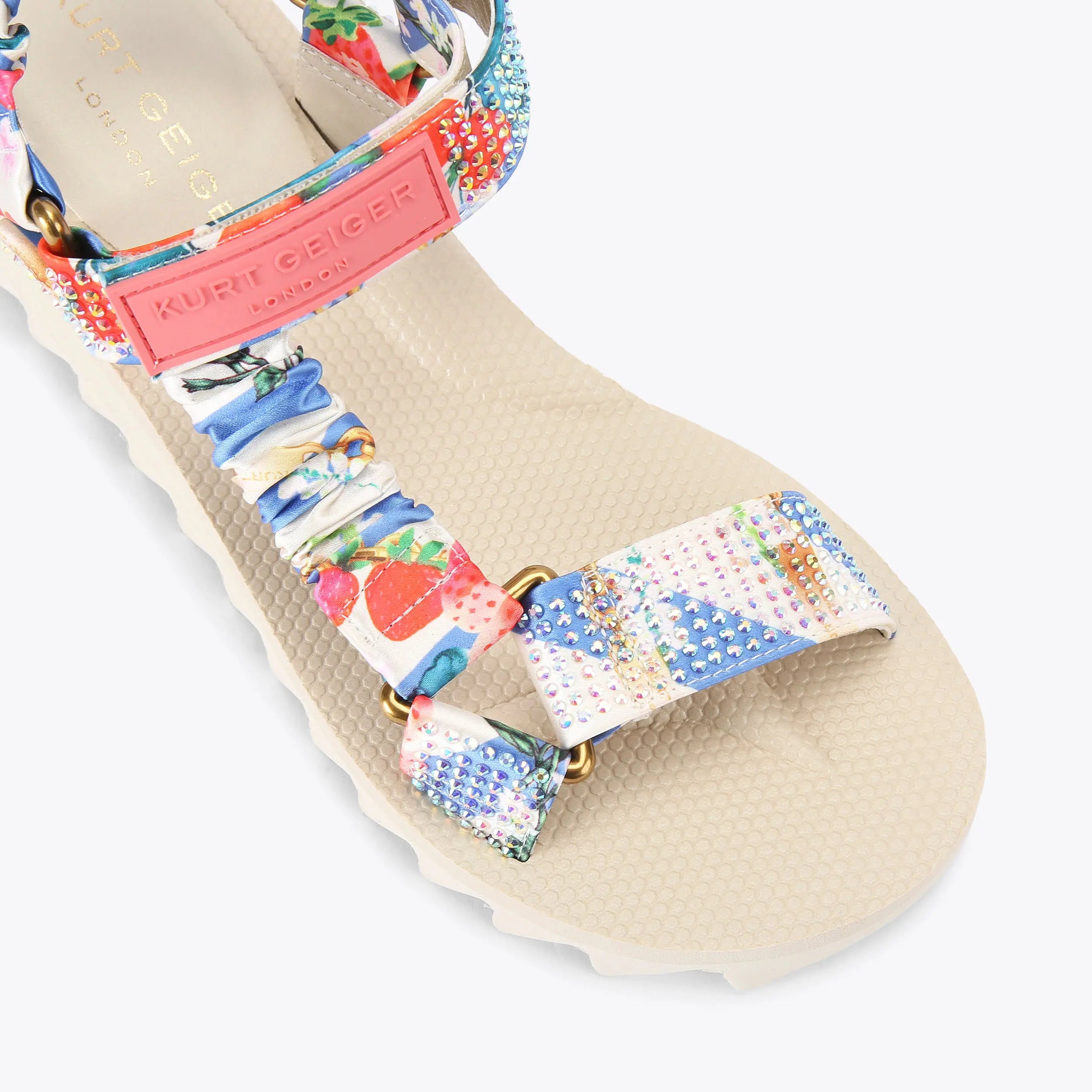 The Orion sandal is an open style with strawberry chain printed satin ruched straps across the foot. The velcro strap is topped with a pink rubber branded patch.