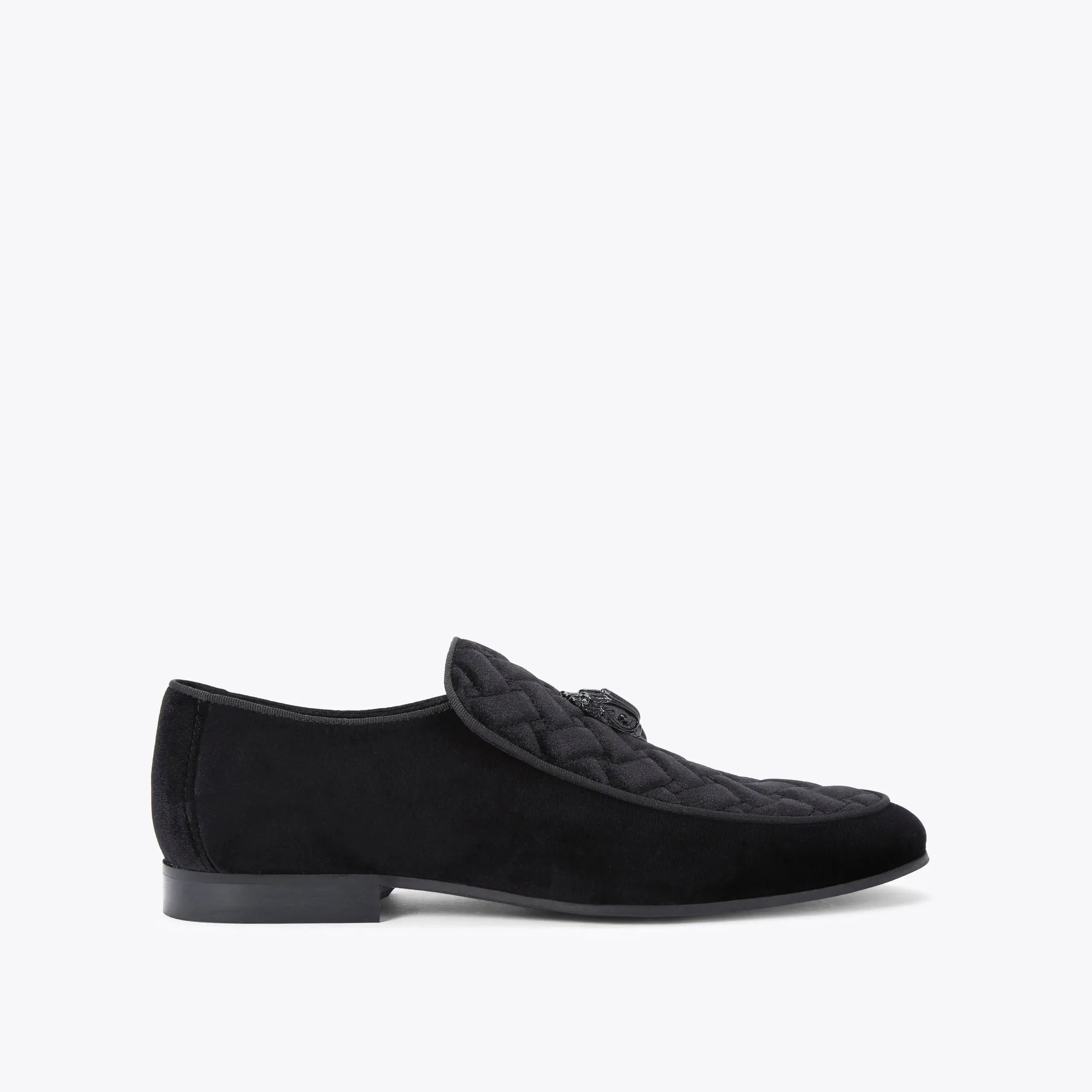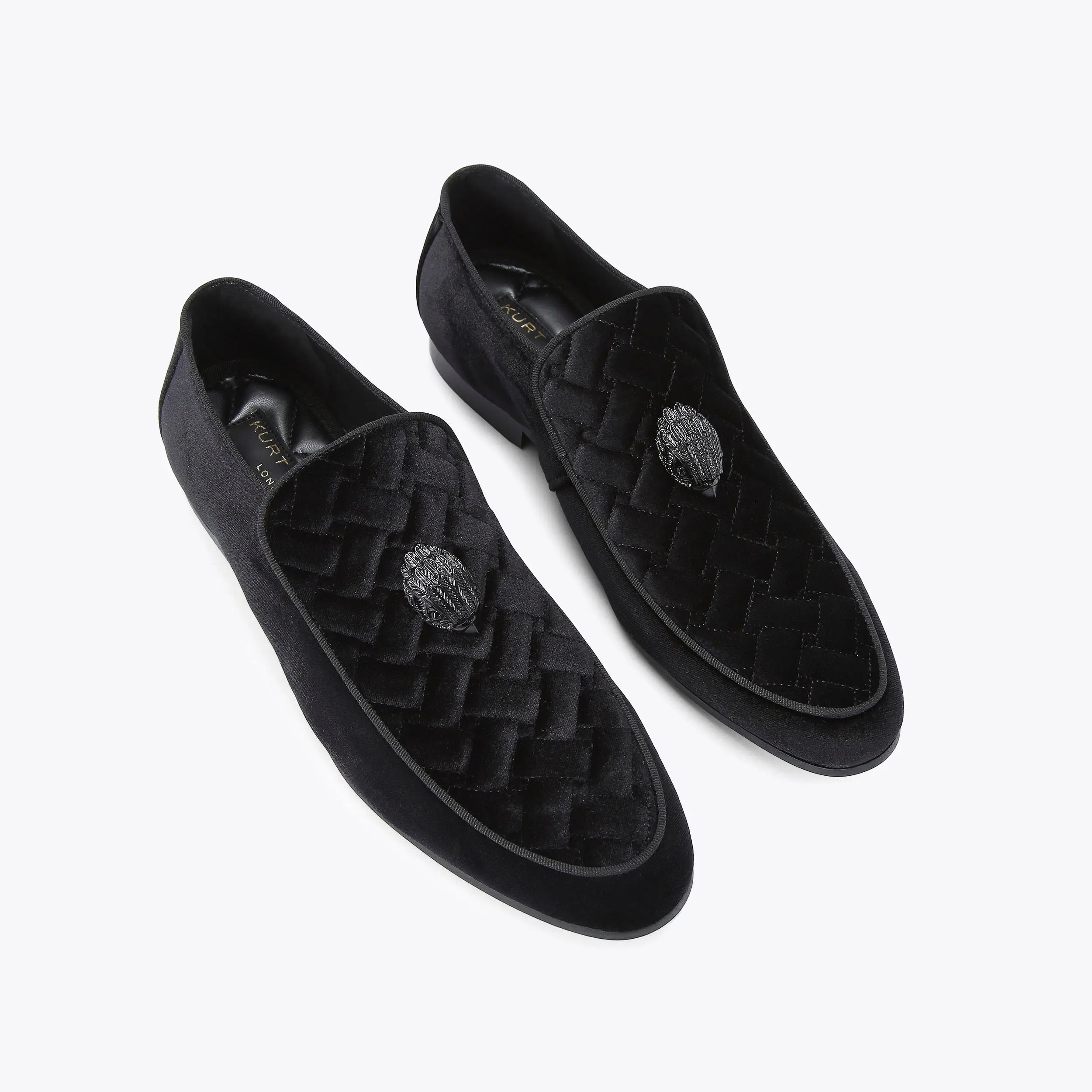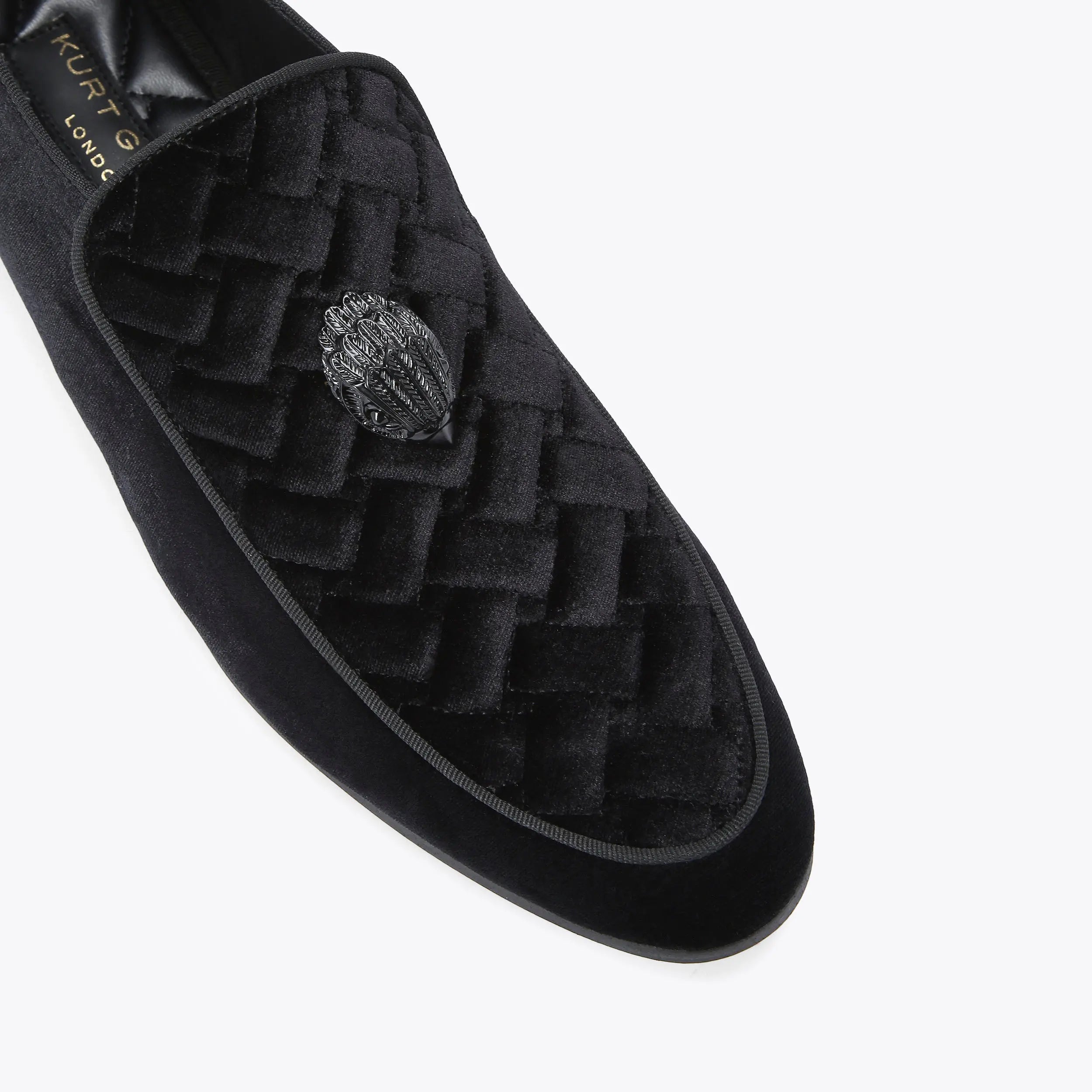 The Hugh Eagle Head is a slip on loafer crafted in black velvet that features overstitch quilting in a weave design. The black eagle head sits on the front.