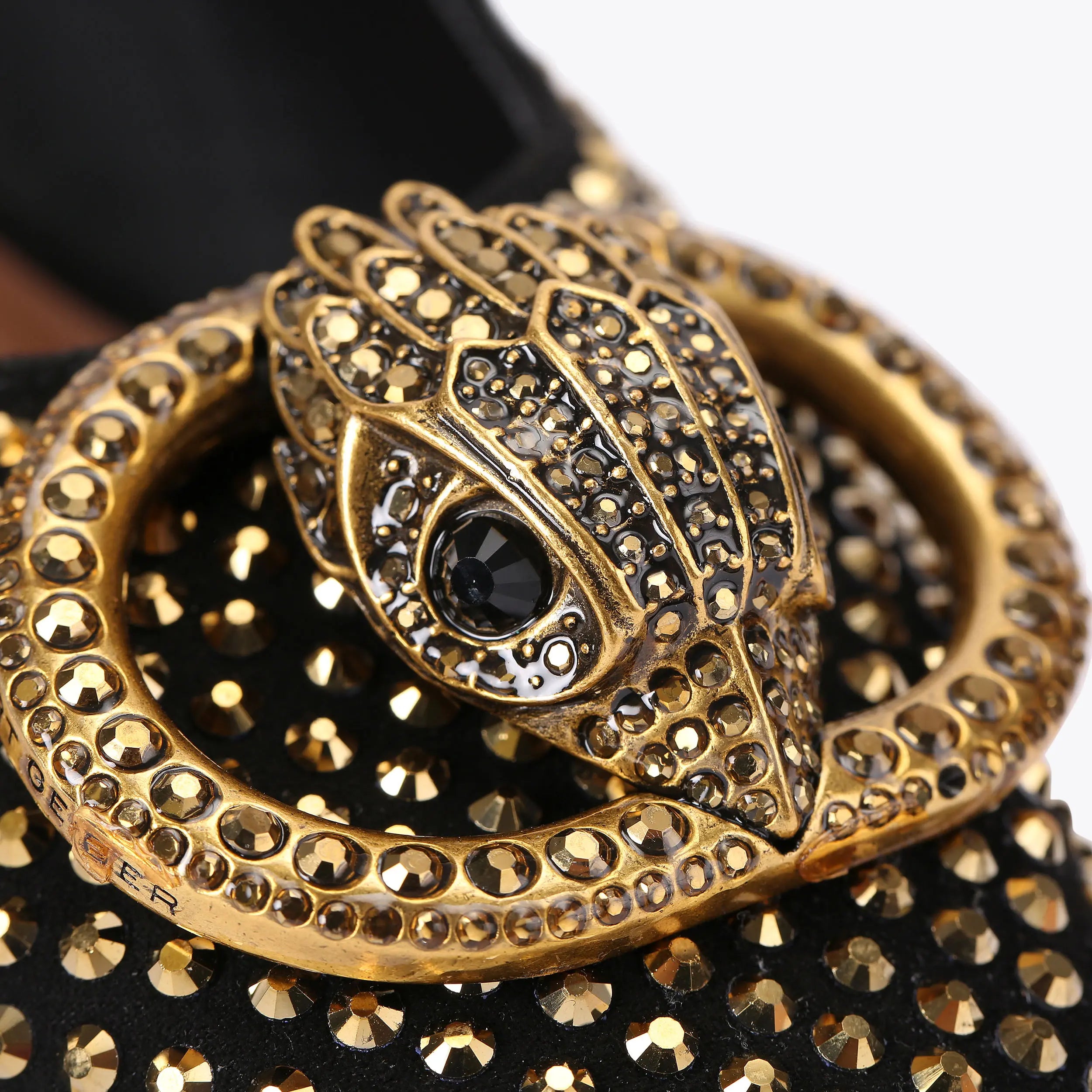 The Chelsea Slingback Heel features a black suede leather upper with crystal embellishment. There is a crystal embellished antiqued brass oval trim with central eagle head sat upon the toe. The block heel is in gold with crystal embellishment.