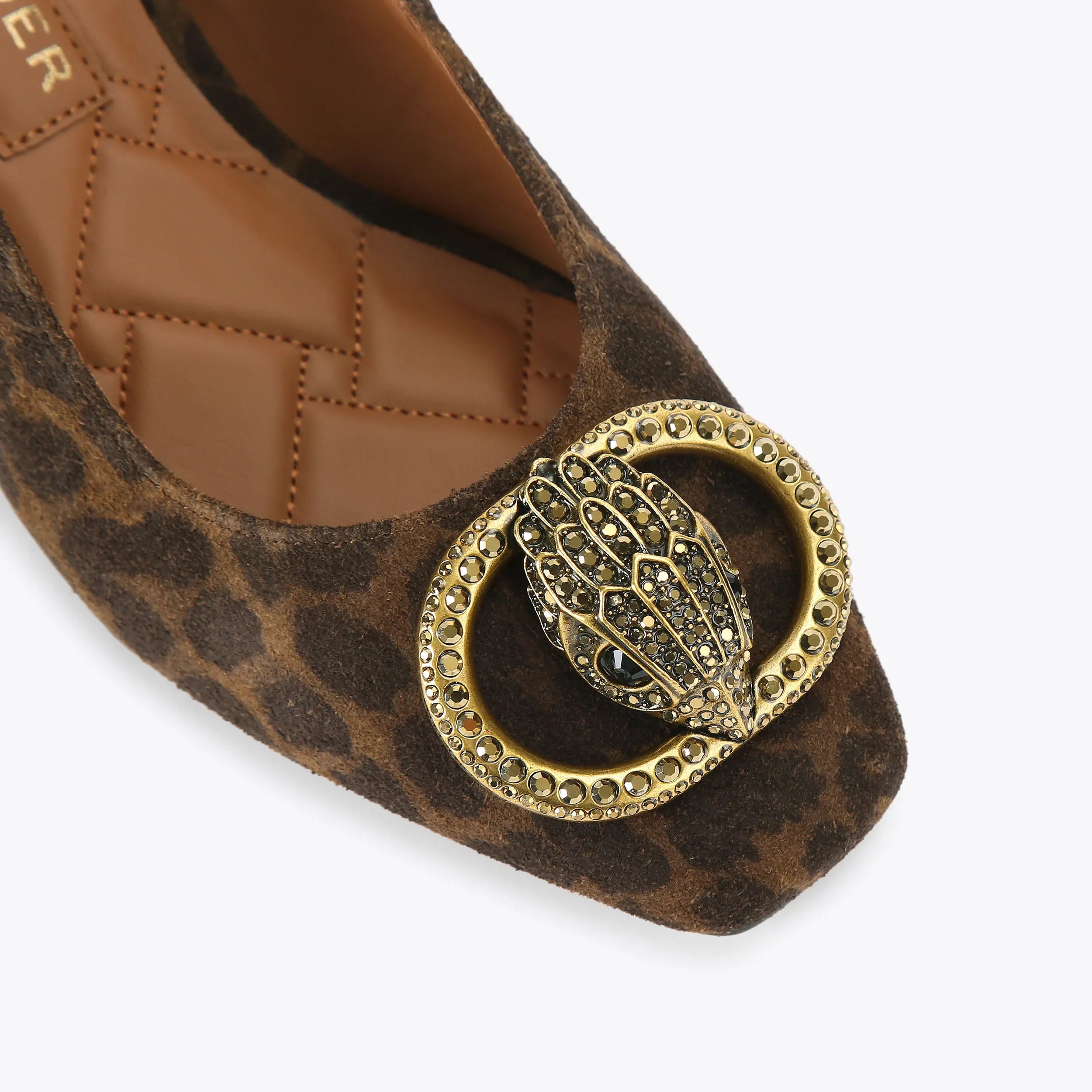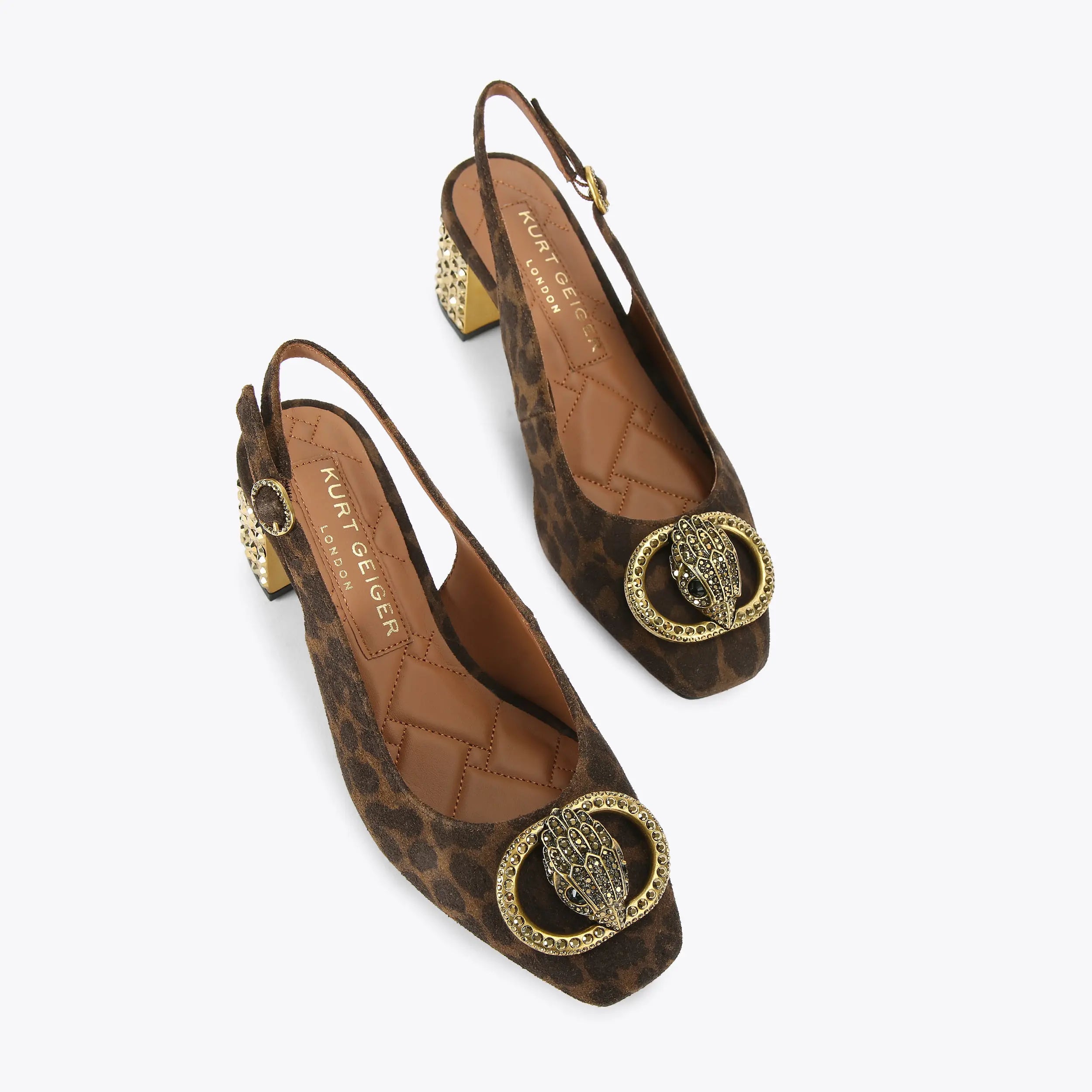 The Chelsea Slingback Heel features a leopard printed suede leather upper. There is a crystal embellished antiqued brass oval trim with central eagle head sat upon the toe. The block heel is in gold with crystal embellishment.