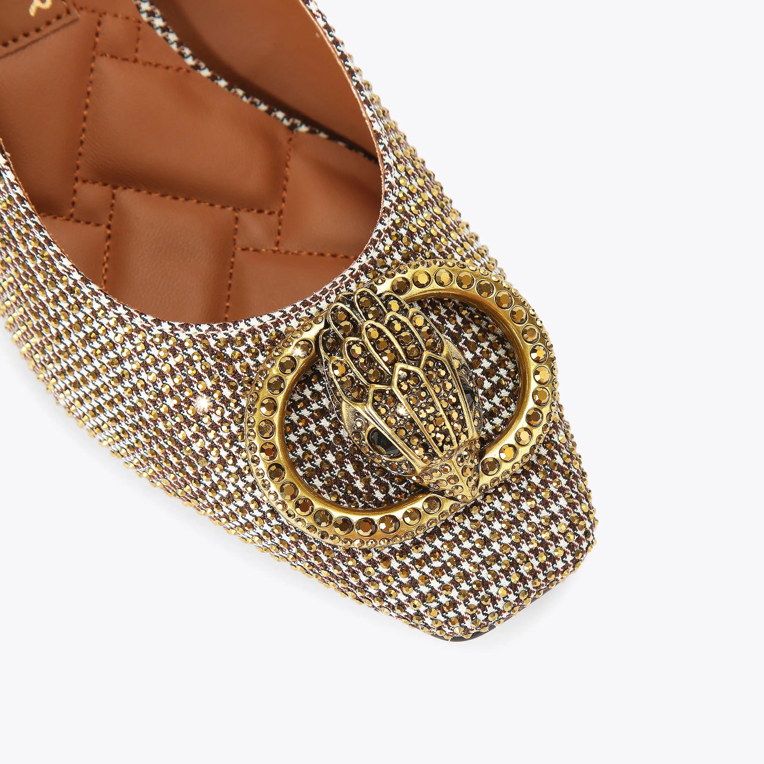 The Chelsea Slingback Heel features a beige houndstooth upper with crystal embellishment. There is a crystal embellished antiqued brass oval trim with central eagle head sat upon the toe. The block heel is in gold with crystal embellishment.