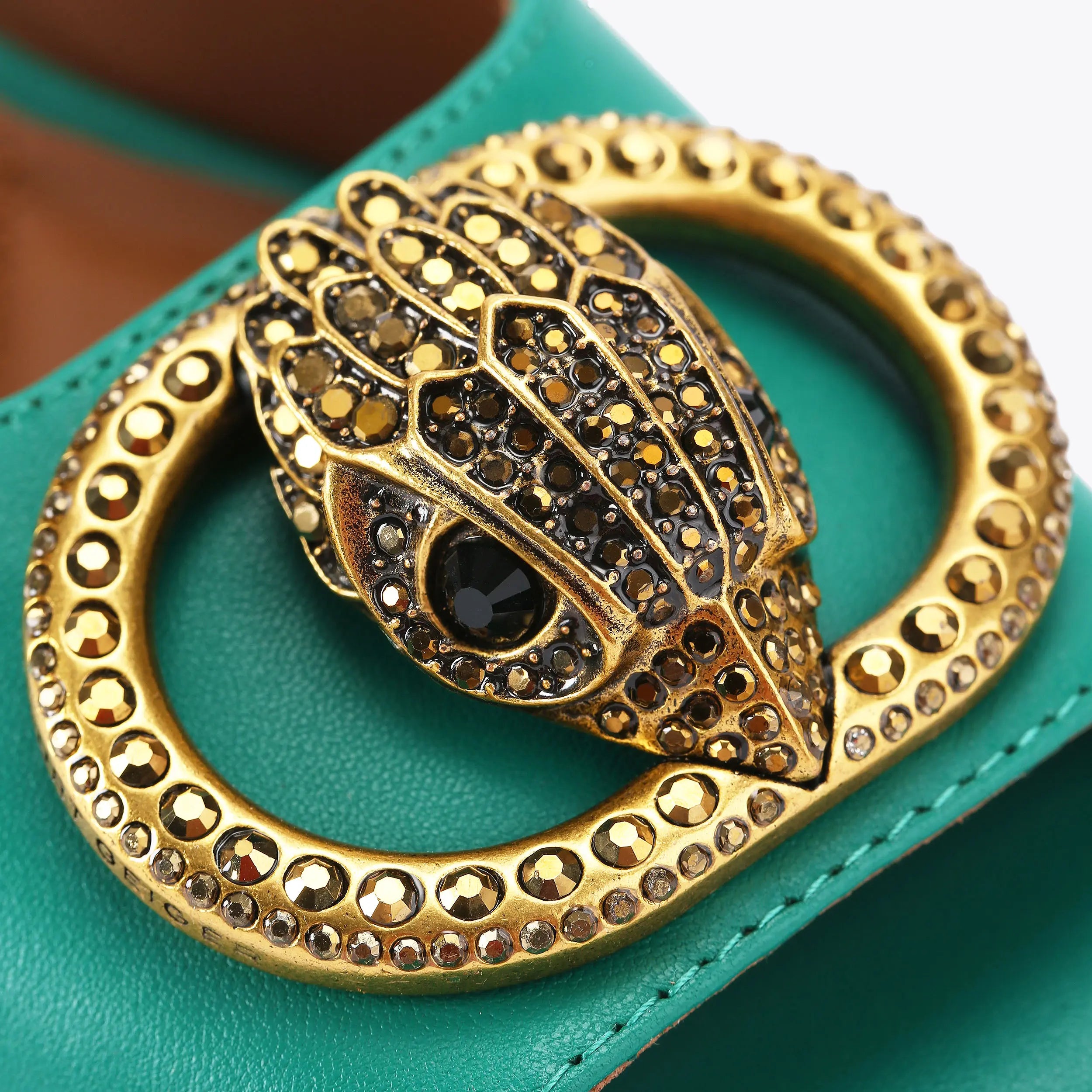 The Chelsea Slingback Heel features a green upper. There is a crystal embellished antiqued brass oval trim with central eagle head sat upon the toe. The block heel is in gold with crystal embellishment.