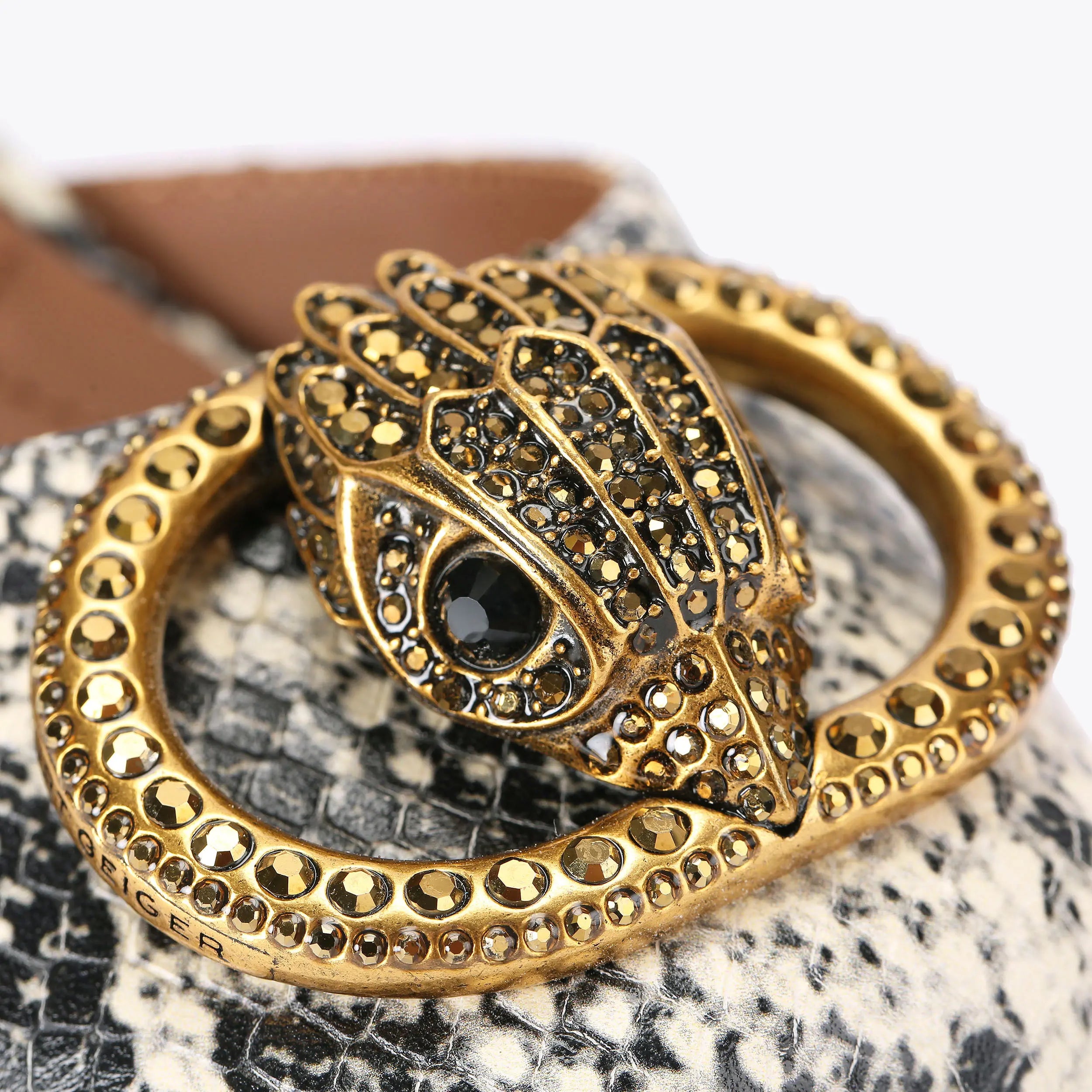 The Chelsea Closed Platform heel is crafted from a snake embossed leather. There is a crystal embellished antiqued brass oval trim with central eagle head sat upon the toe.