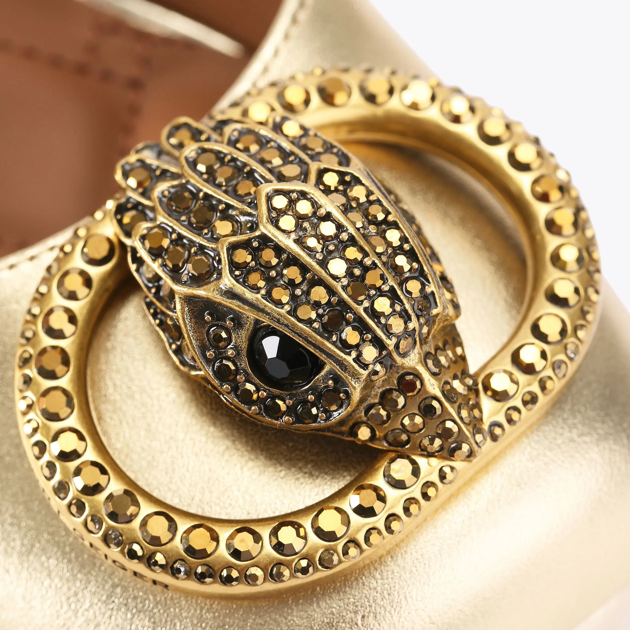 The Chelsea Closed Platform heel is crafted from a metallic gold leather. There is a crystal embellished antiqued brass oval trim with central eagle head sat upon the toe.