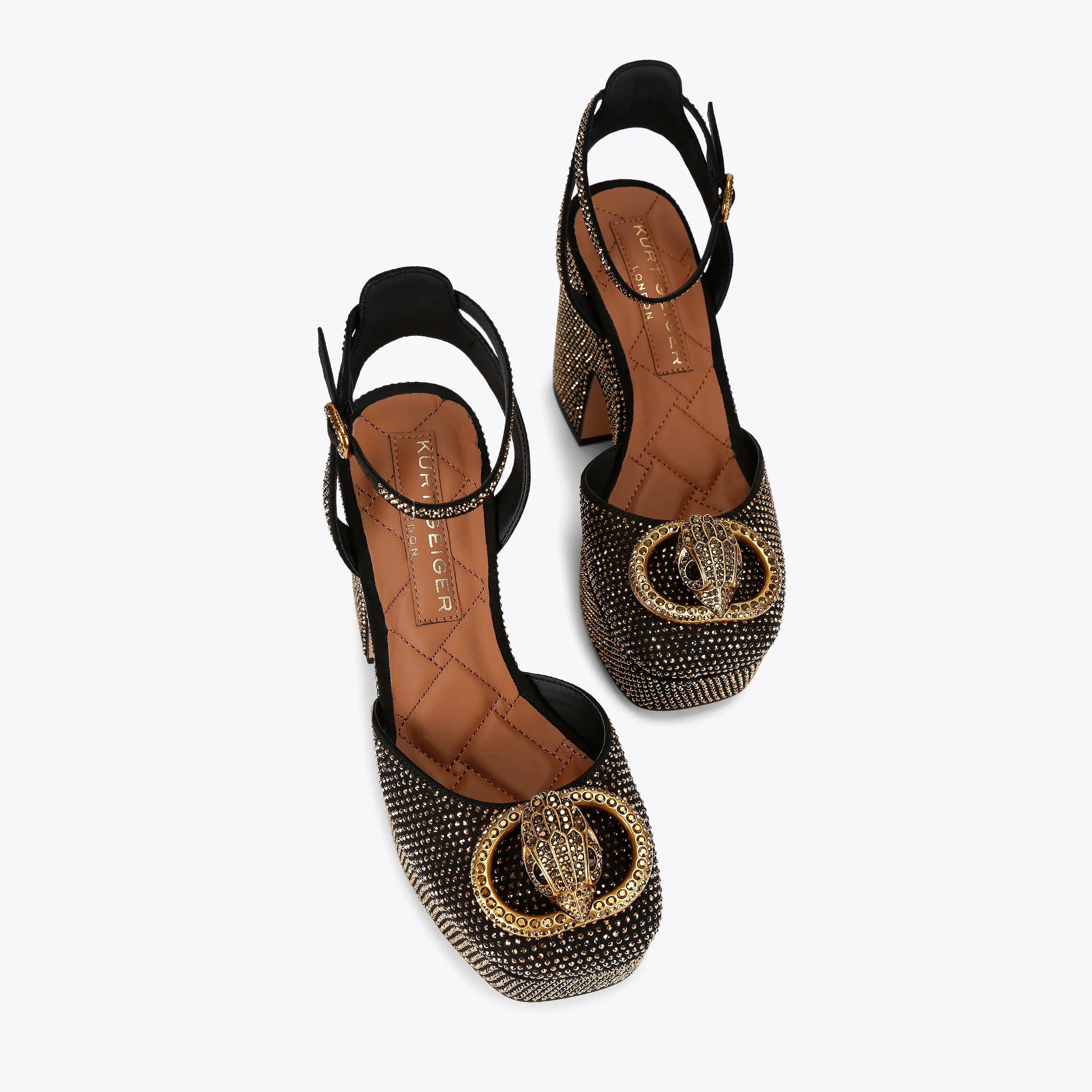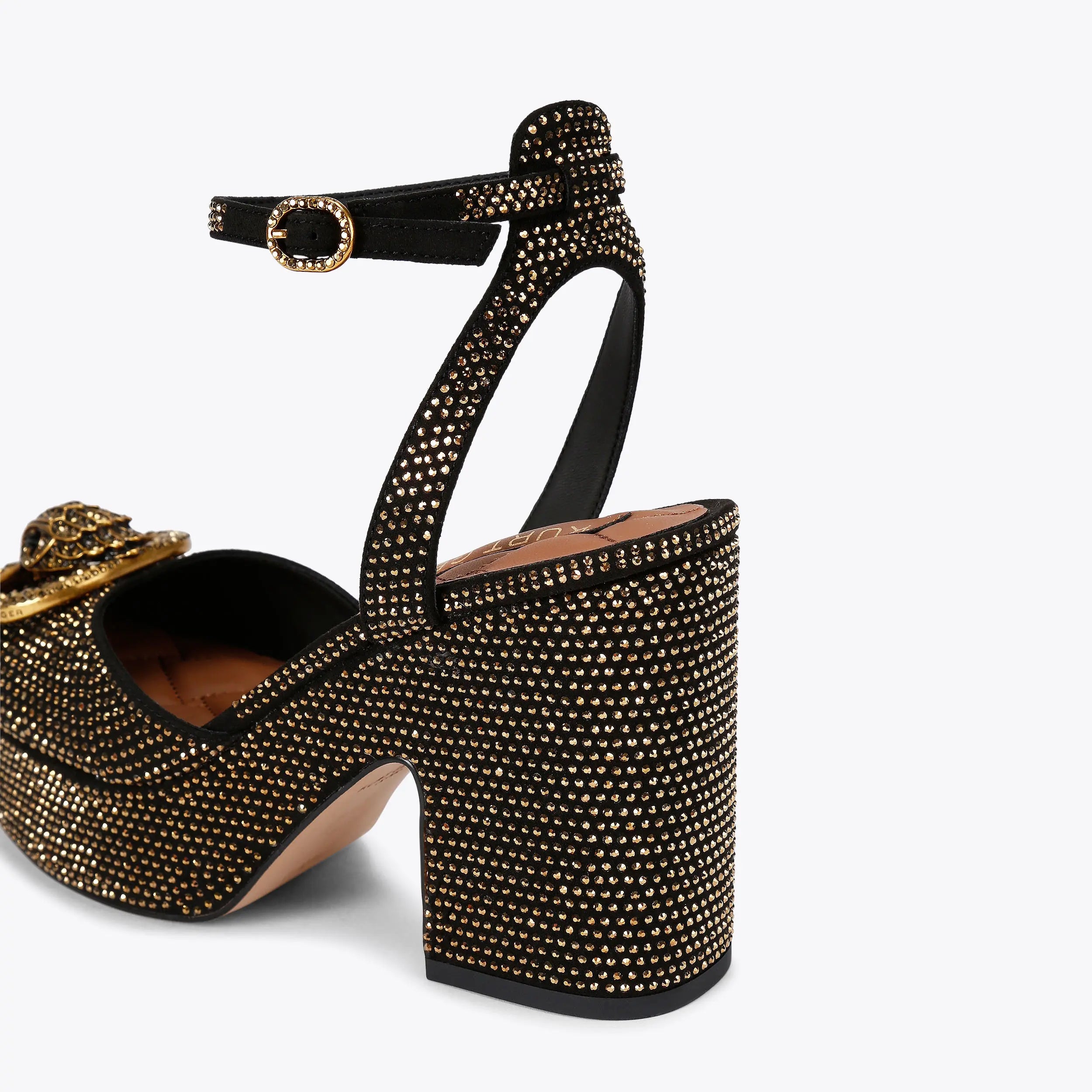 This Chelsea Closed Platform Heel is crafted from a black microsuede that is embellished with gold studs. There is an antiqued brass oval trim with eagle head at the centre on the toe.