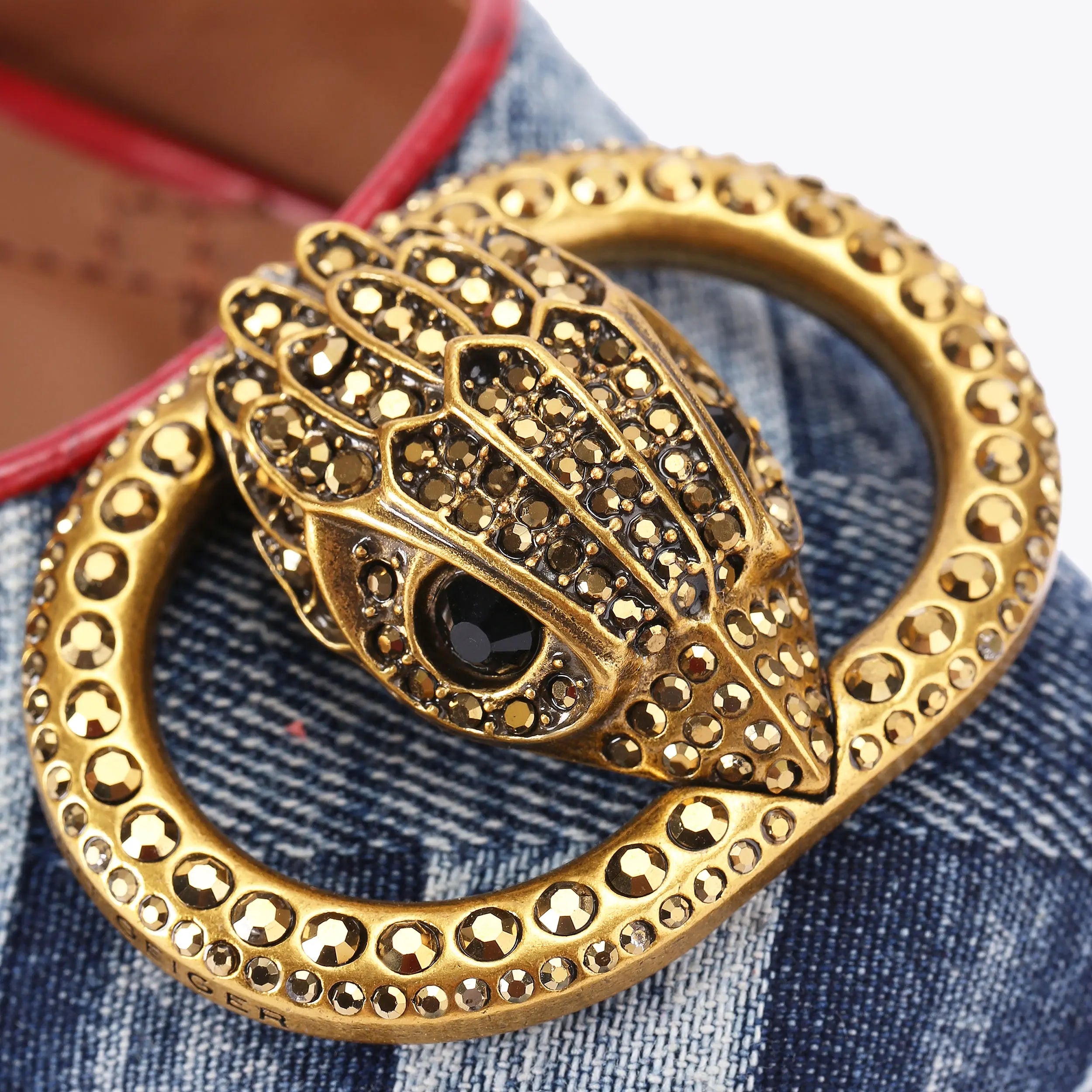 The Chelsea Closed Platform heel is crafted from a blue paisley printed denim. There is a crystal embellished antiqued brass oval trim with central eagle head sat upon the toe.
