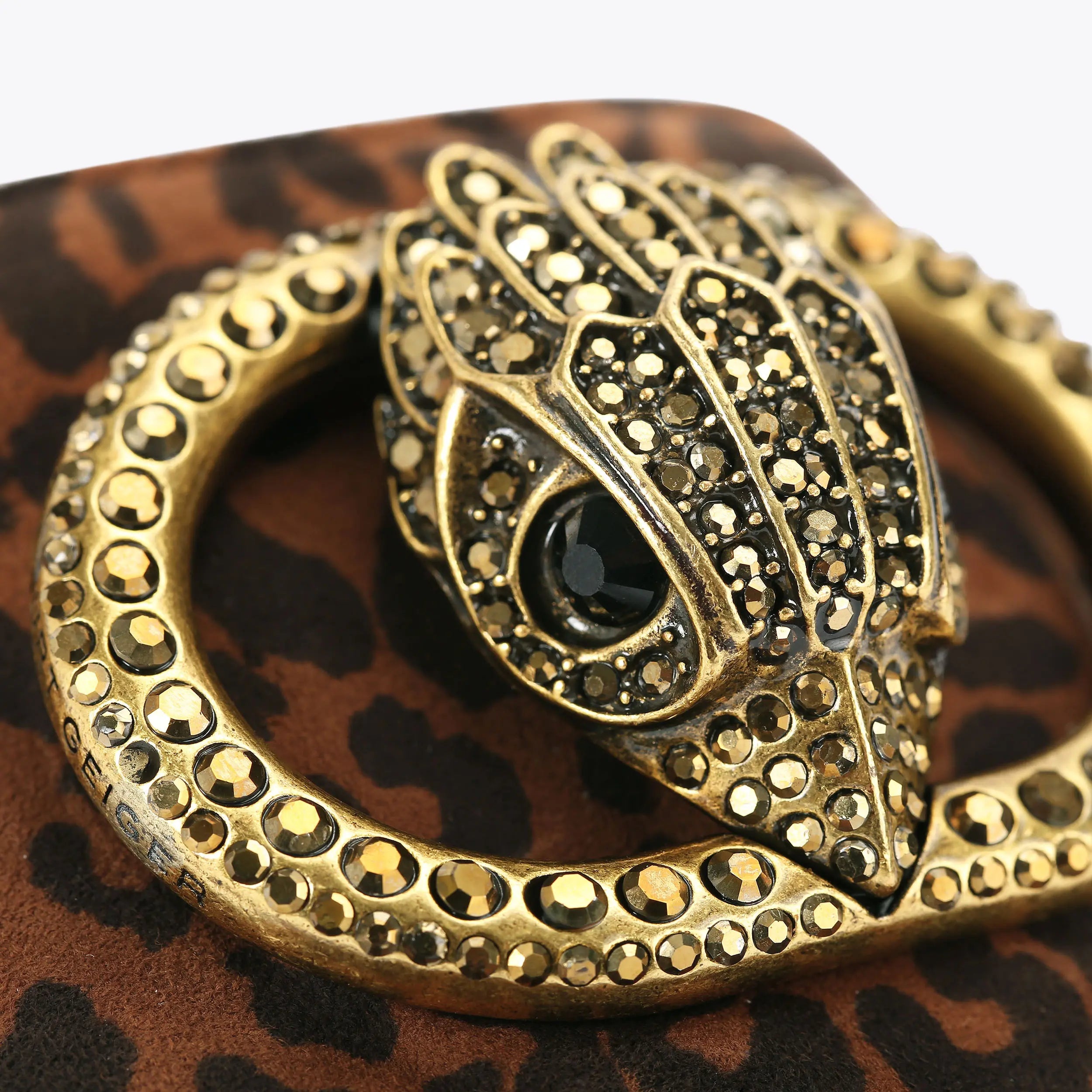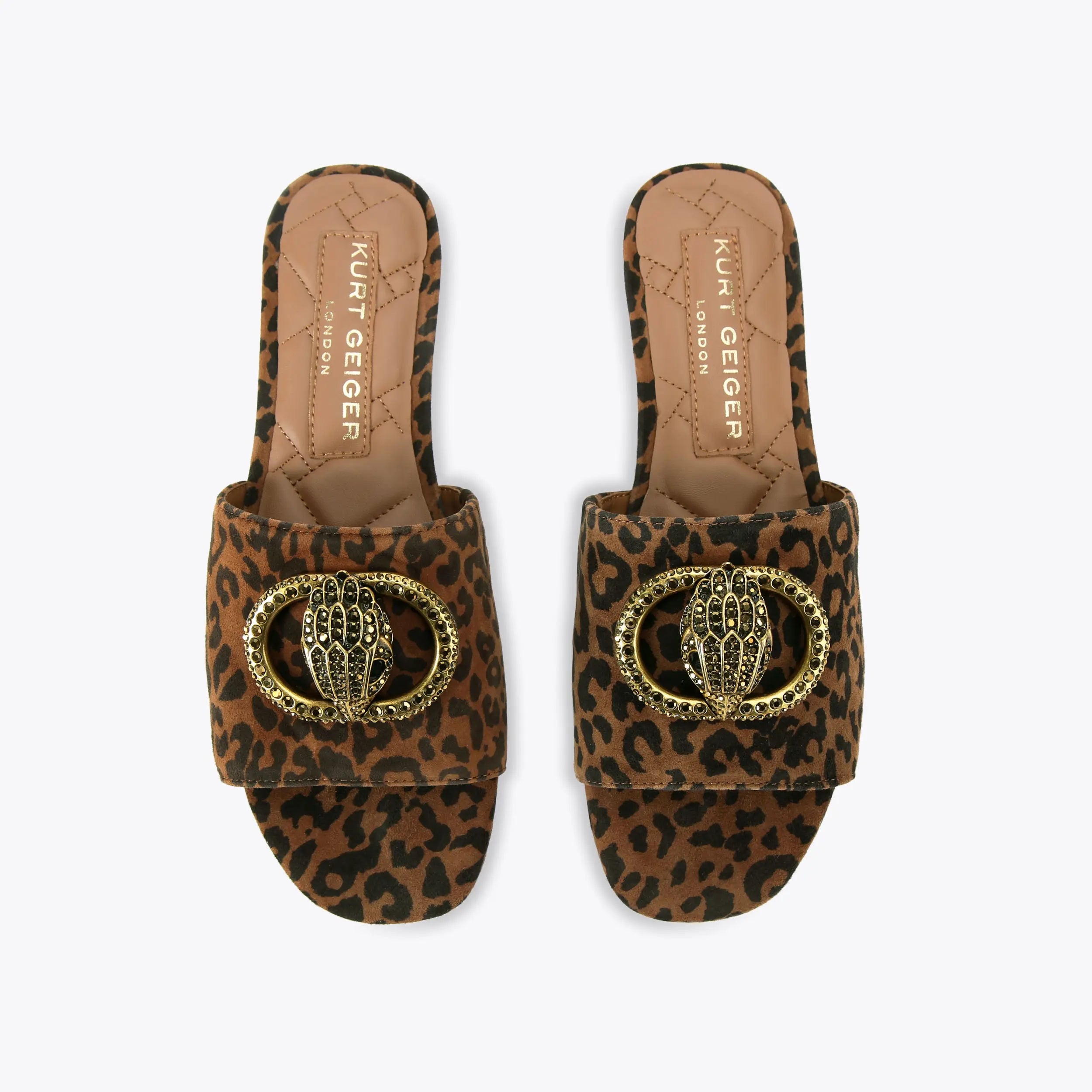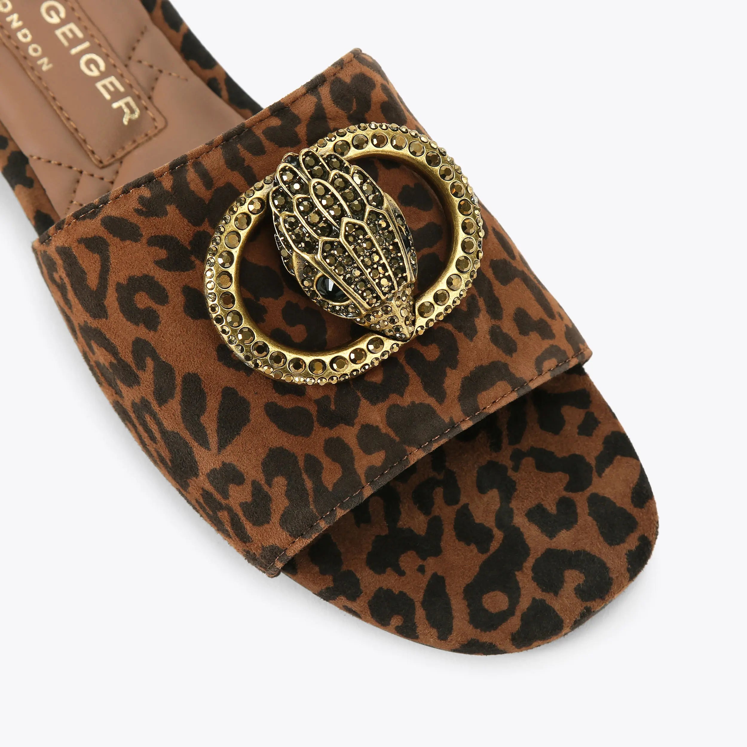 This Chelsea Flat Sandal is a slip-on style with a leopard printed design. There is an antiqued brass buckle and eagle head embellished with crystals on top of the toe strap. The low heel is also embellished with crystals.