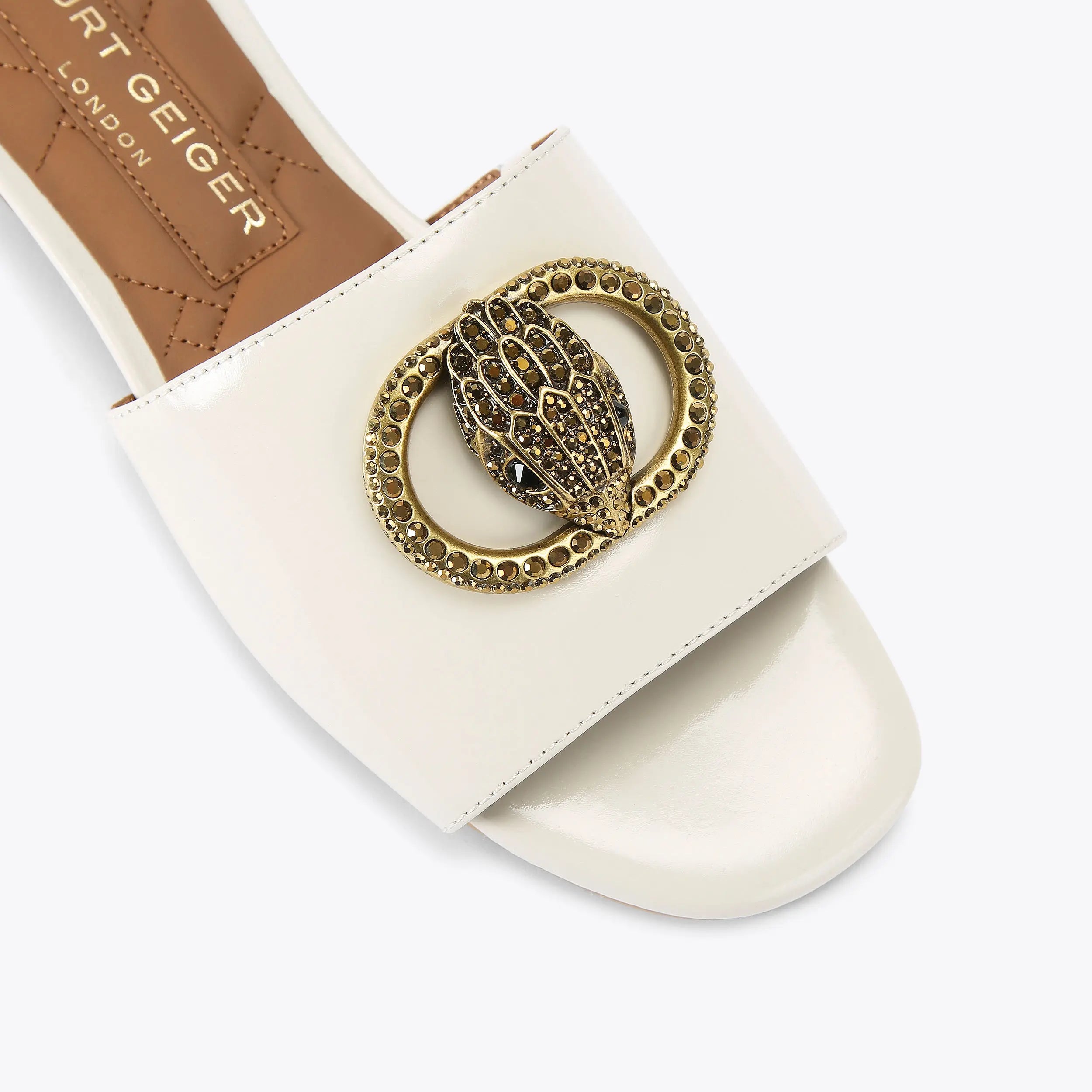 This Chelsea Flat Sandal is a slip-on style with a patent bone strap across the foot. There is an antiqued brass oval trim and eagle head embellished with crystal on top of the toe strap. The low heel is also embellished with crystals.