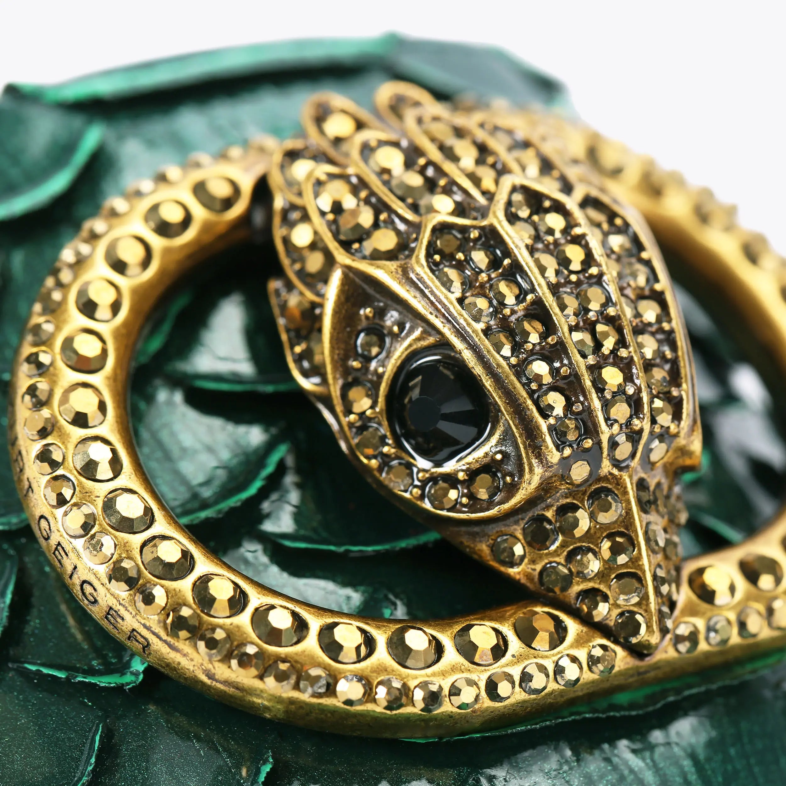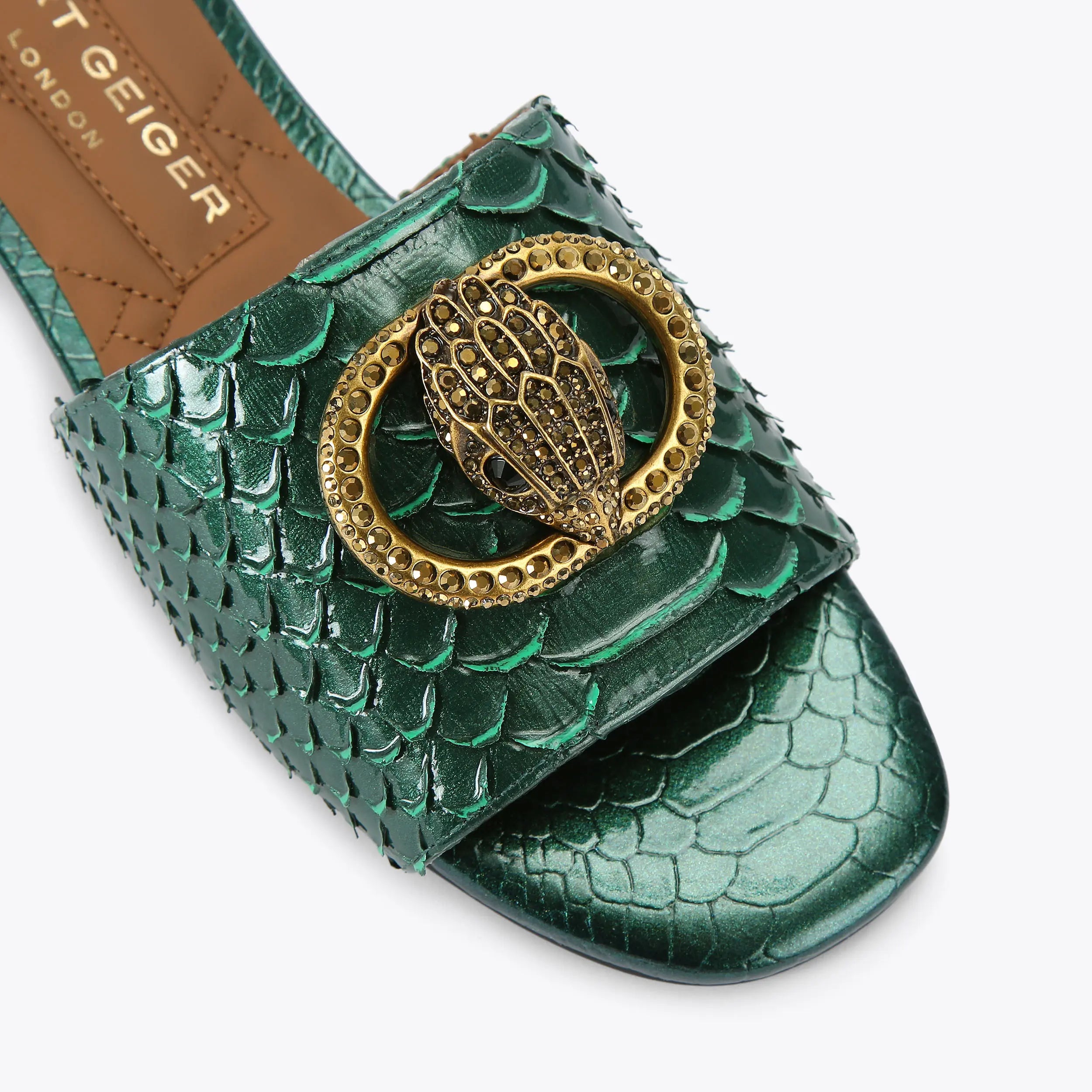 This Chelsea Flat Sandal is a slip-on style with a 3D dark green snake embossed strap across the foot. There is an antiqued brass buckle and eagle head embellished with crystals on top of the toe strap. The low heel is also embellished with crystals.