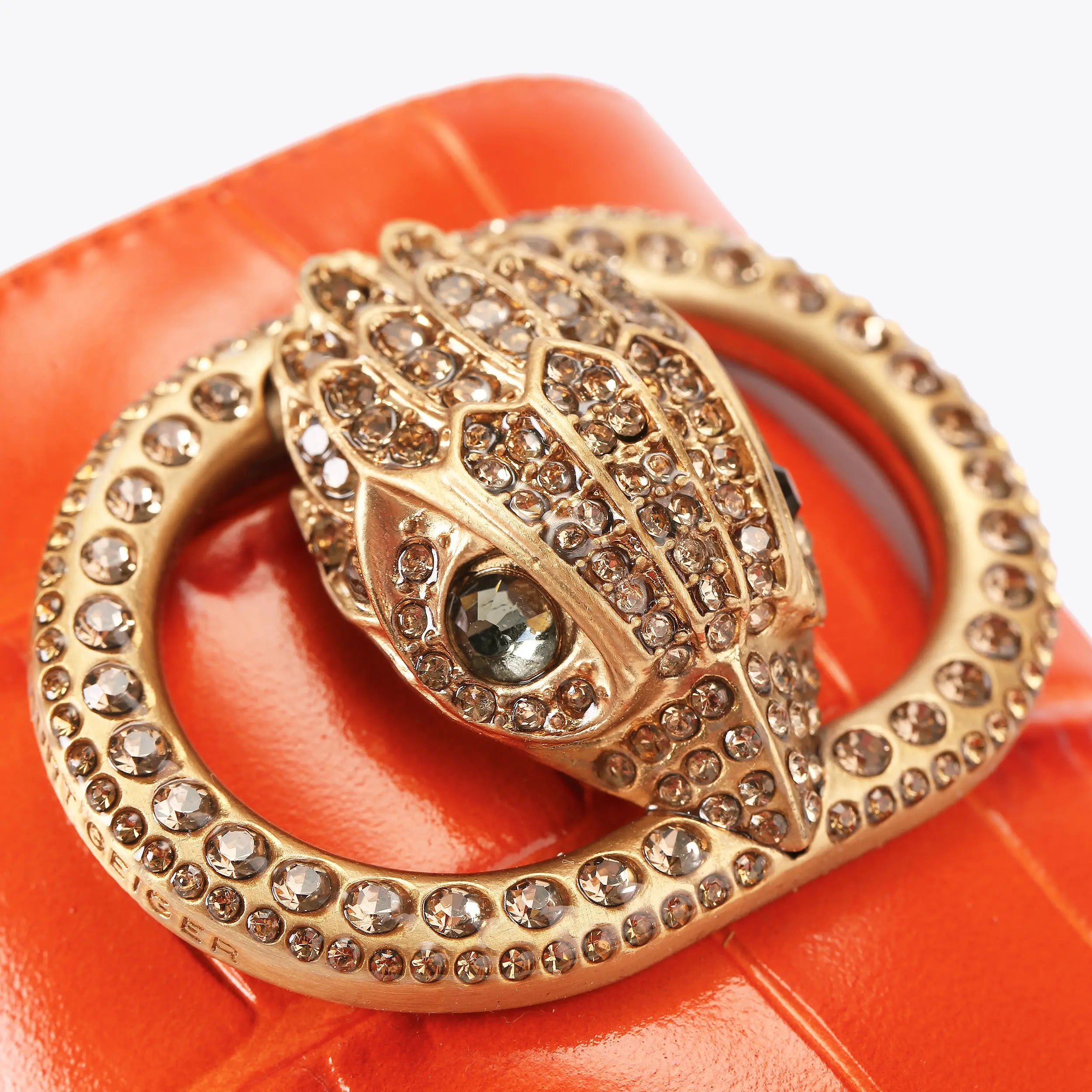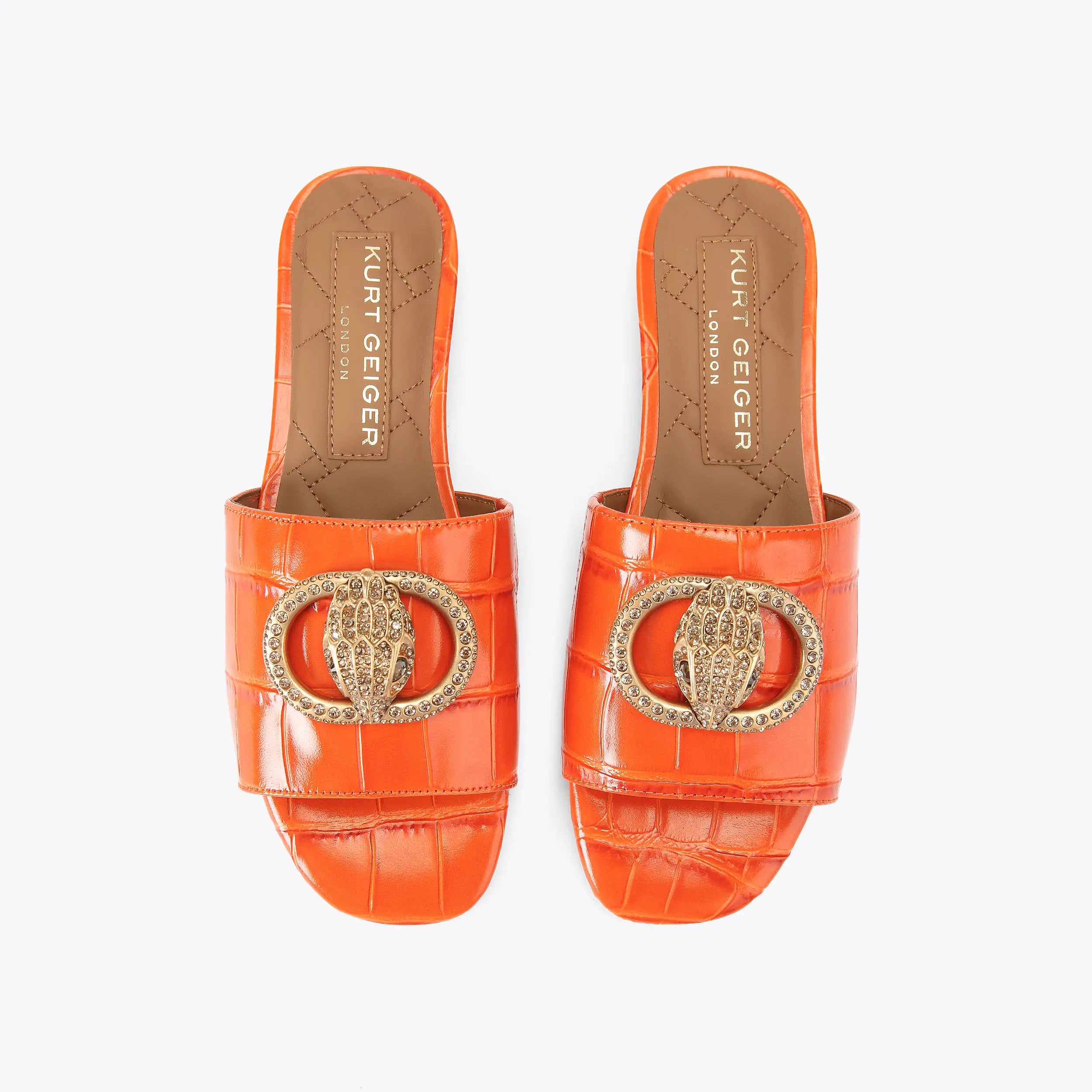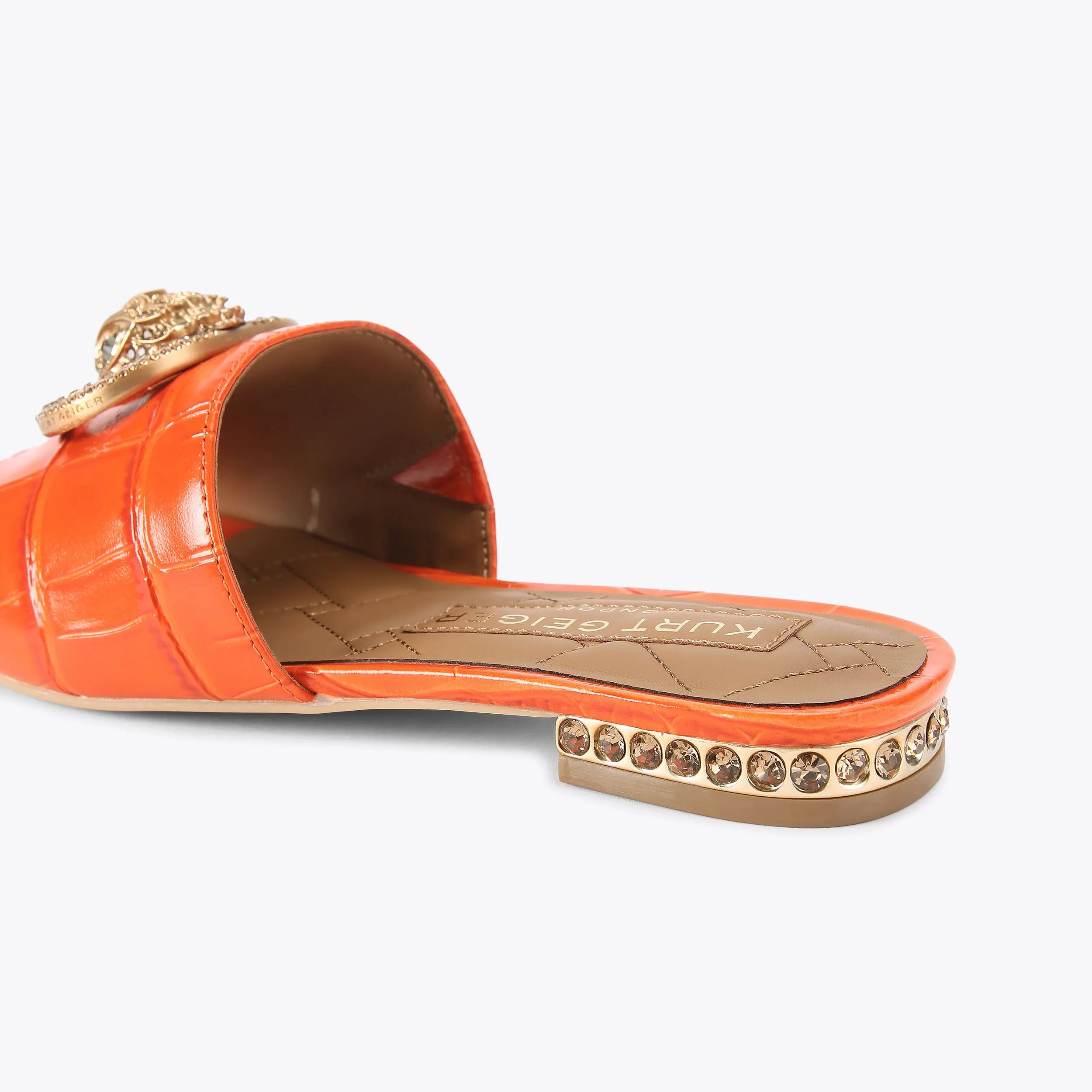 This Chelsea Flat Sandal is a slip-on style with orange croc embossed strap across the foot. There is a brushed gold buckle and eagle head embellished with crystal on top of the toe strap. The low heel is also embellished with crystals.