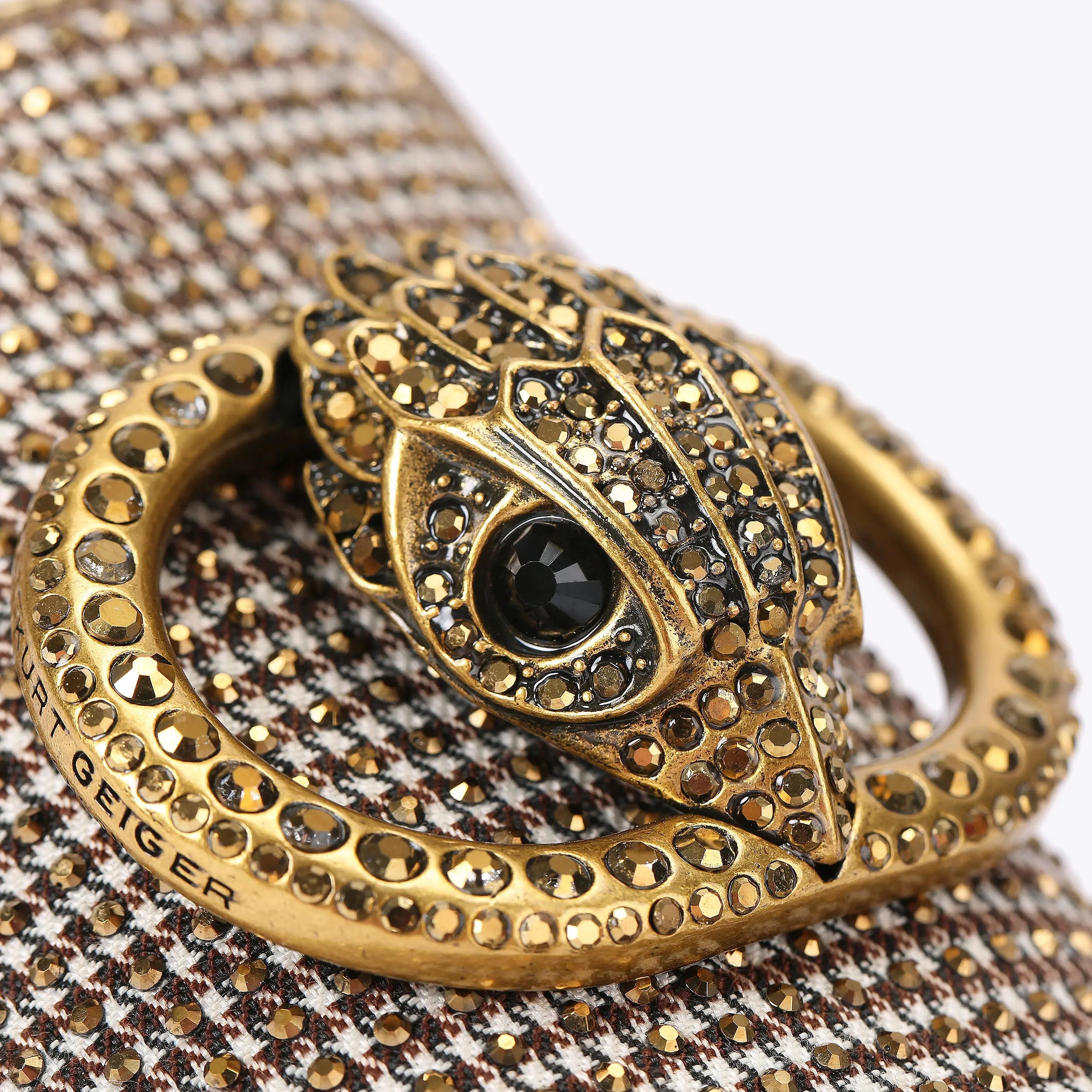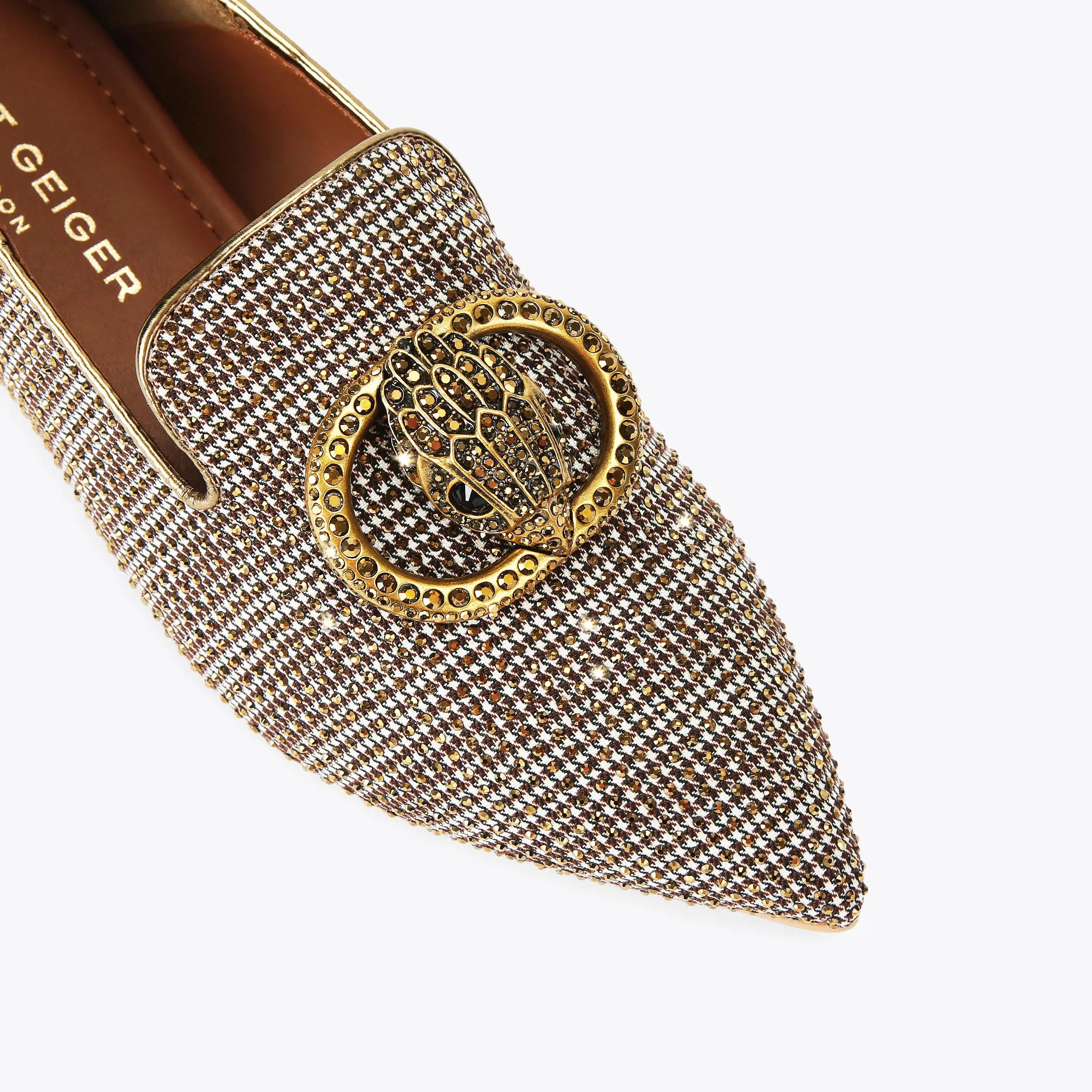 The Chelsea Point Slip On is a slip on shoe crafted from beige houndstooth fabric embellished with crystals. There is a crystal embellished antiqued brass oval trim with central eagle head sat upon the toe.