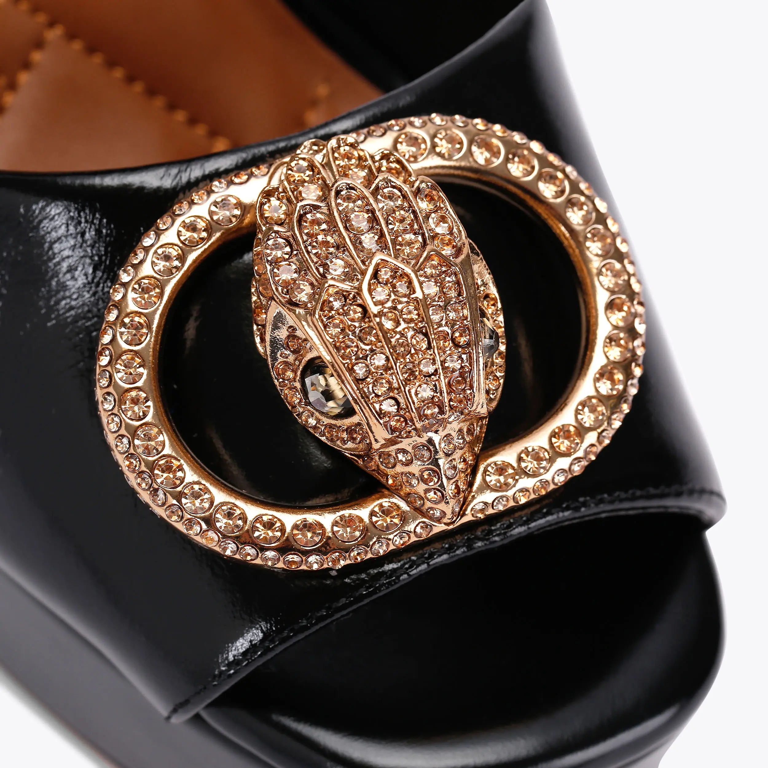 This pair of Chelsea Platform Sandals feature a patent black leather upper. There is a crystal embellished shiny brass oval trim with central eagle head sat upon the toe strap.