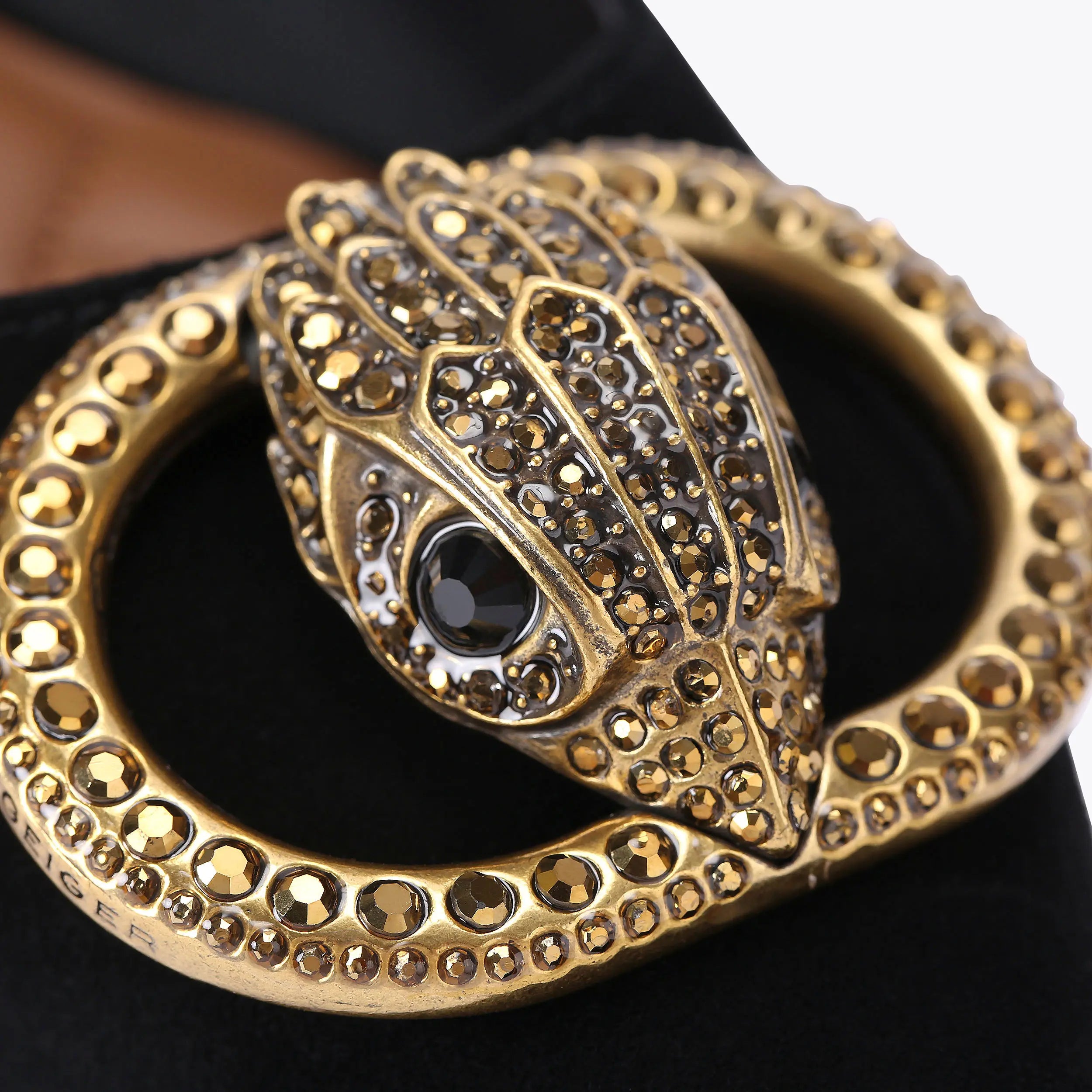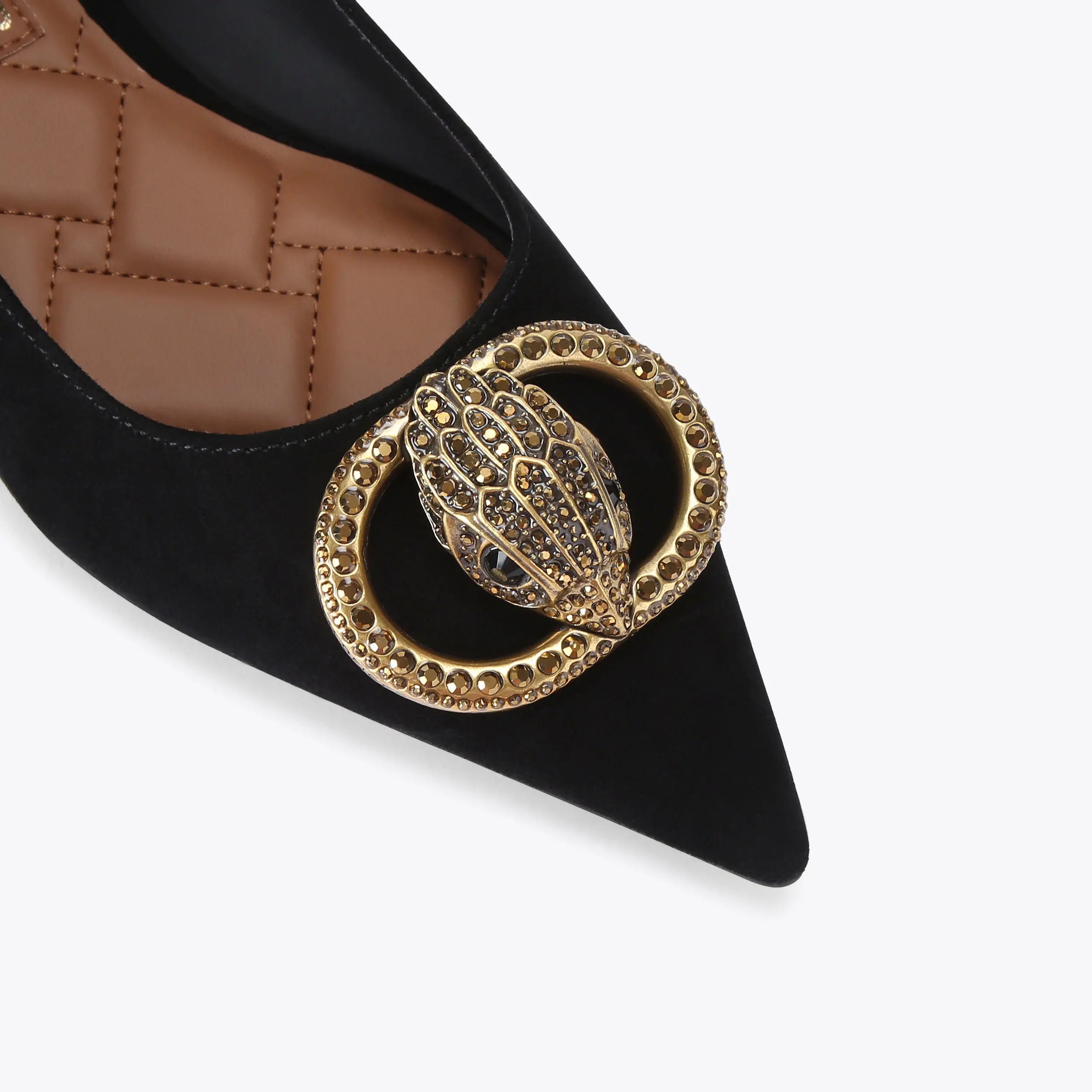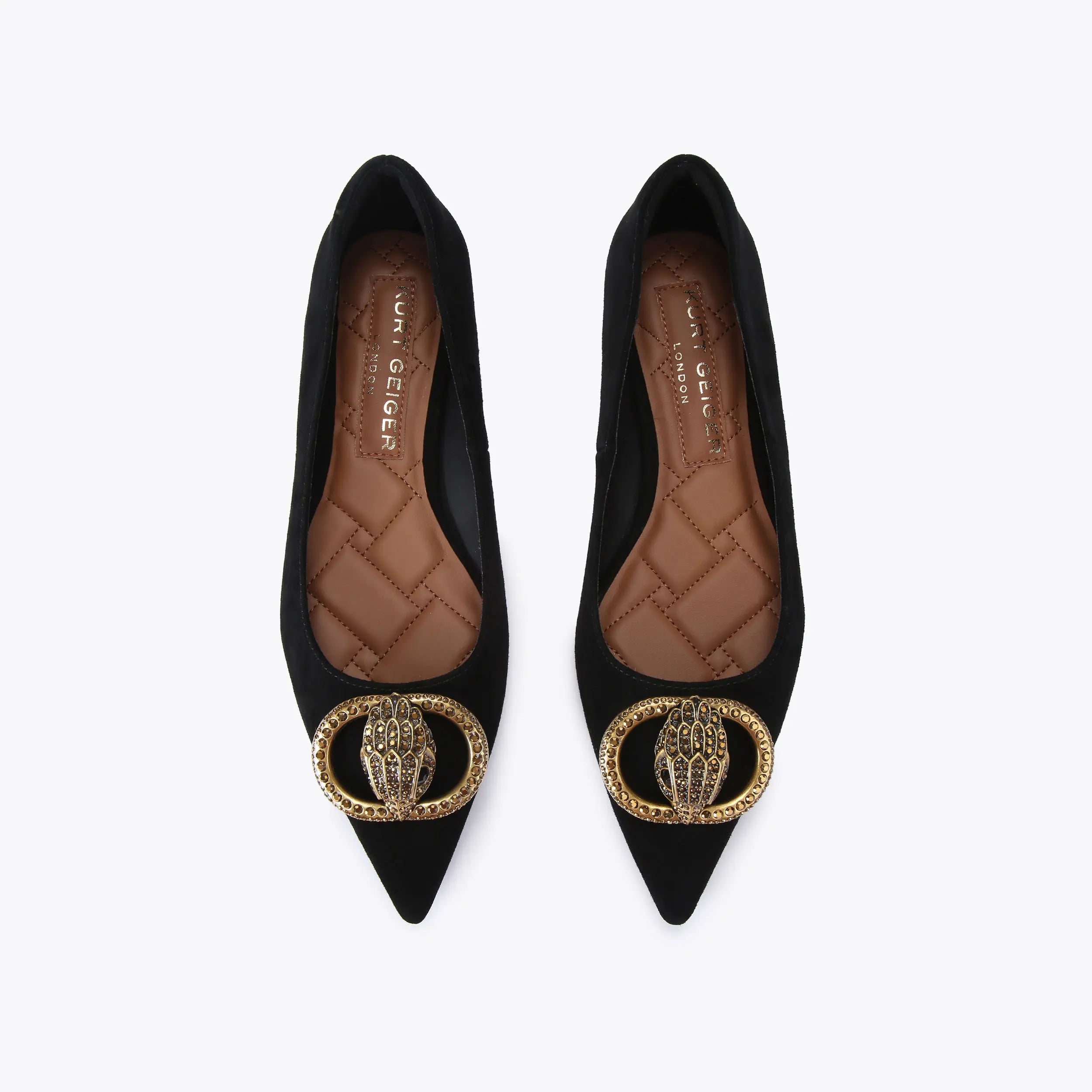 The Chelsea Point Flat features a black suede upper with pointed toe. There is a crystal embellished antiqued brass oval trim with central eagle head sat upon the toe.