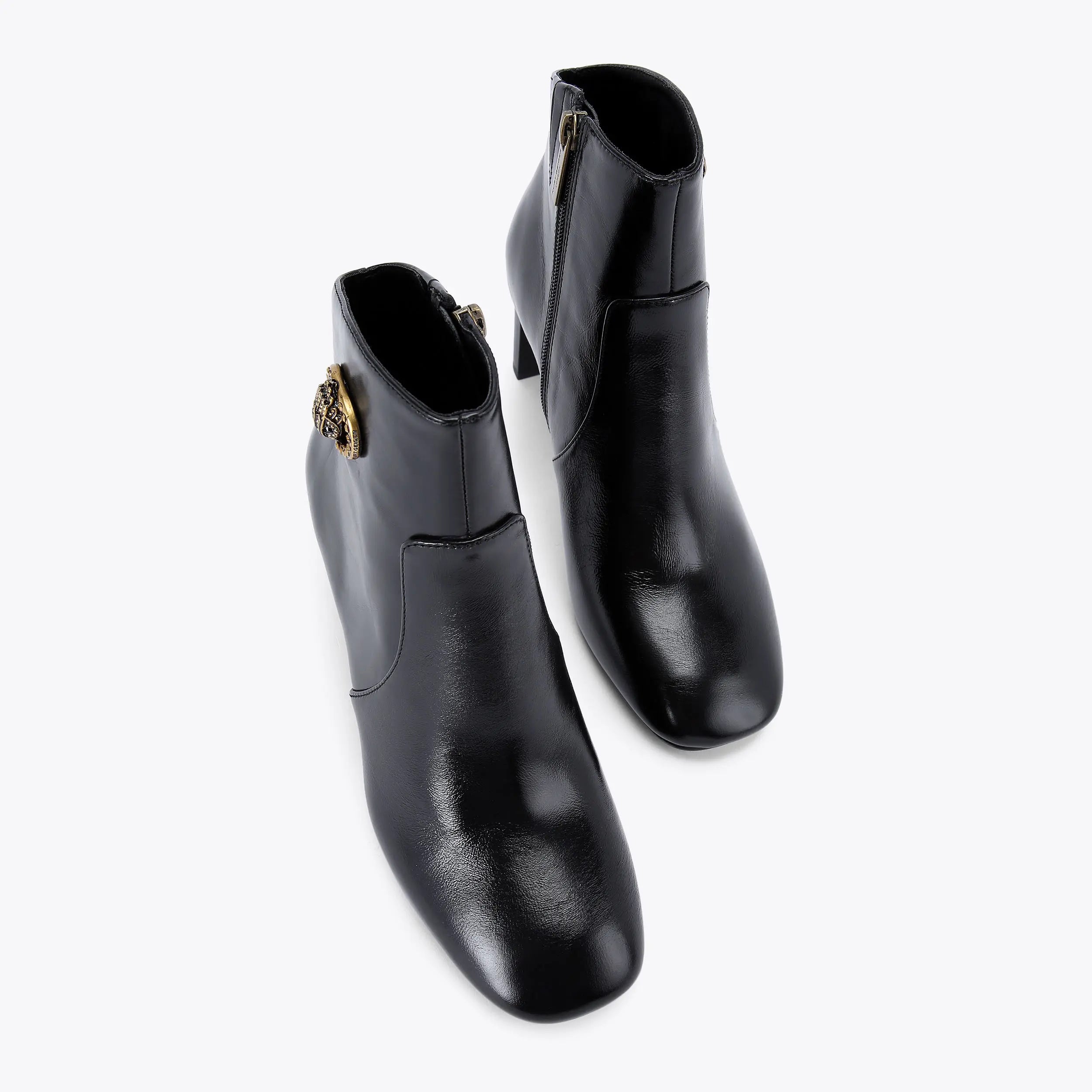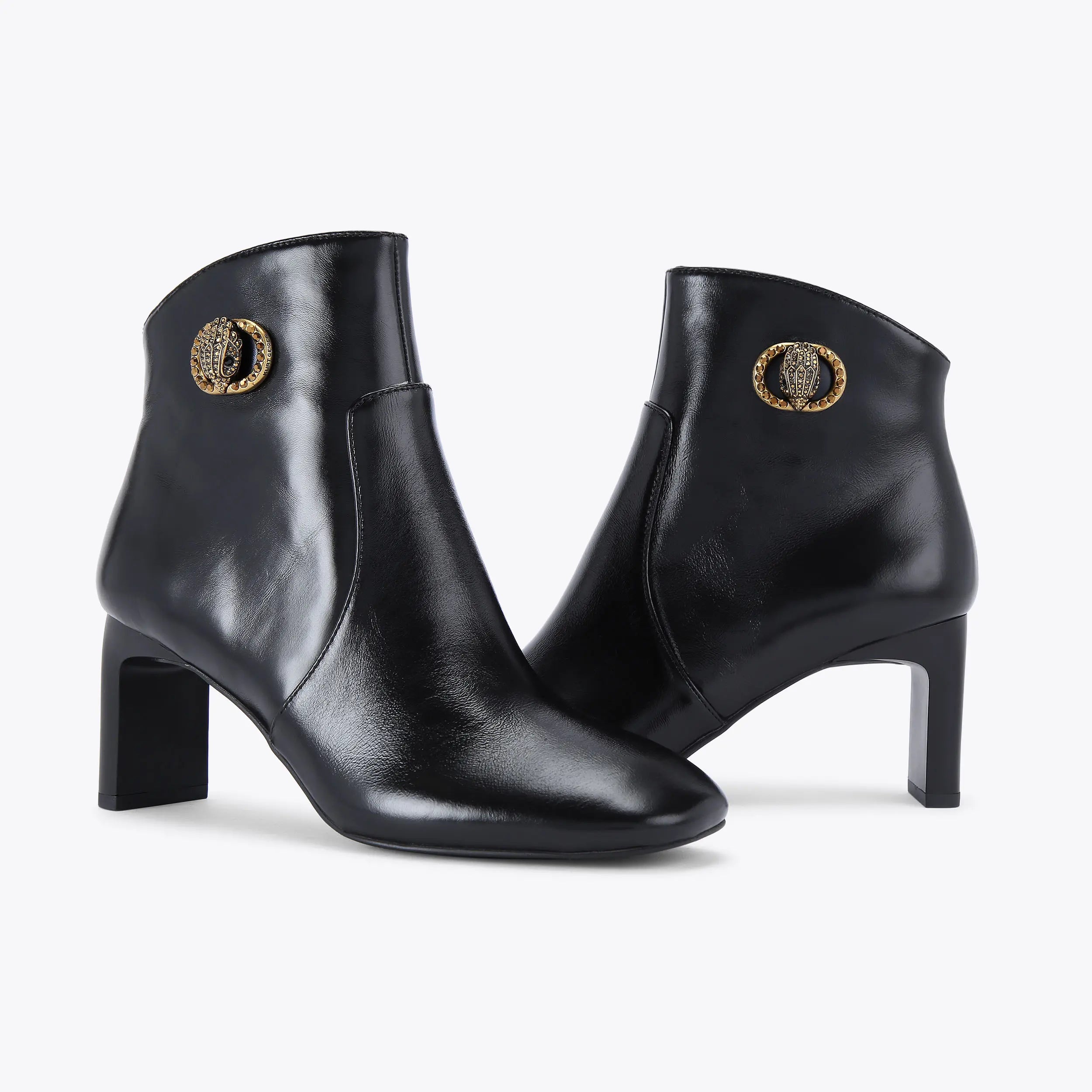 This Chelsea Square Toe Bootie is crafted from a black leather. There is an antiqued brass oval with eagle head that is embellished with crystals sat on the outer side of the ankle.