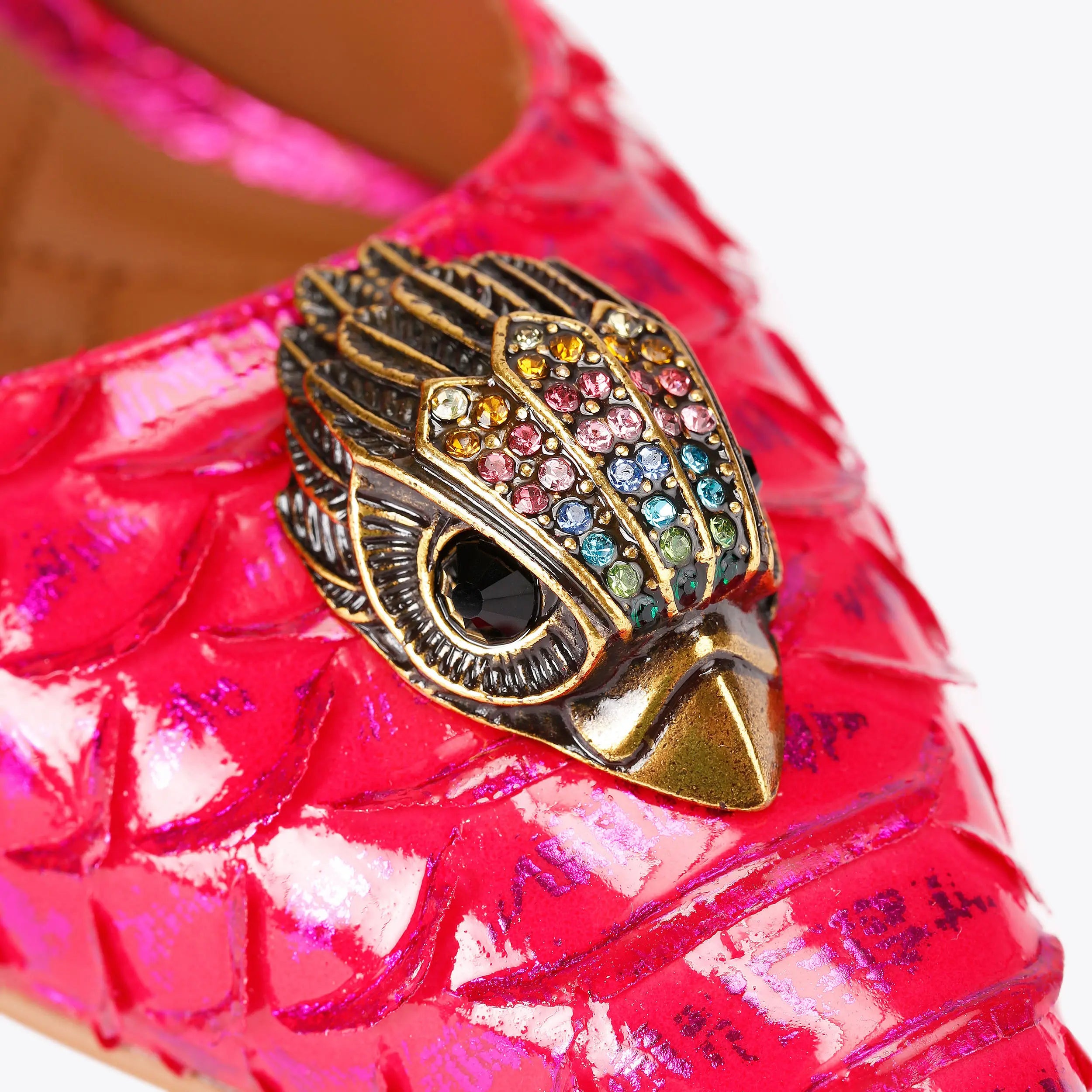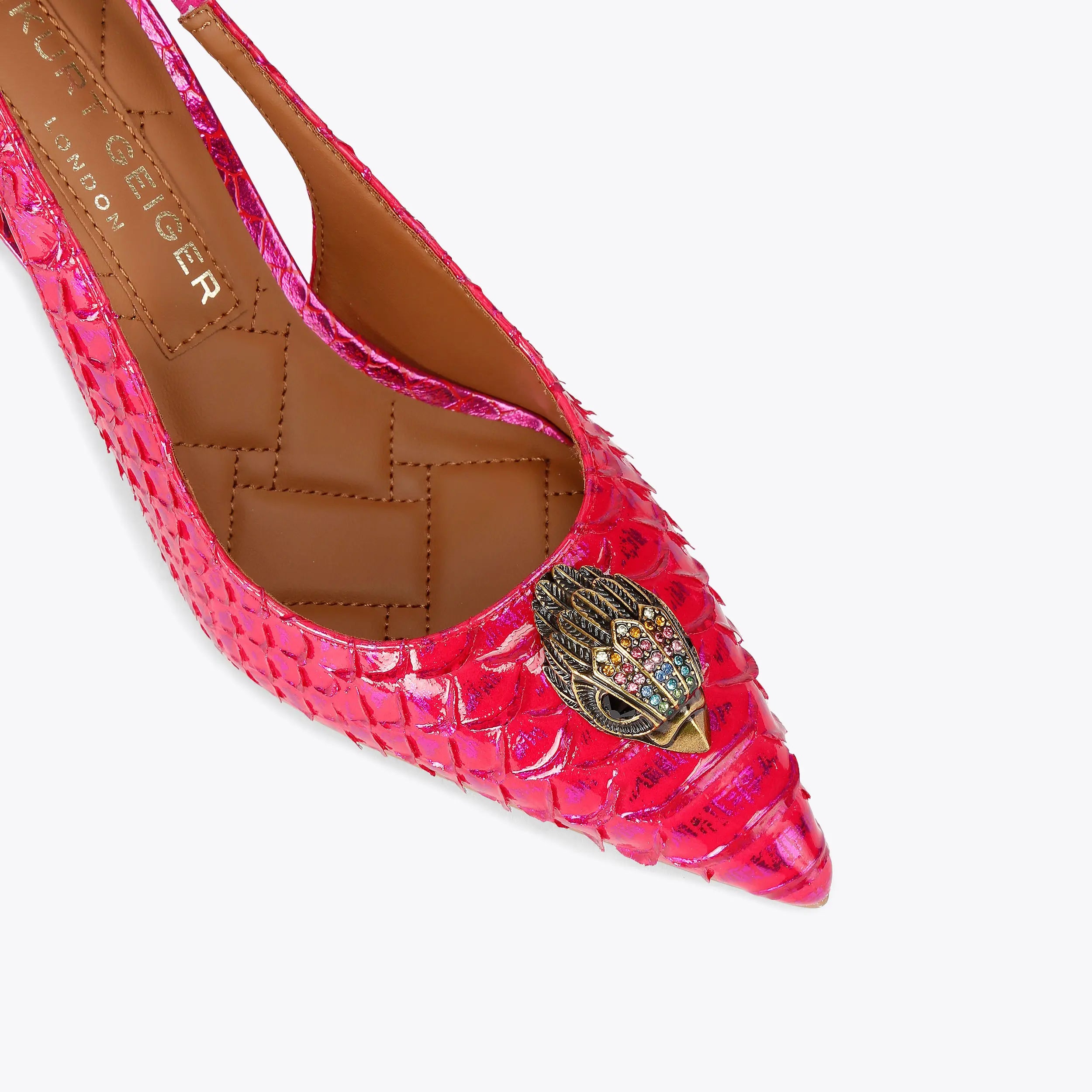 This pair of snake embossed Belgravia high heels are a slingback style with pointed toe. There is an antiqued brass eagle head with crystal embellishment sat on the pointed toe.