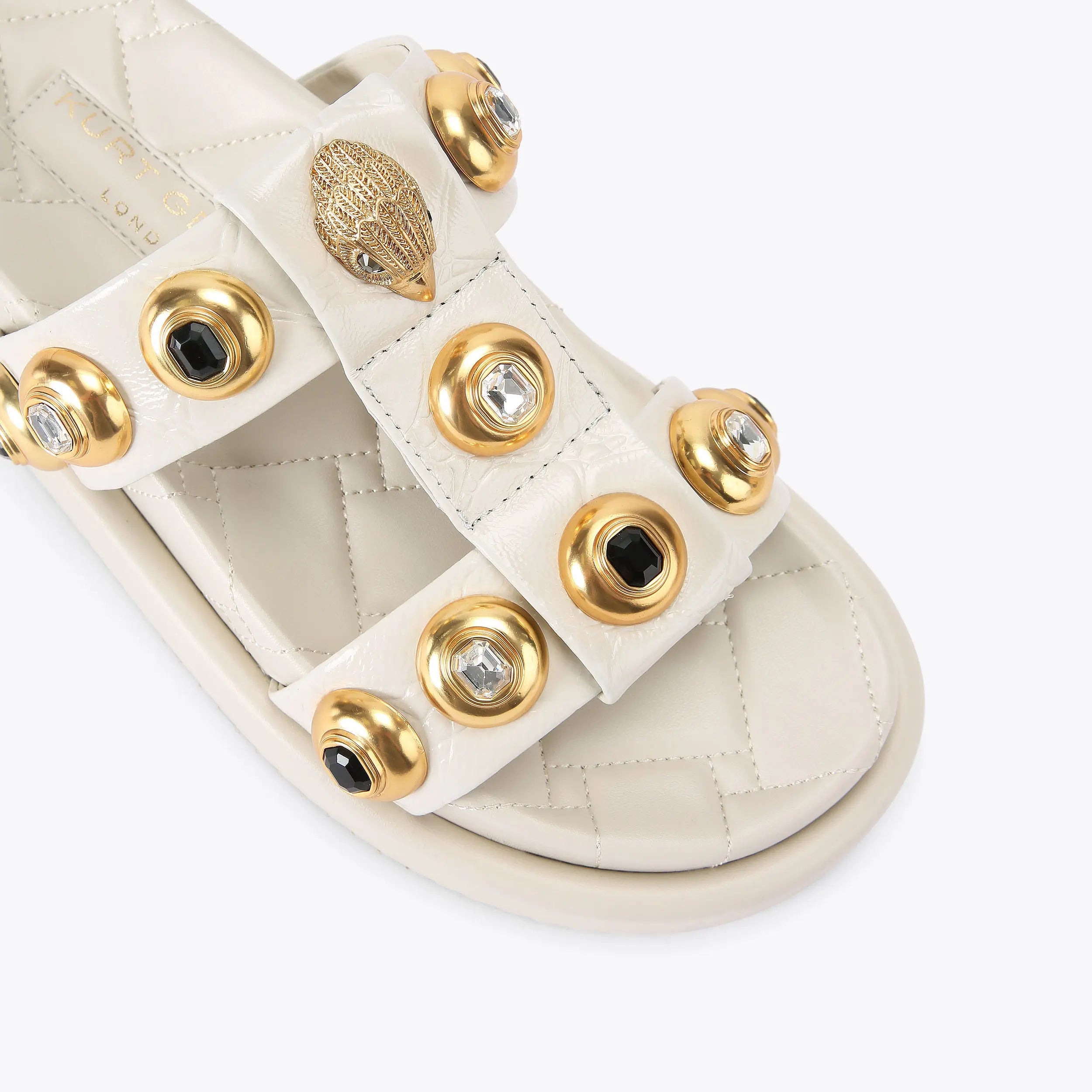 The Orson Multi Stud sandal features a bone crinkled upper with large antiqued brass studs that are each embellished with black and clear crystals. There is a brushed gold eagle head at the centre of the straps.