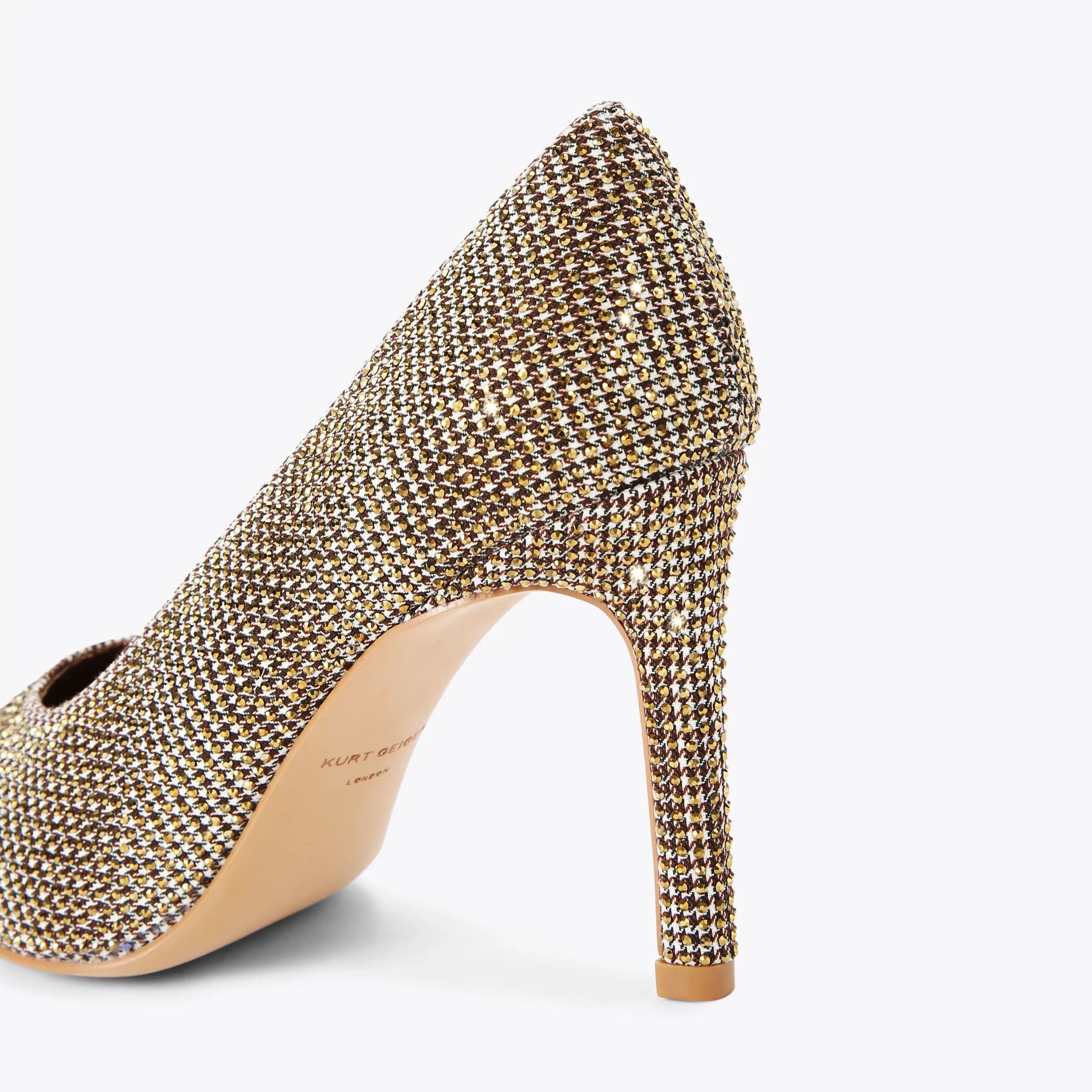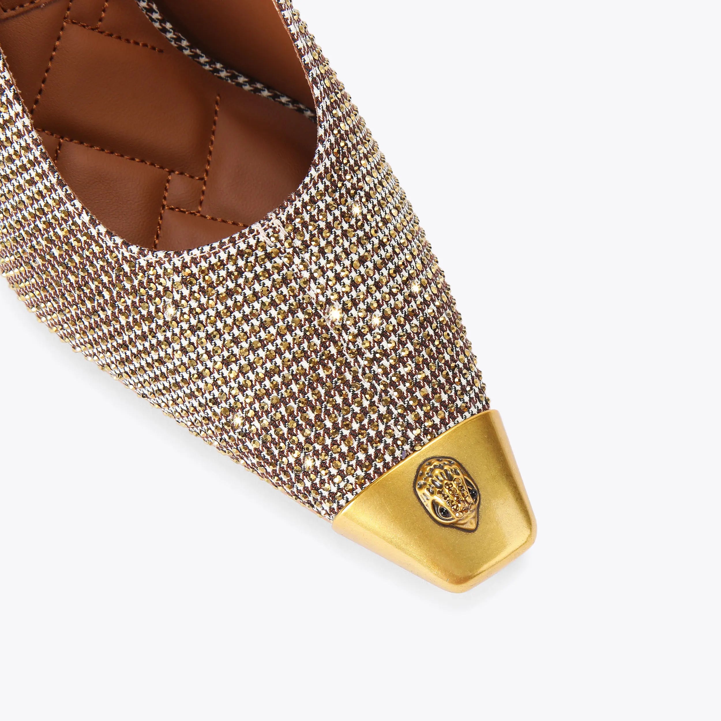 This Regent Court heel features a beige houndstooth upper with antiqued brass toe cap. There is also an antiqued brass eagle head with crystals and beaded eyes sat on top of the toe.