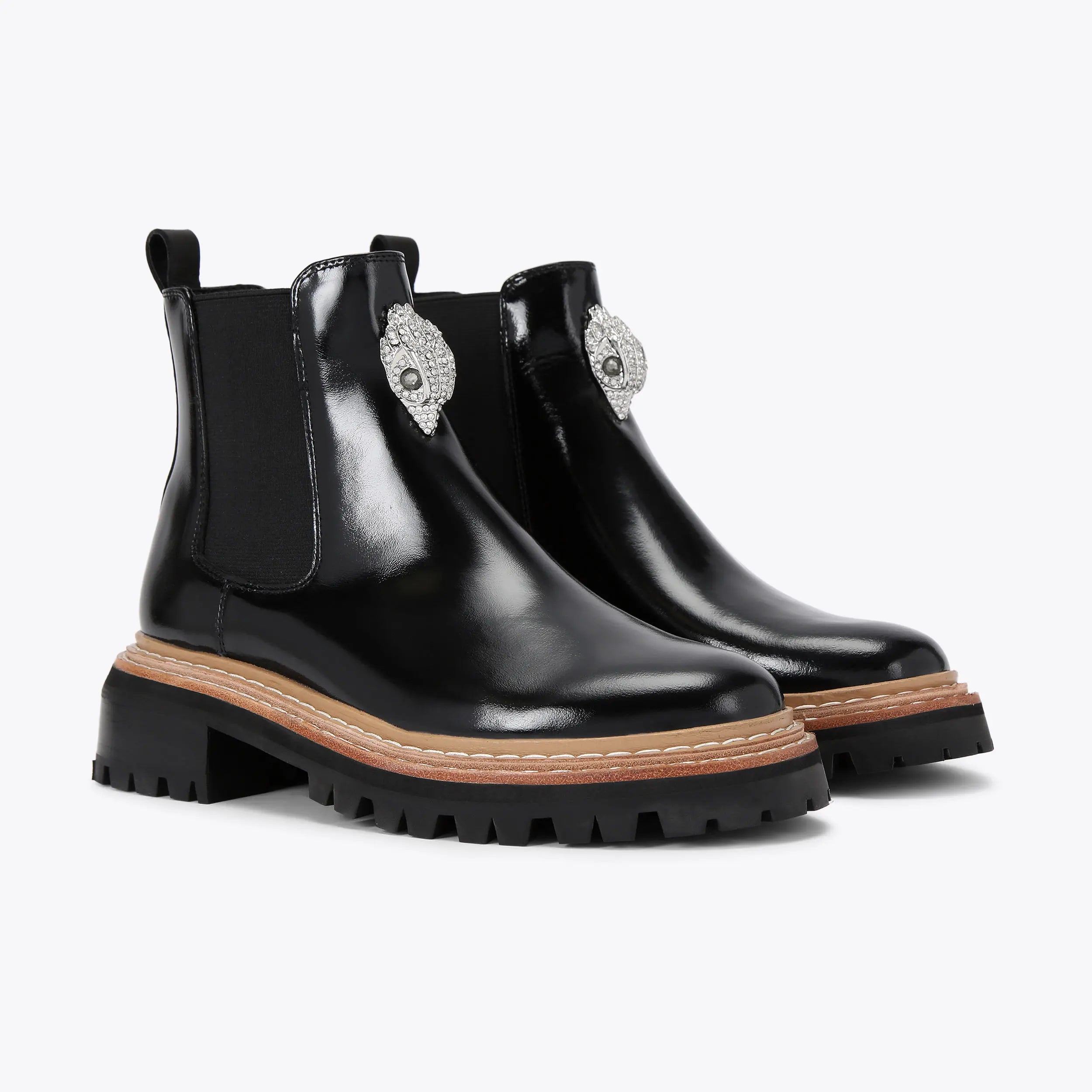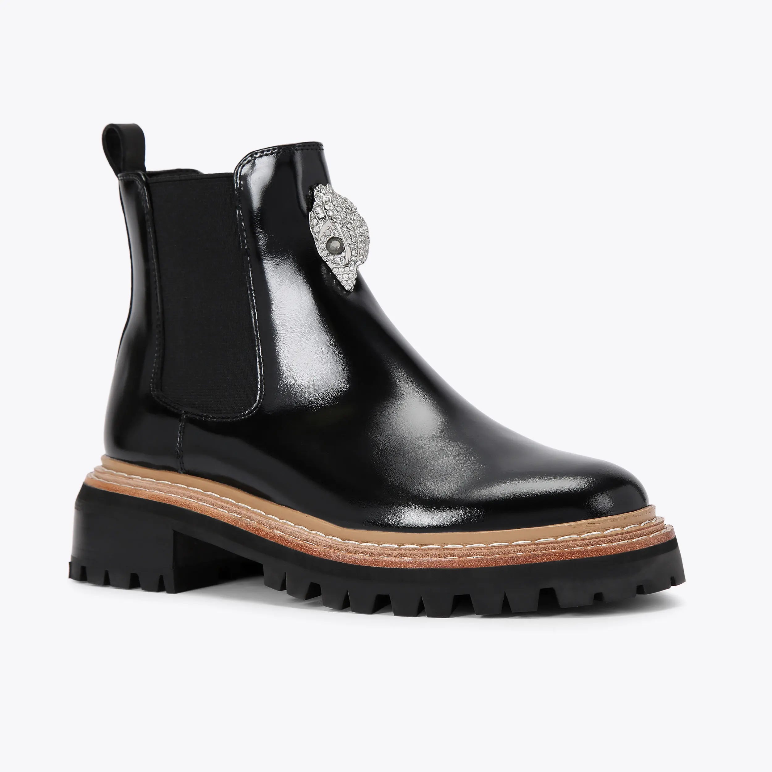 This Belgravia Ankle Boot features a patent black leather upper. There is a silver eagle head embellished with crystals on the front of the elasticated ankle.