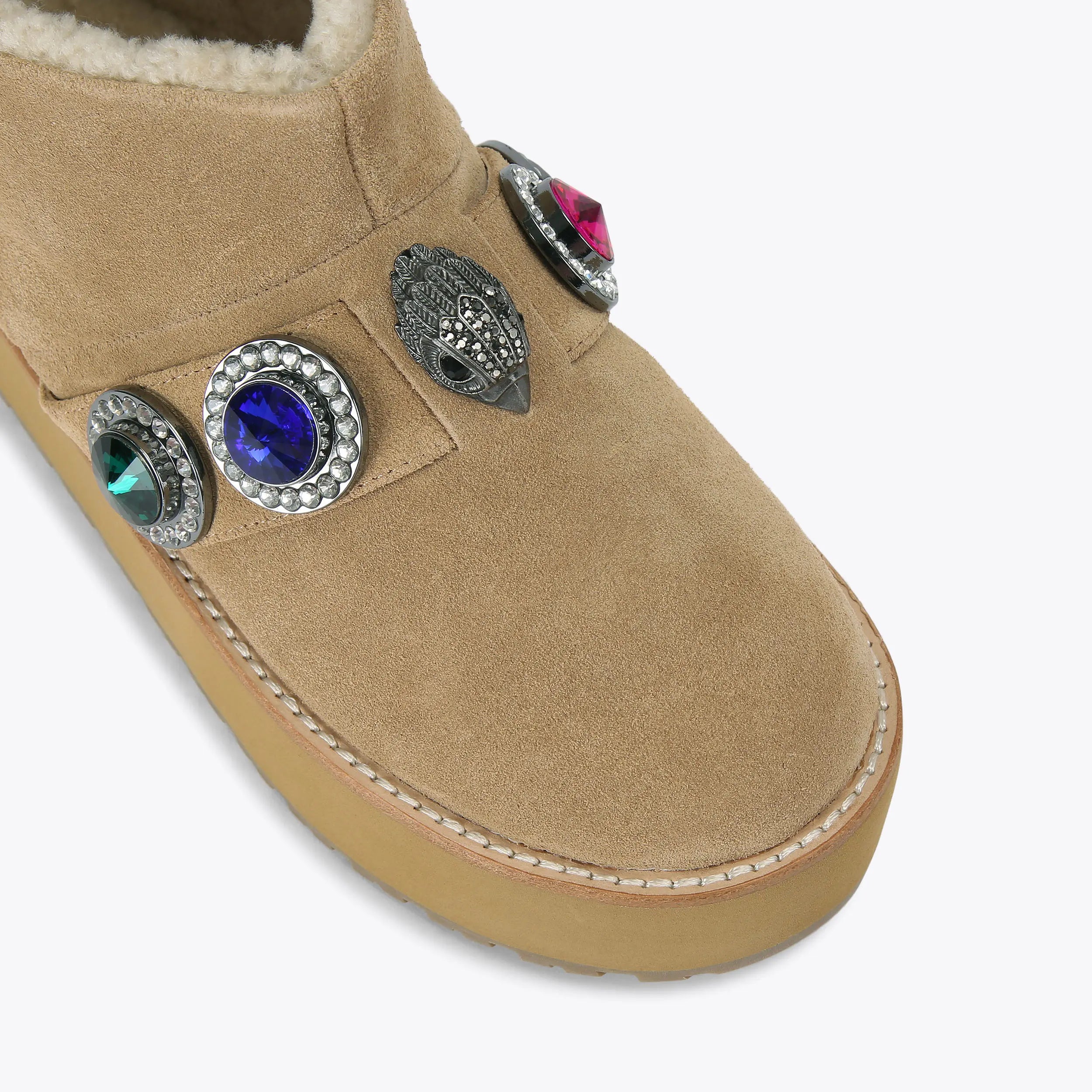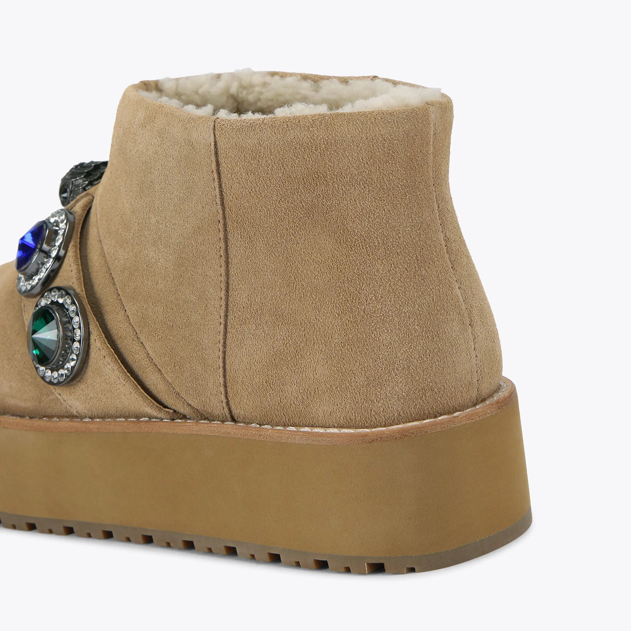 This Octavia Teddy Bootie is crafted from a soft beige suede. There is a statement strap going across the ankle which features multi-color crystals. The sole is pumped up for extra impact.