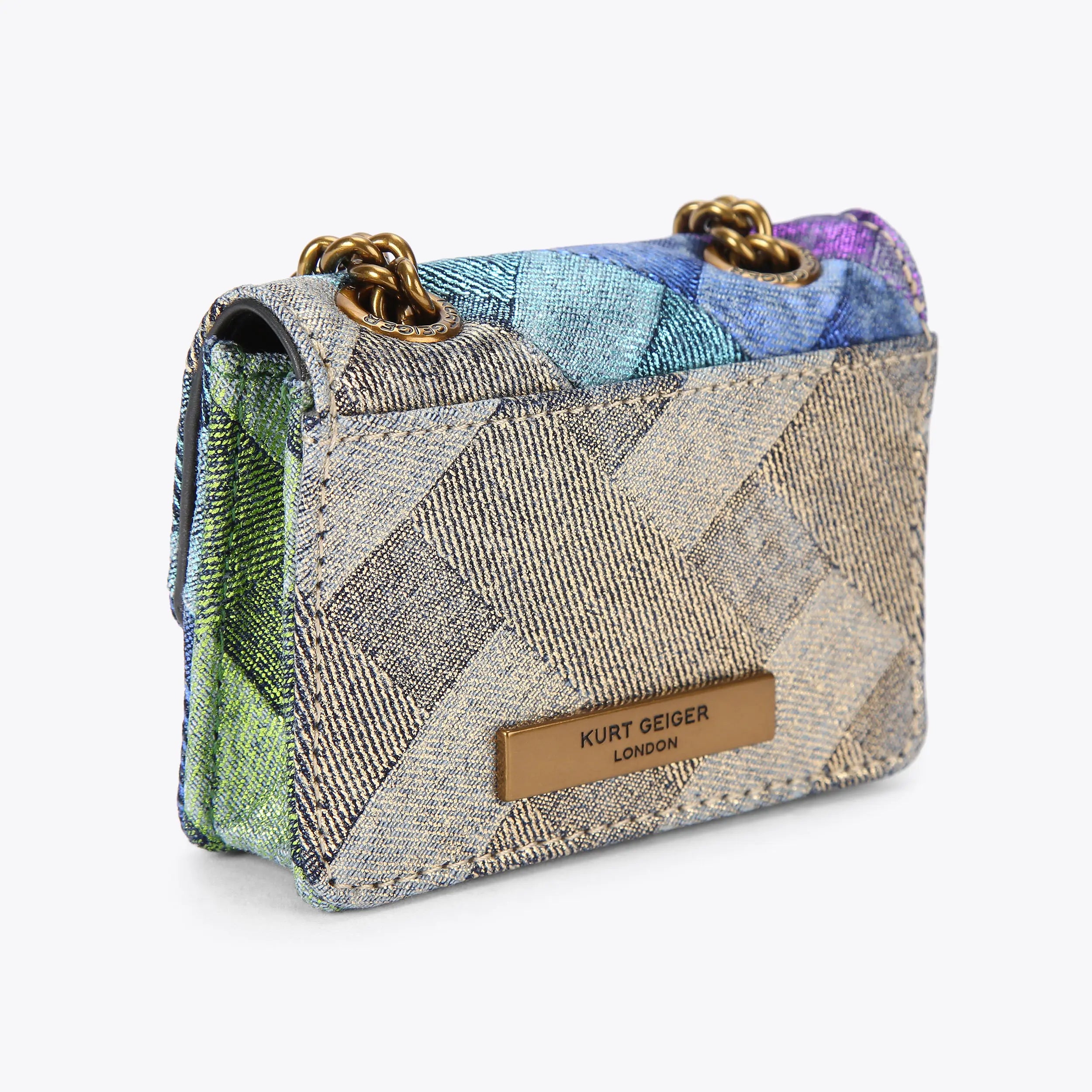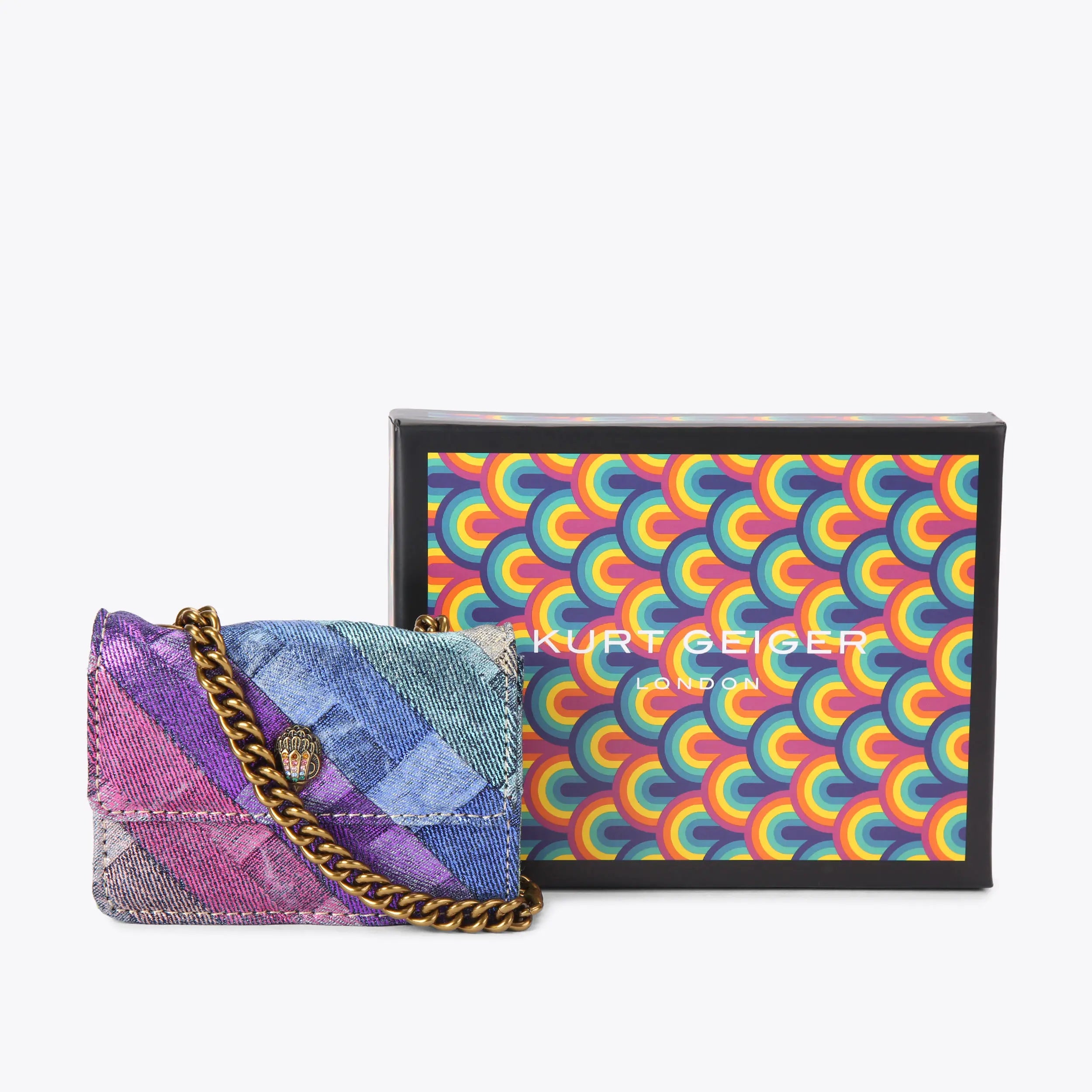 The Micro Kensington Purse is crafted from a woven rainbow denim fabric with a metallic gold coating. The antiqued brass eagle head features rainbow crystals on the front flap.