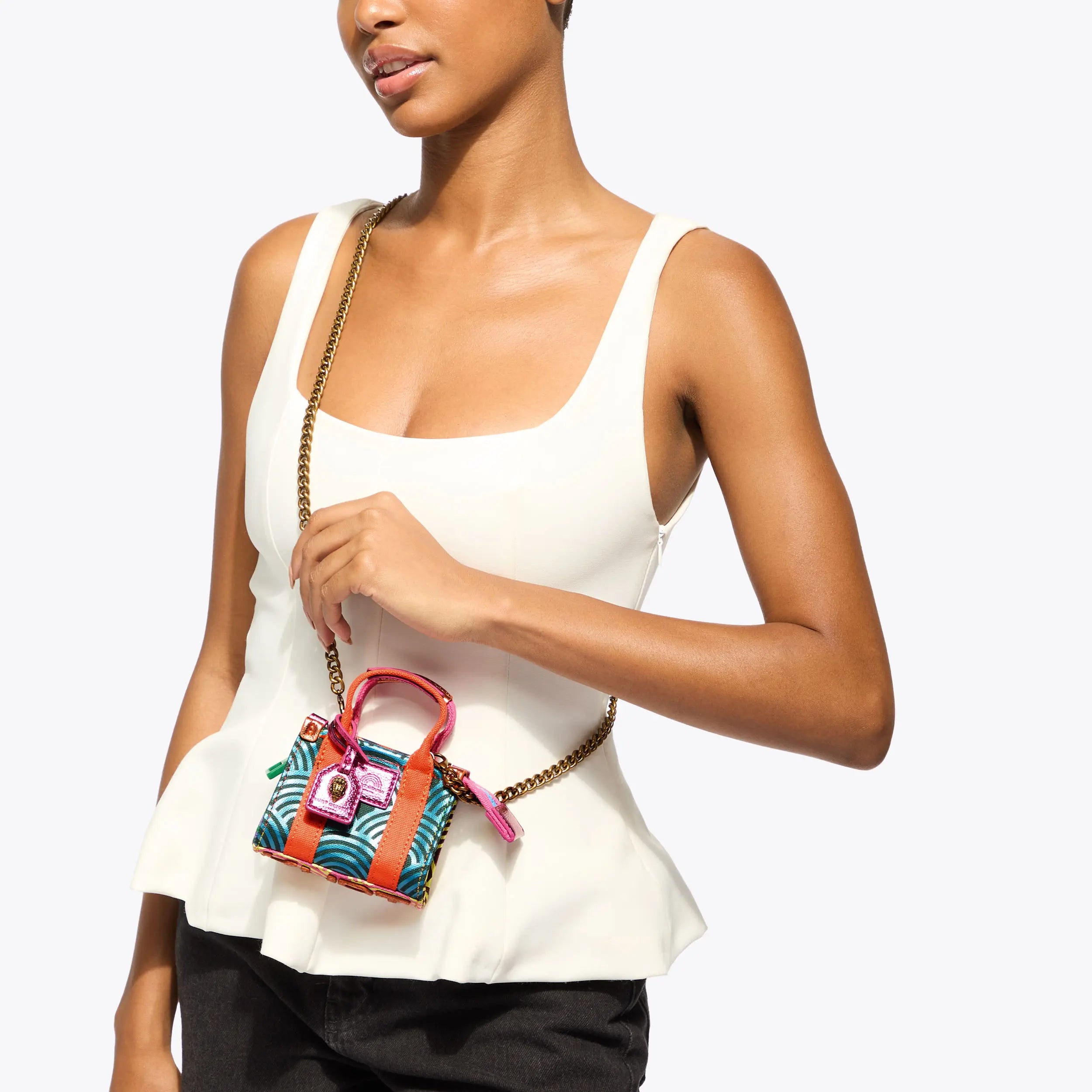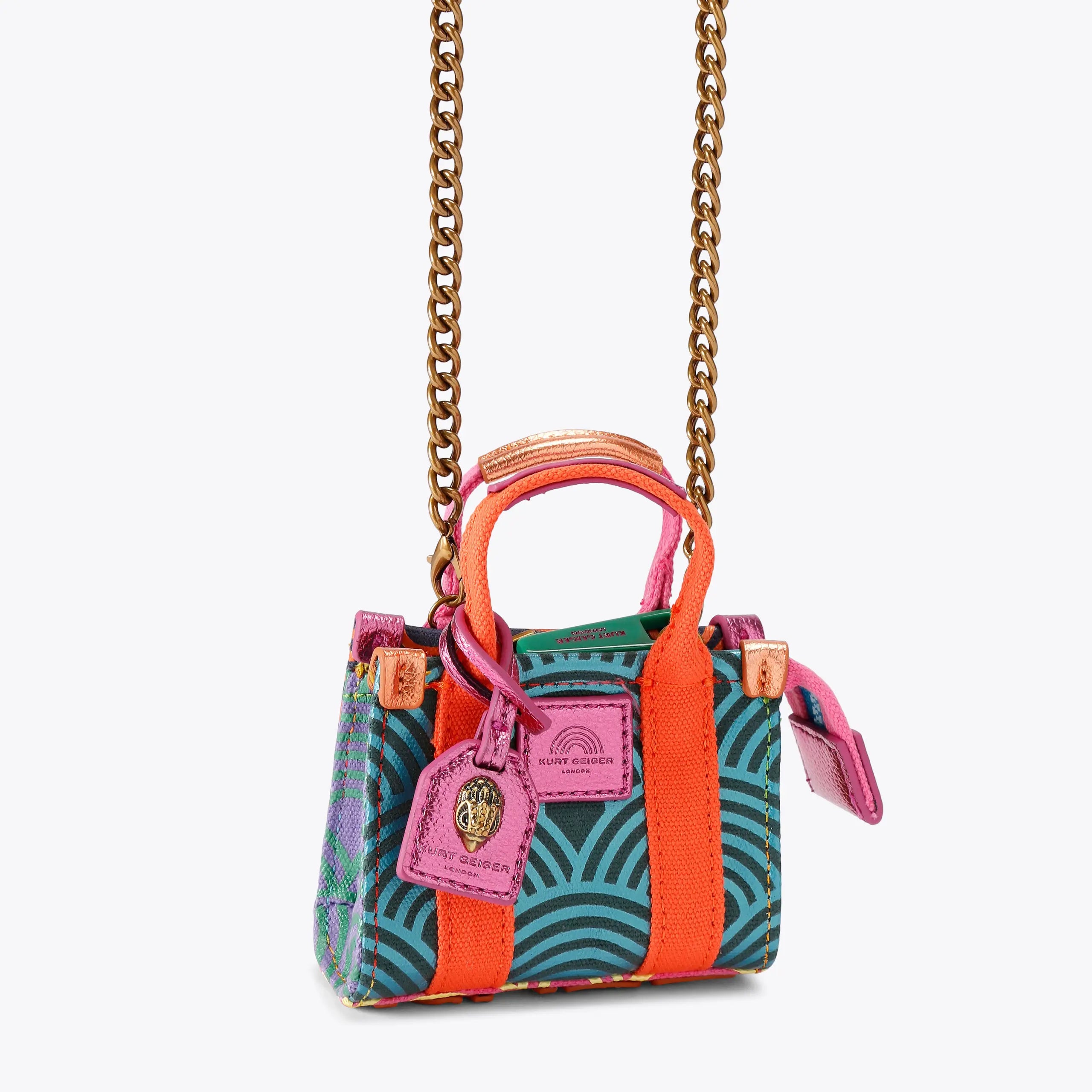 This Micro Southbank Tote features an enlarged version of the rainbow print seen across the Southbank collection. There is a metallic pink tag with antiqued brass eagle head on the luggage tag.