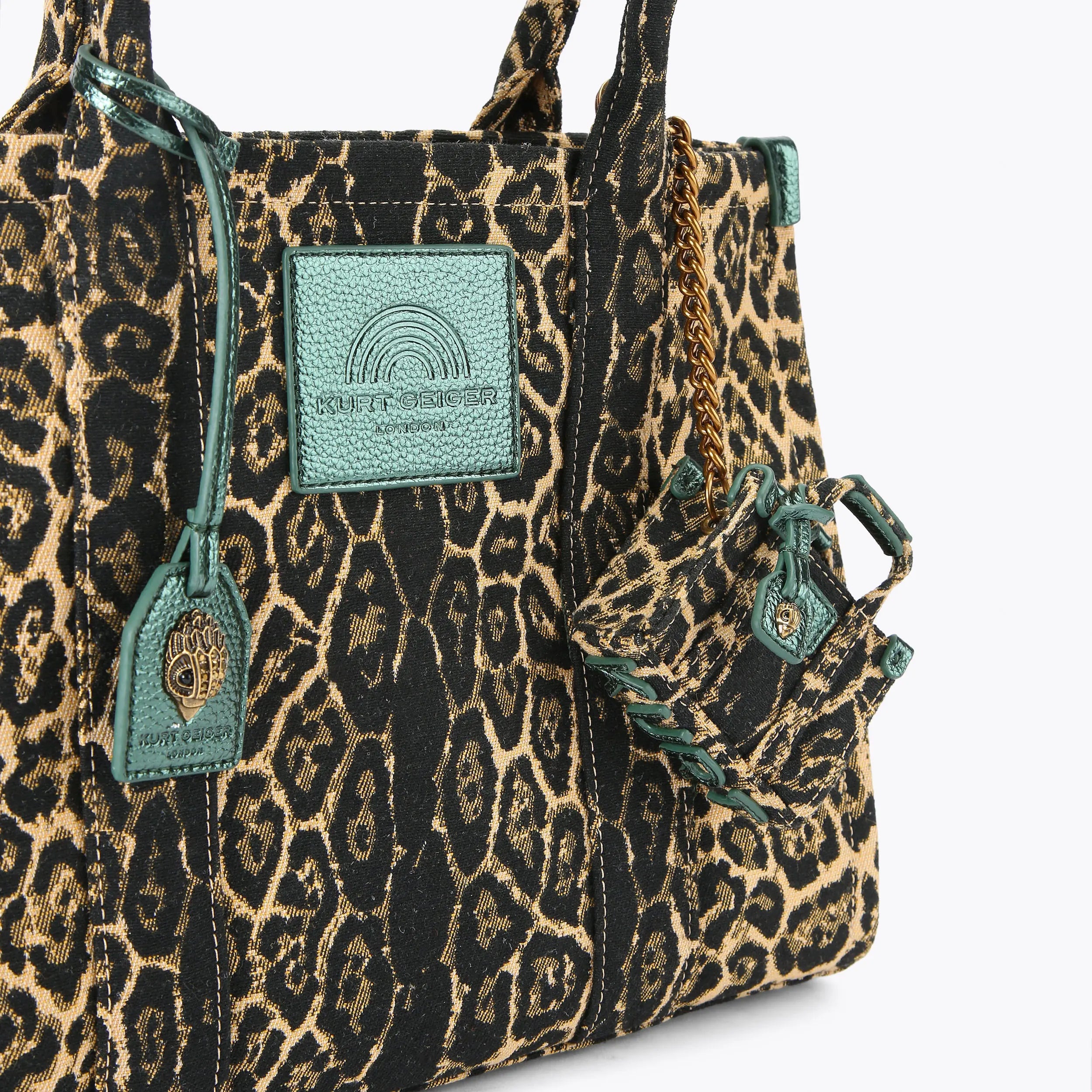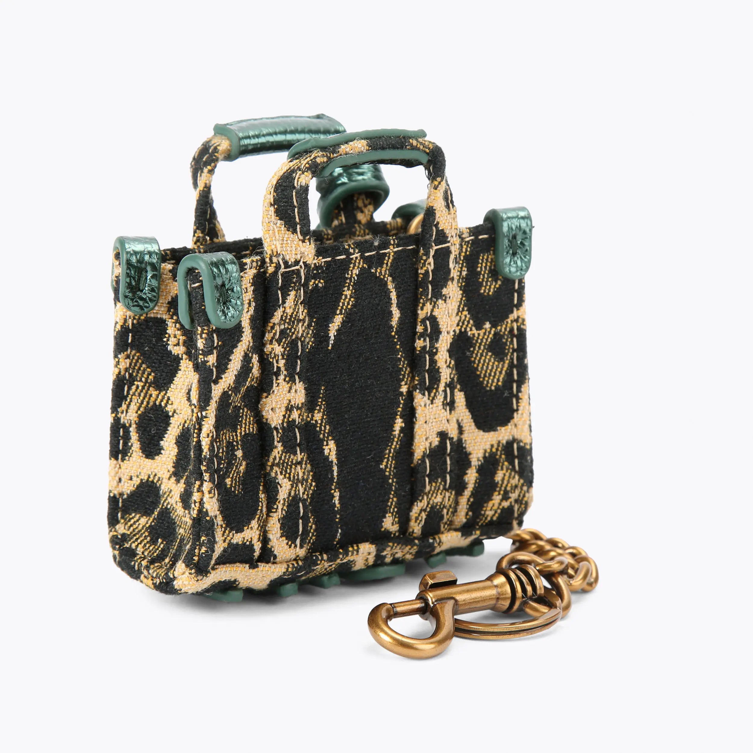 This Southbank Keyring features a leopard printed fabric. There is a metallic pink tag with antiqued silver eagle head attached to the top straps.