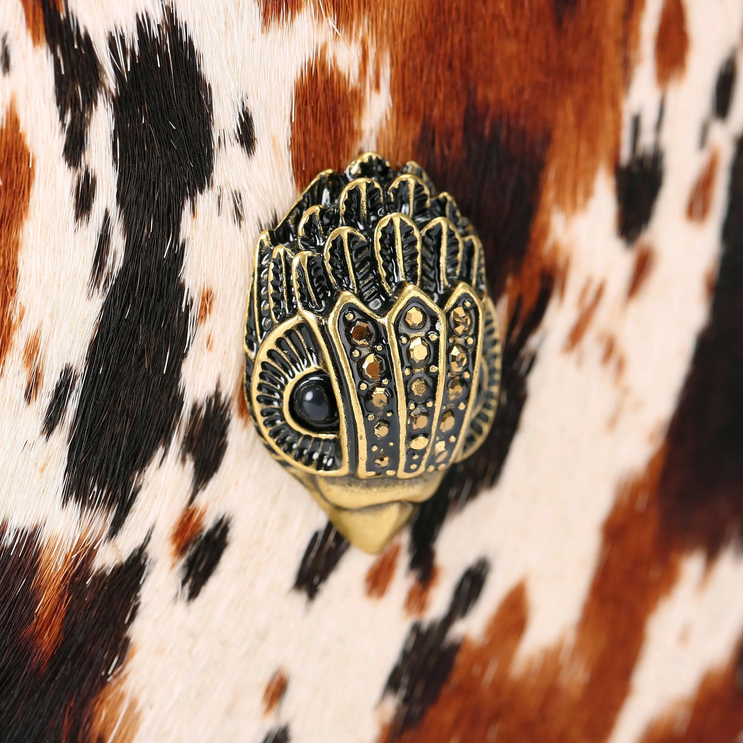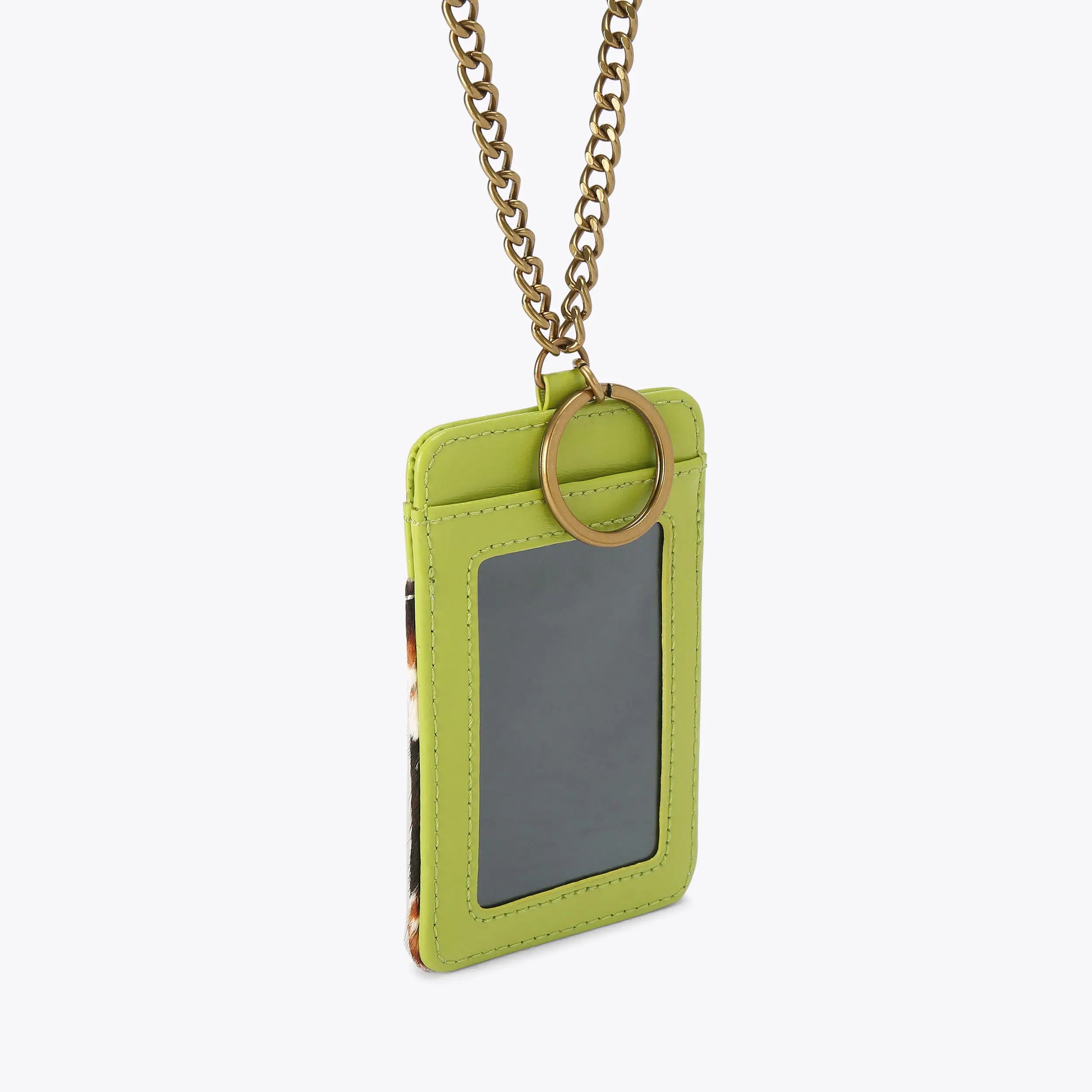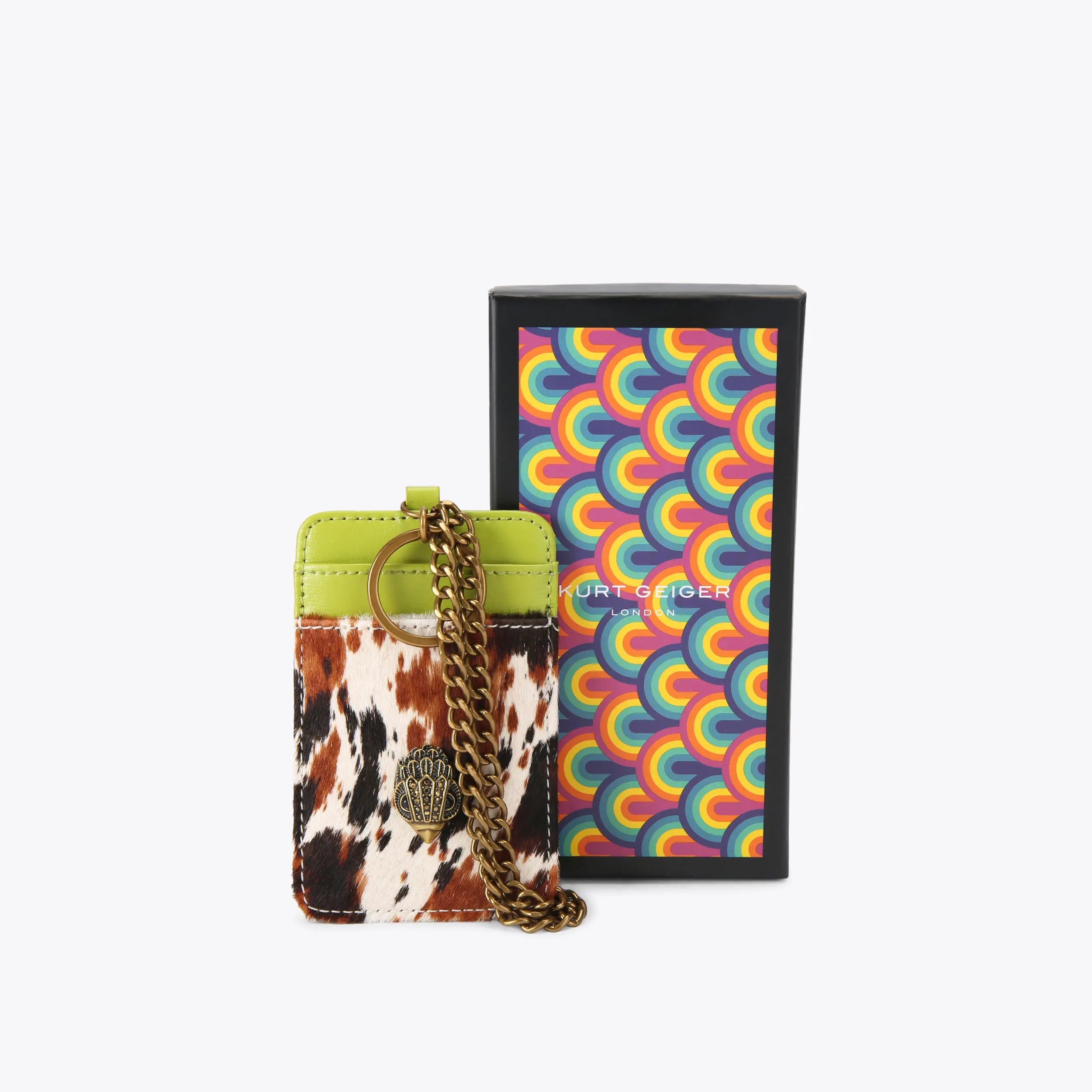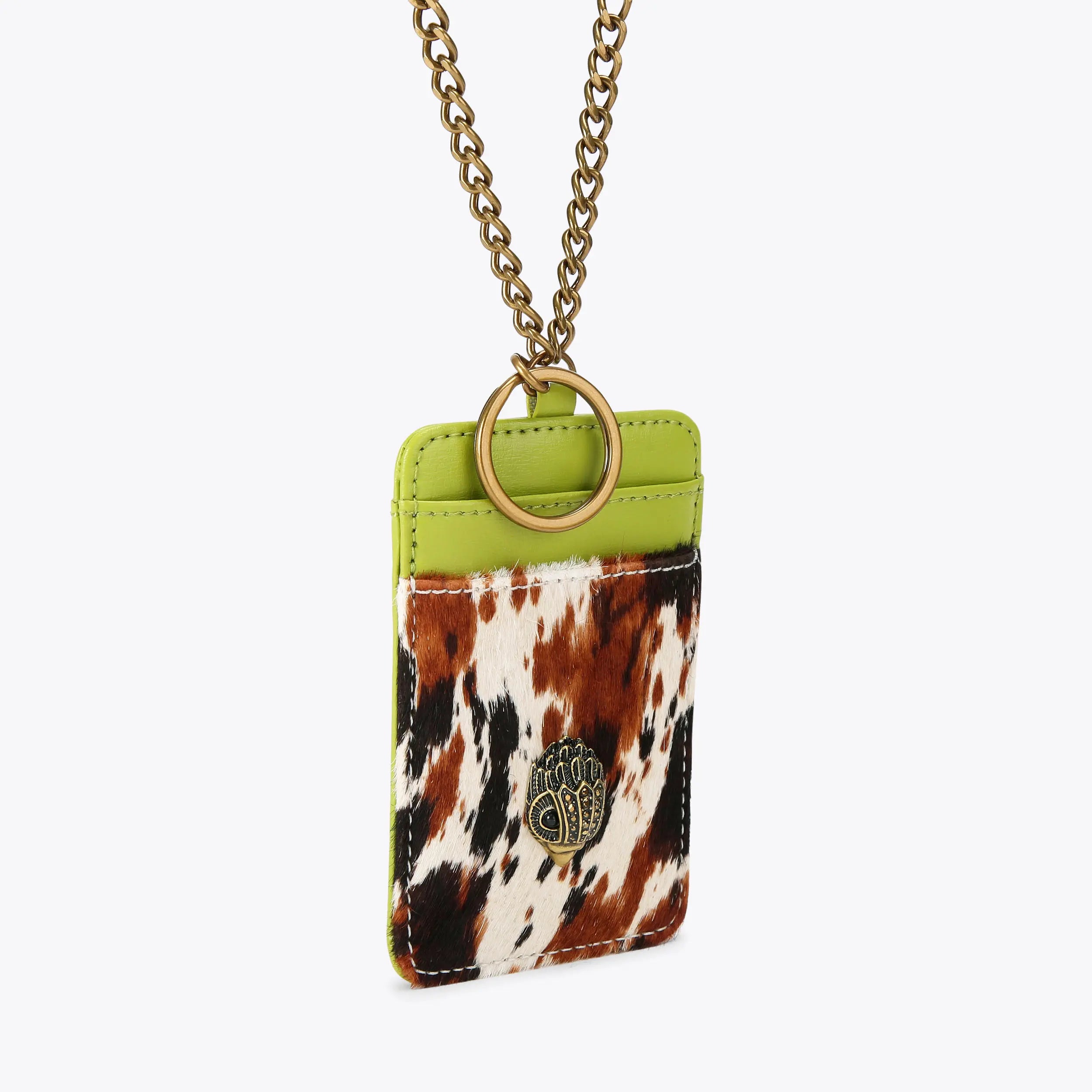 This Bond Lanyard is crafted from a cow print calfhair leather with lime green leather card slots. There is an antiqued brass eagle head on the front above gold foil embossed branding.