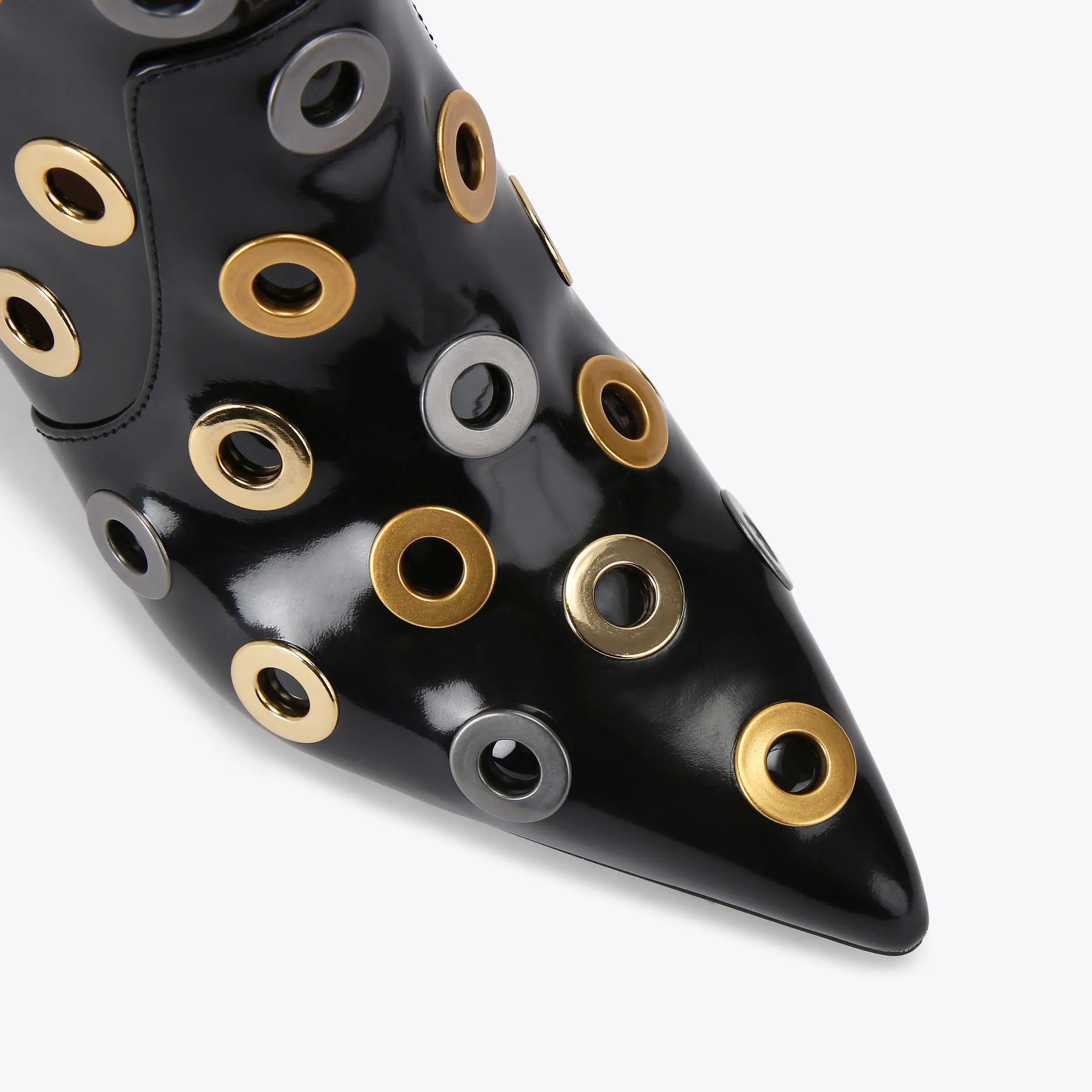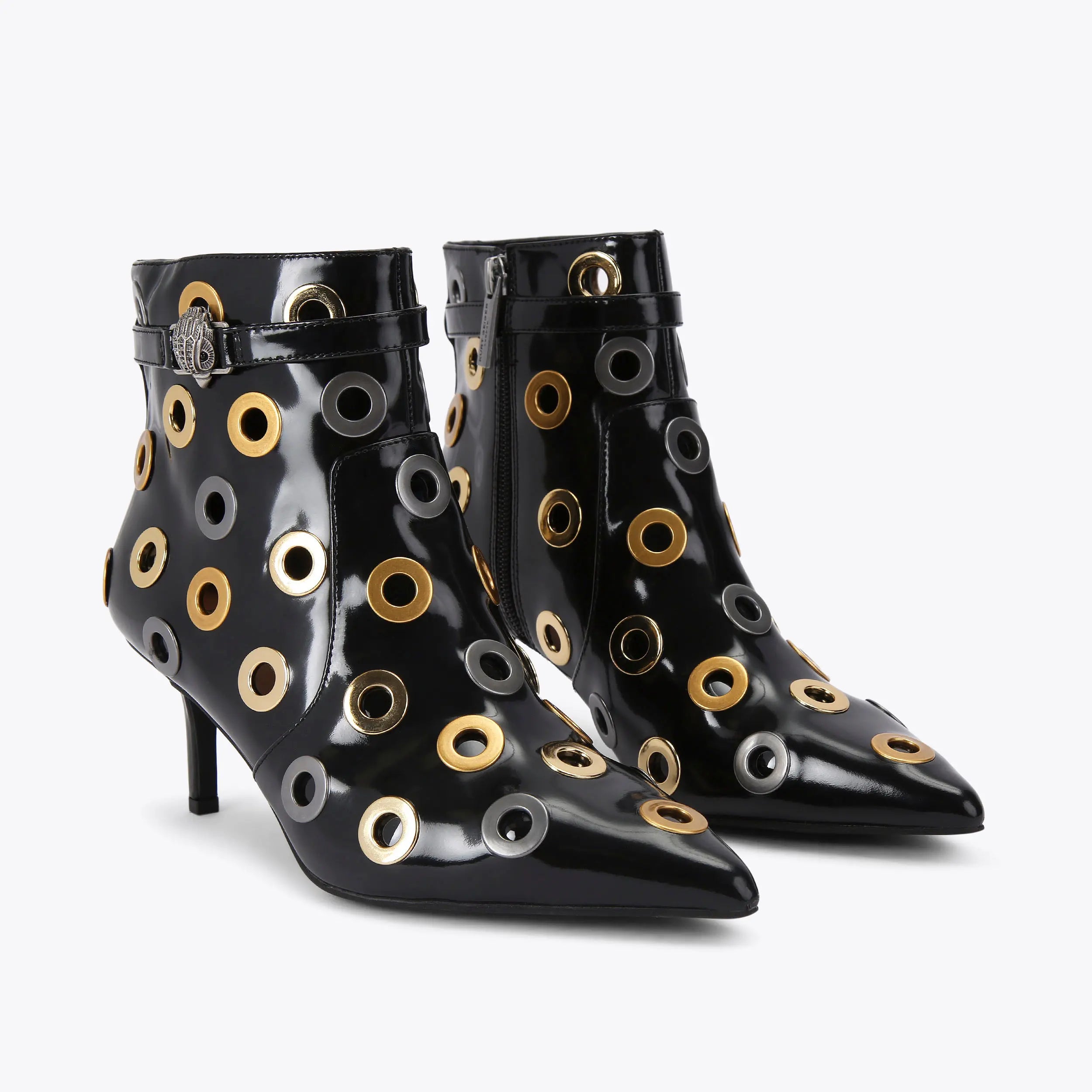 This Kensington Flexi Ankle boot features a sleek black leather upper with tonal metal eyelets across the boot. There is an antiqued silver eagle head on the slim ankle strap. The sole has added flexibility for a unique comfort.