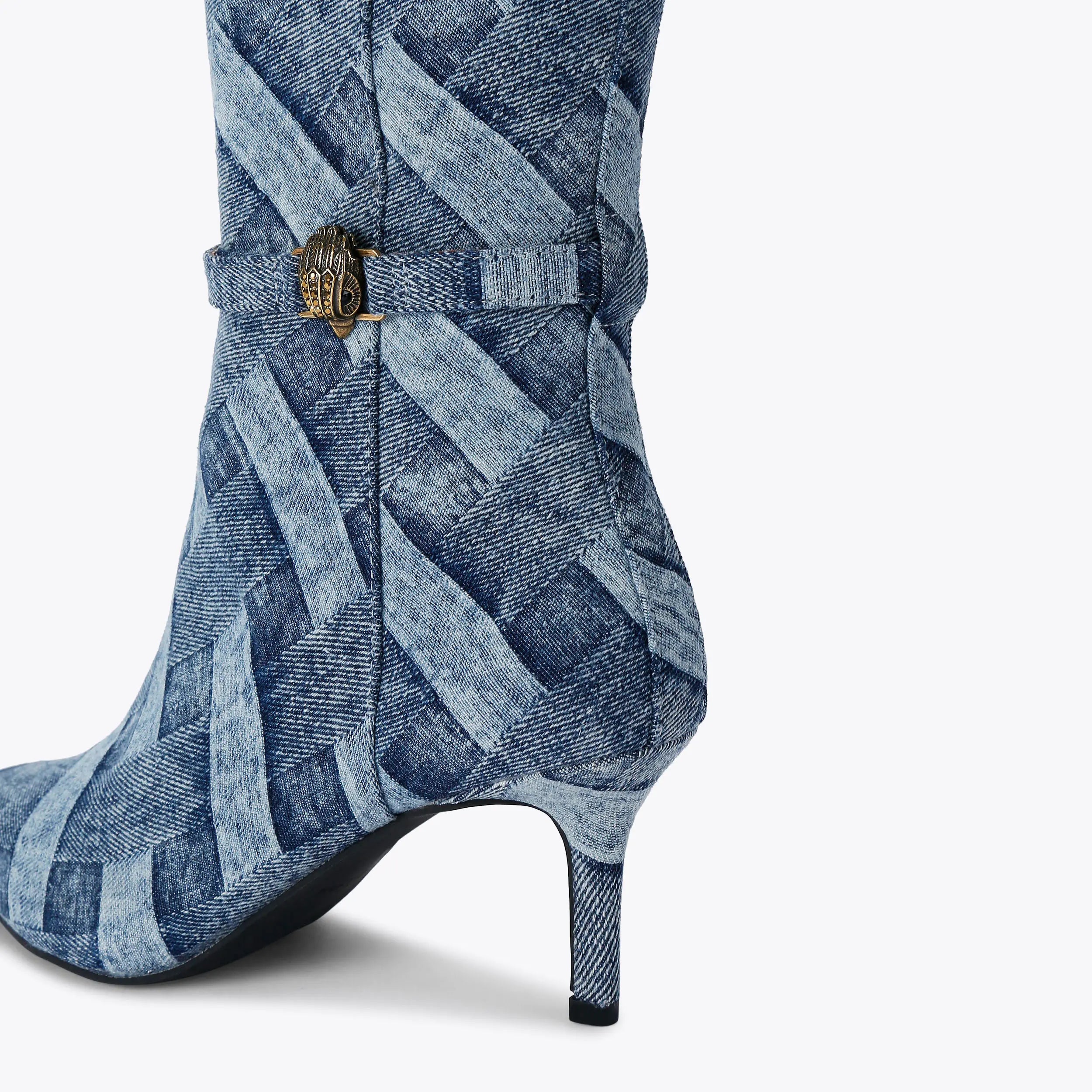 This Kensington Flexi Knee High boot features a woven denim upper with pointed toe. There is an antiqued brass eagle head on the slim ankle strap. The sole has added flexibility for a unique comfort.