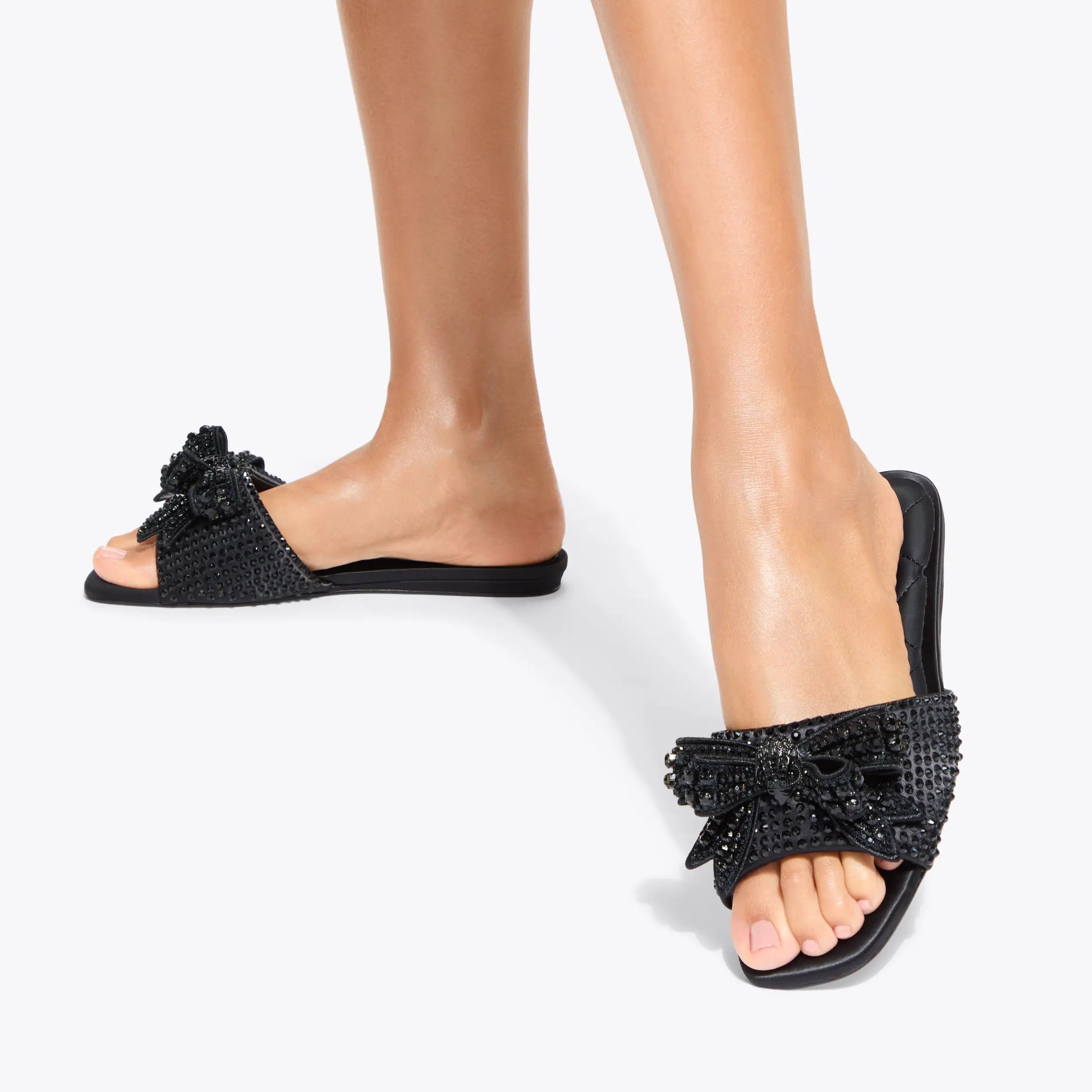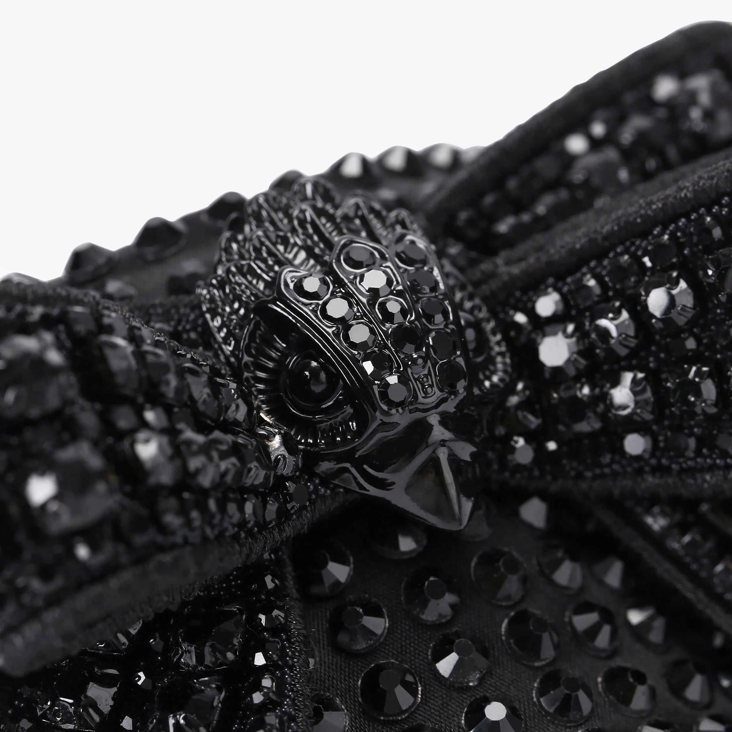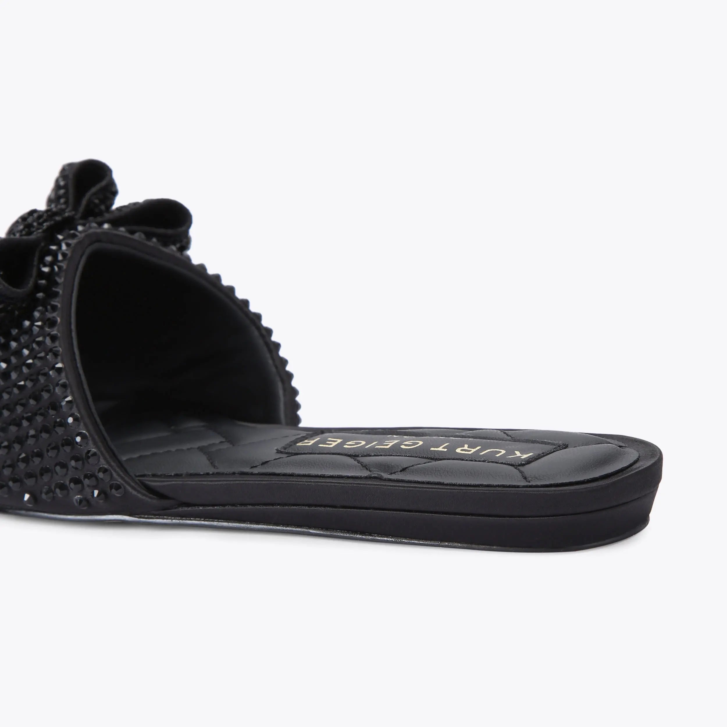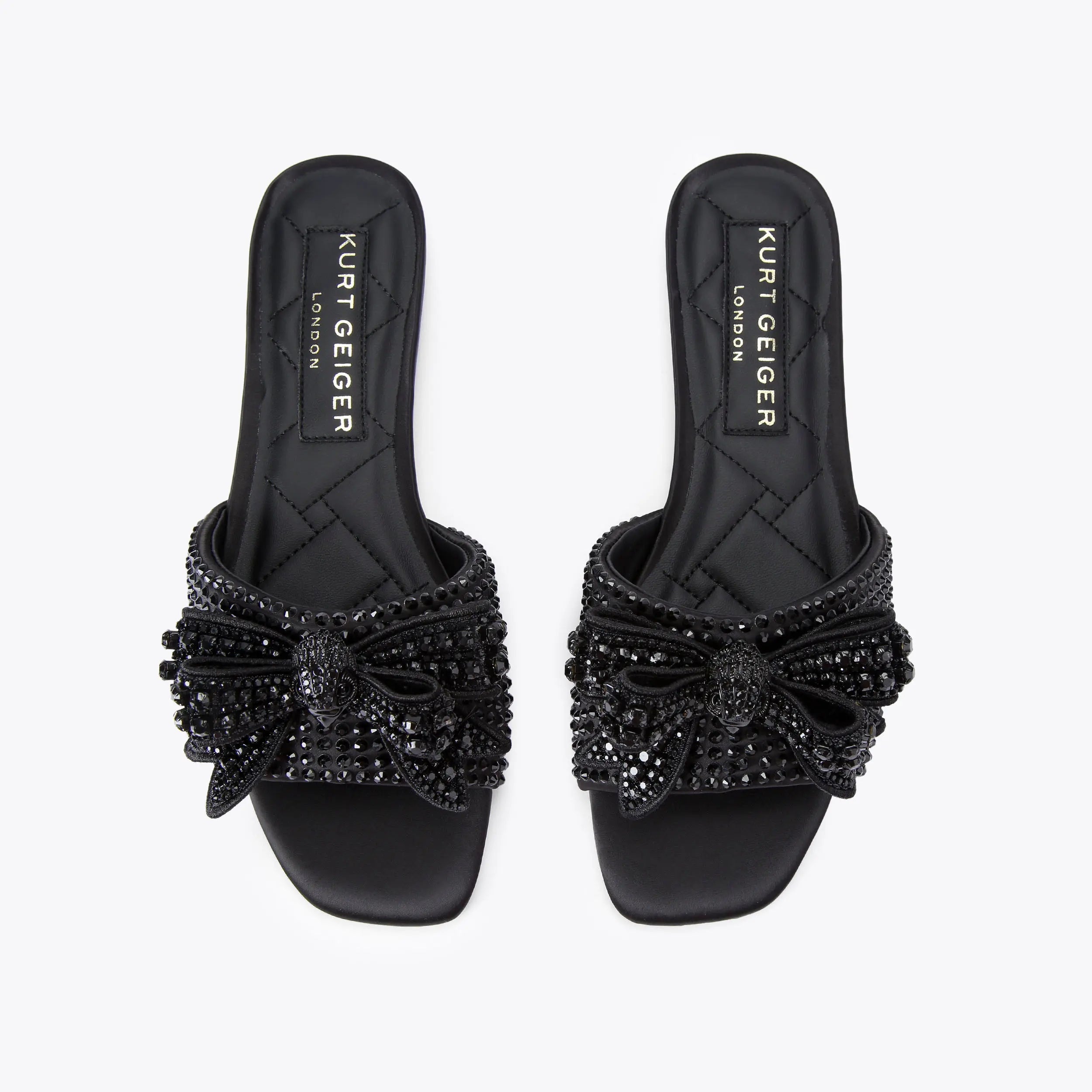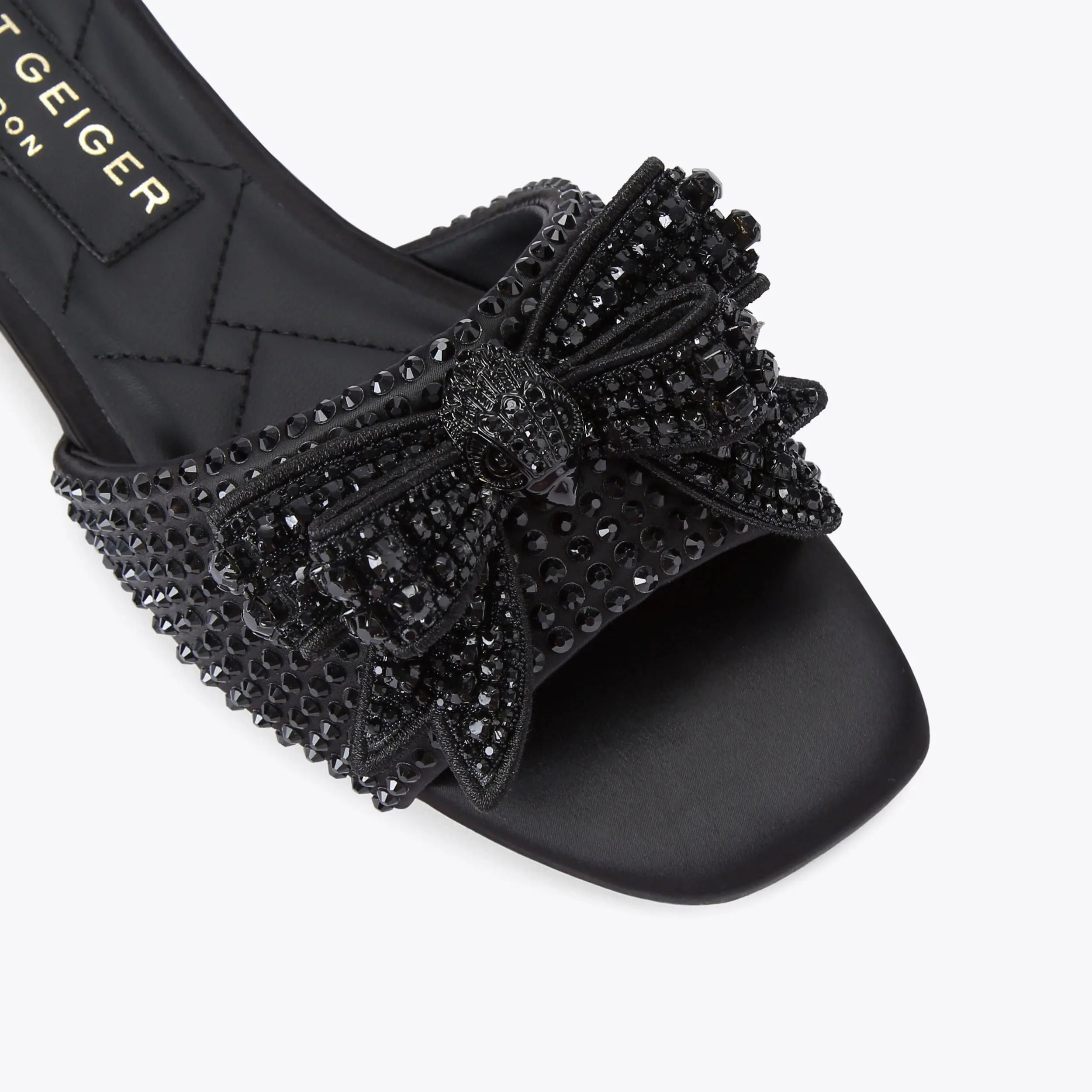 The Kensington Bow Flat Sandal is crafted from a black satin. There is a black fabric bow embellished with black crystals on the strap featuring a black eagle head to complete the drench effect.