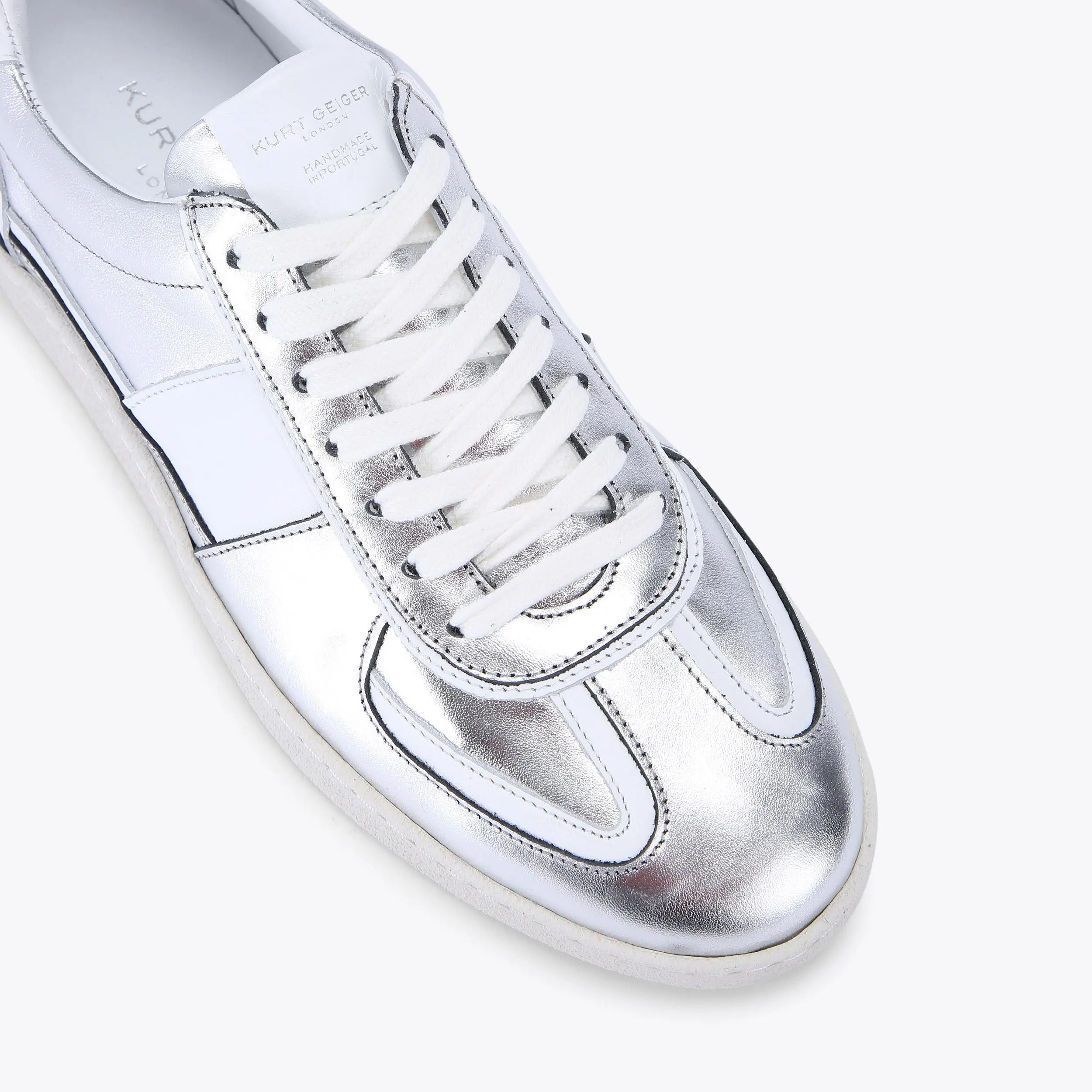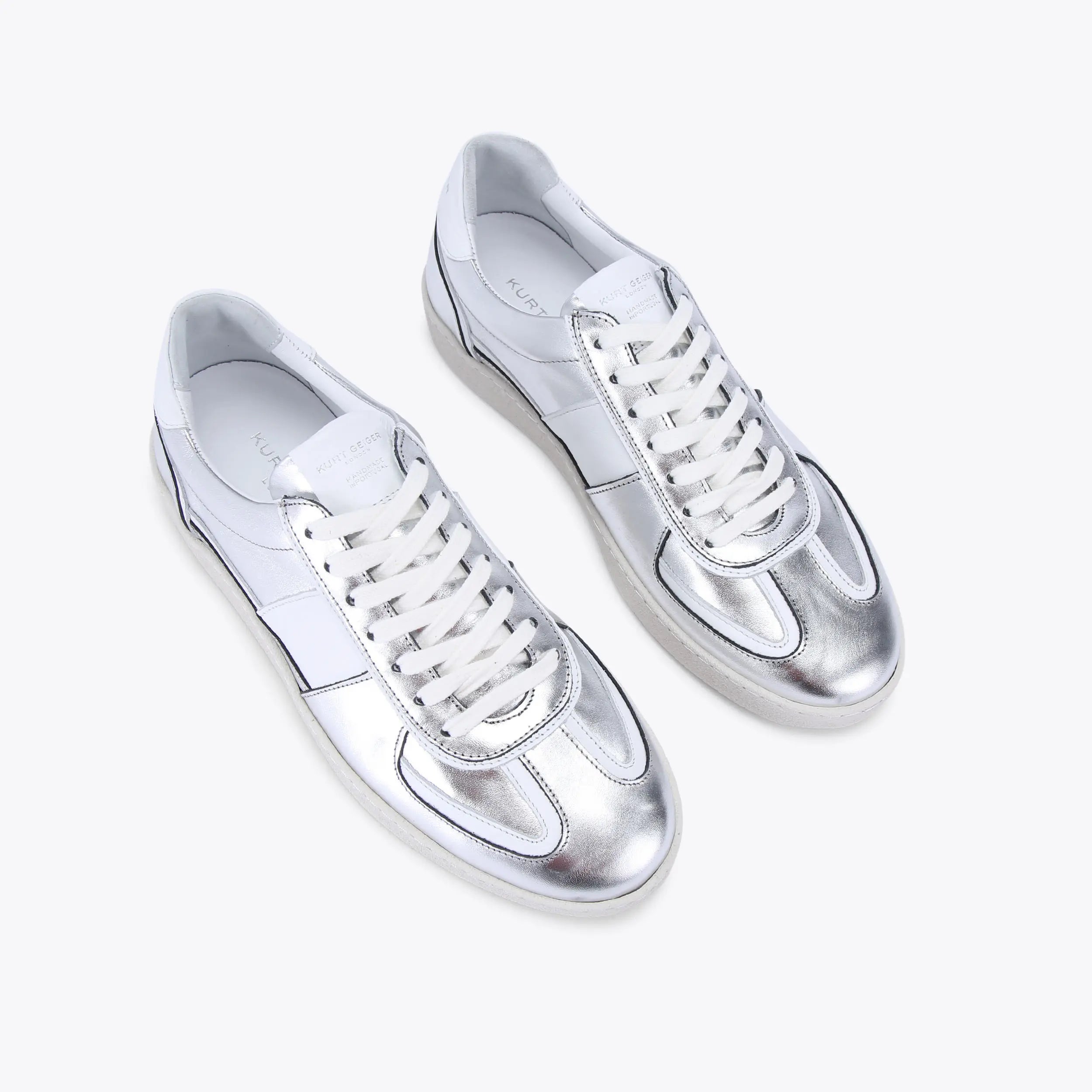 This Lloyd Sneaker features a metallic silver exterior with classic lace up front. The tongue and heel both have silver foil embossed branding.