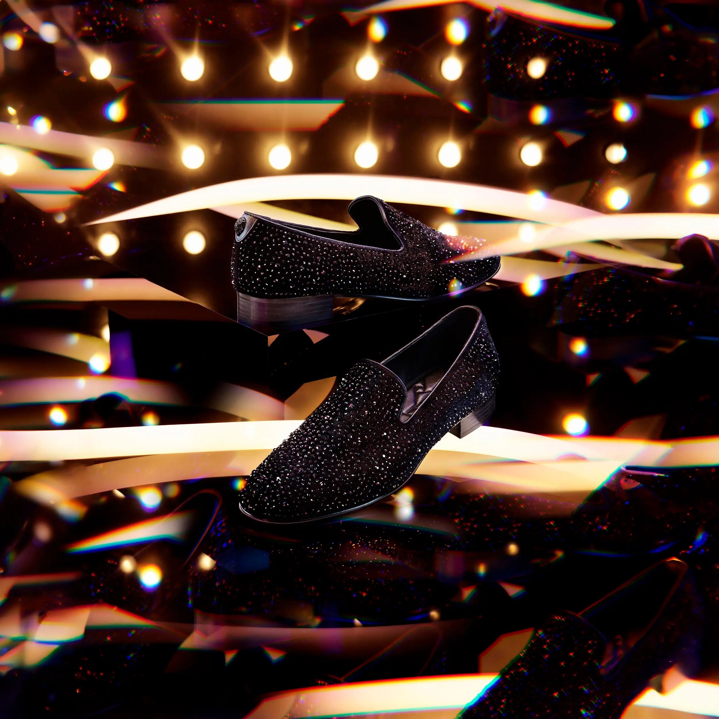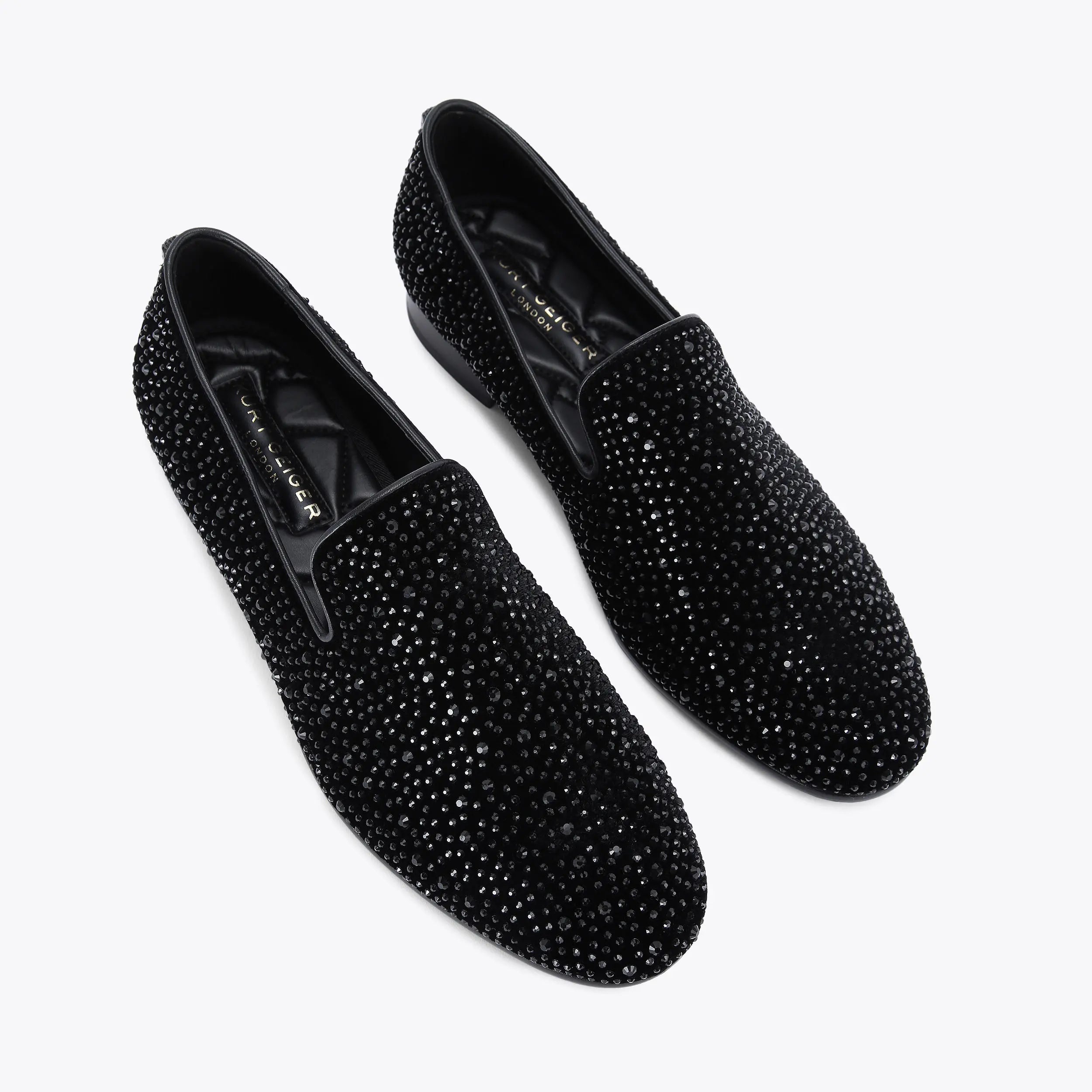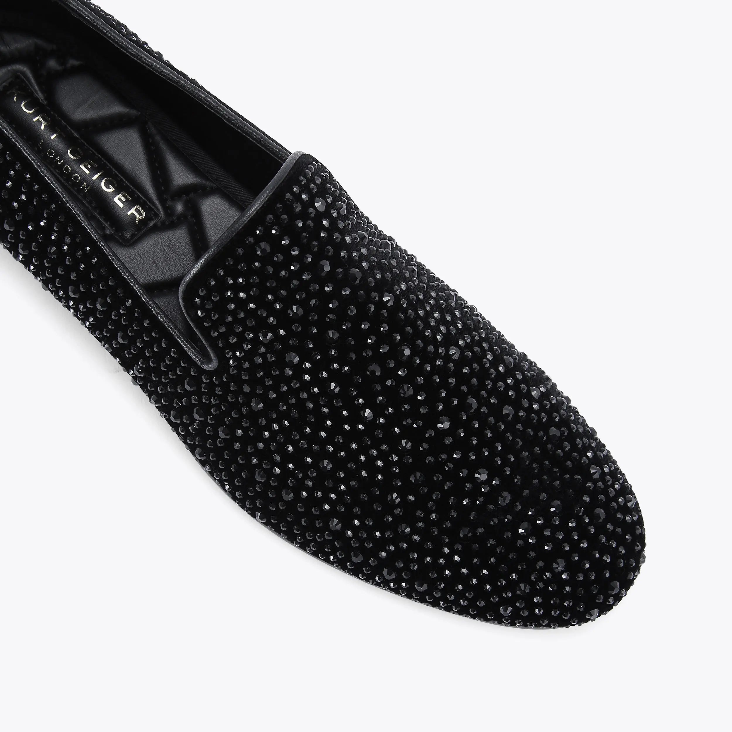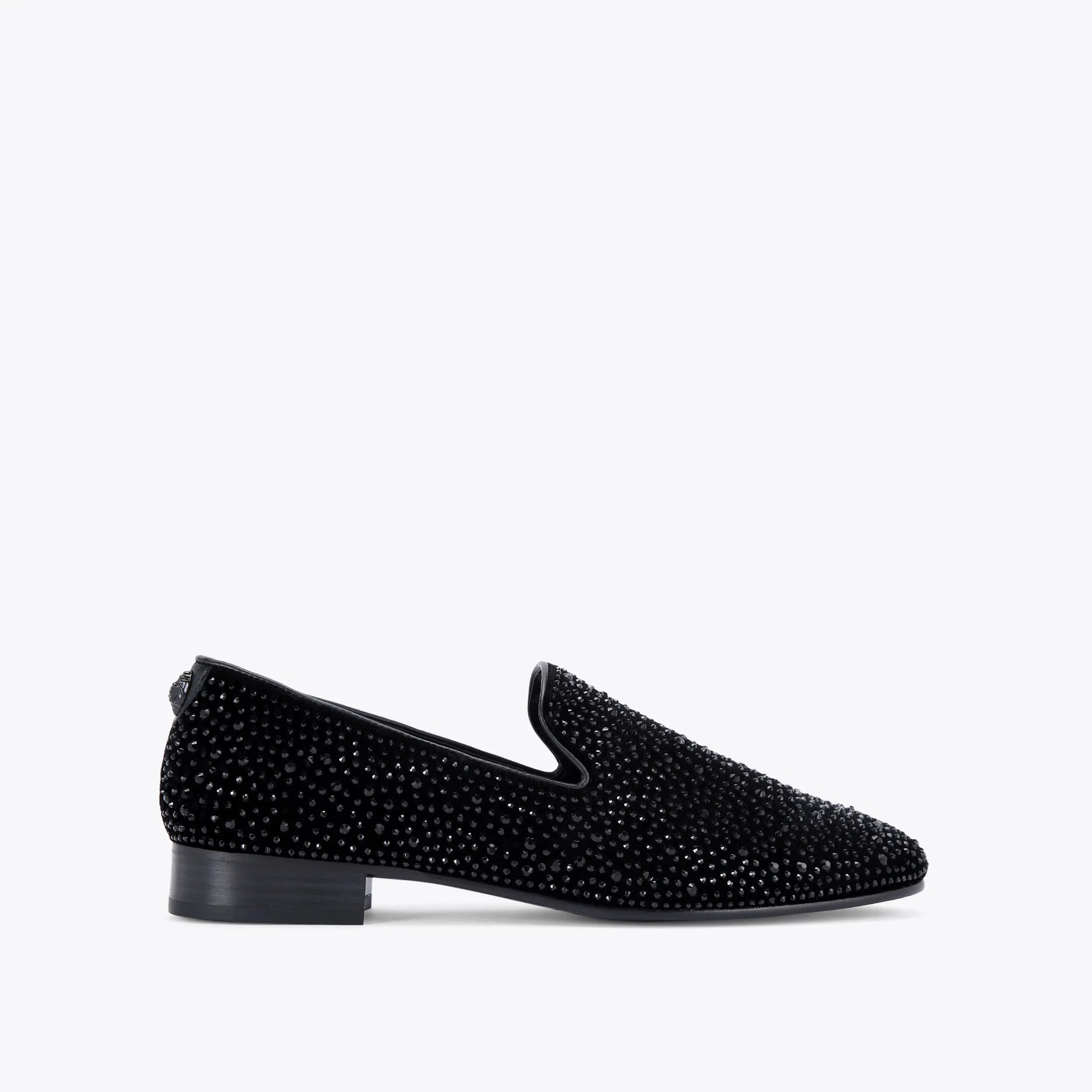 This Ace loafer is crafted from a black fabric which is embellished with crystals. There is a black eagle head sat at the heel.