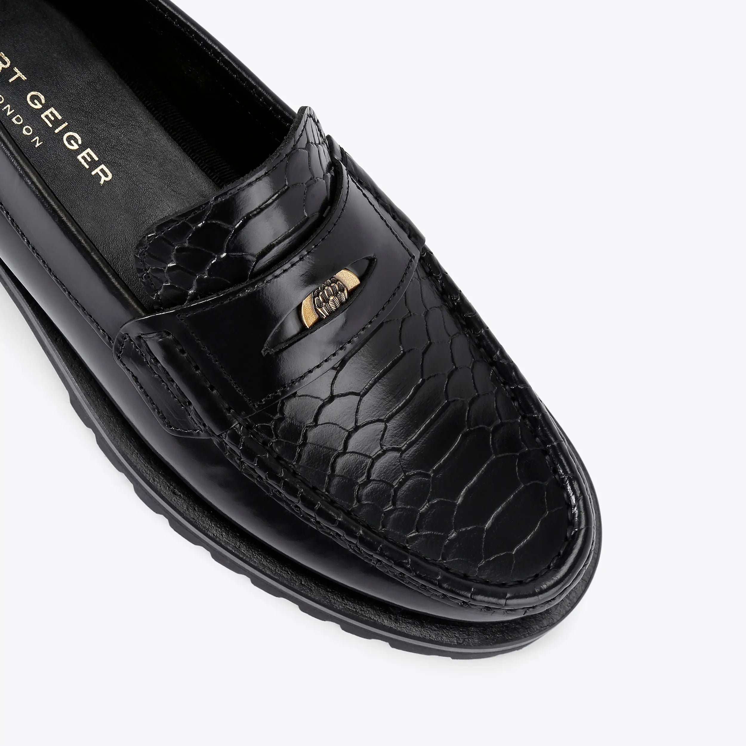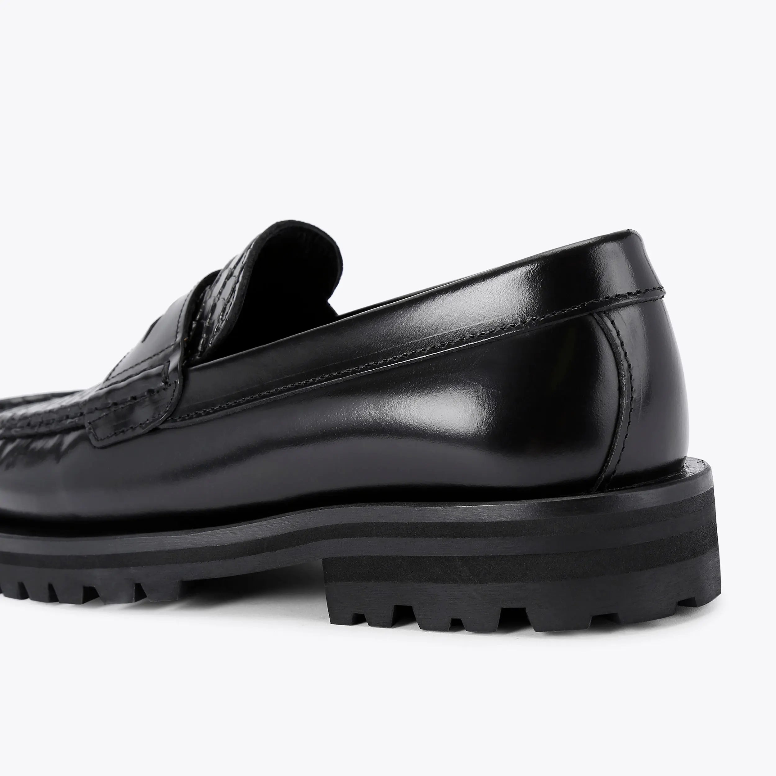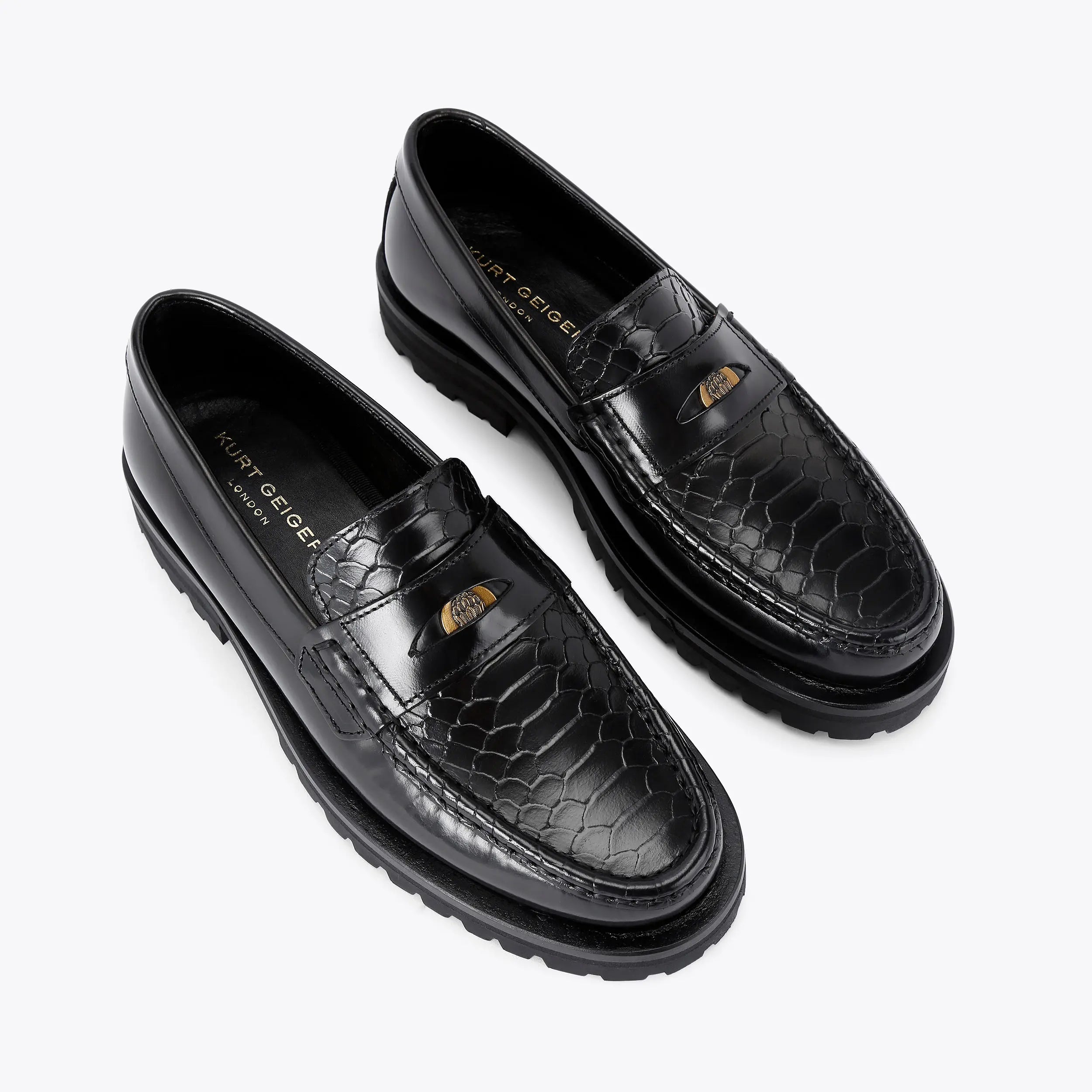 This Luis Cleat Loafer features a black upper in leather. There is a snake embossing on the vamp with cut out strap. There is an antiqued brass coin with eagle head embossing within the strap.