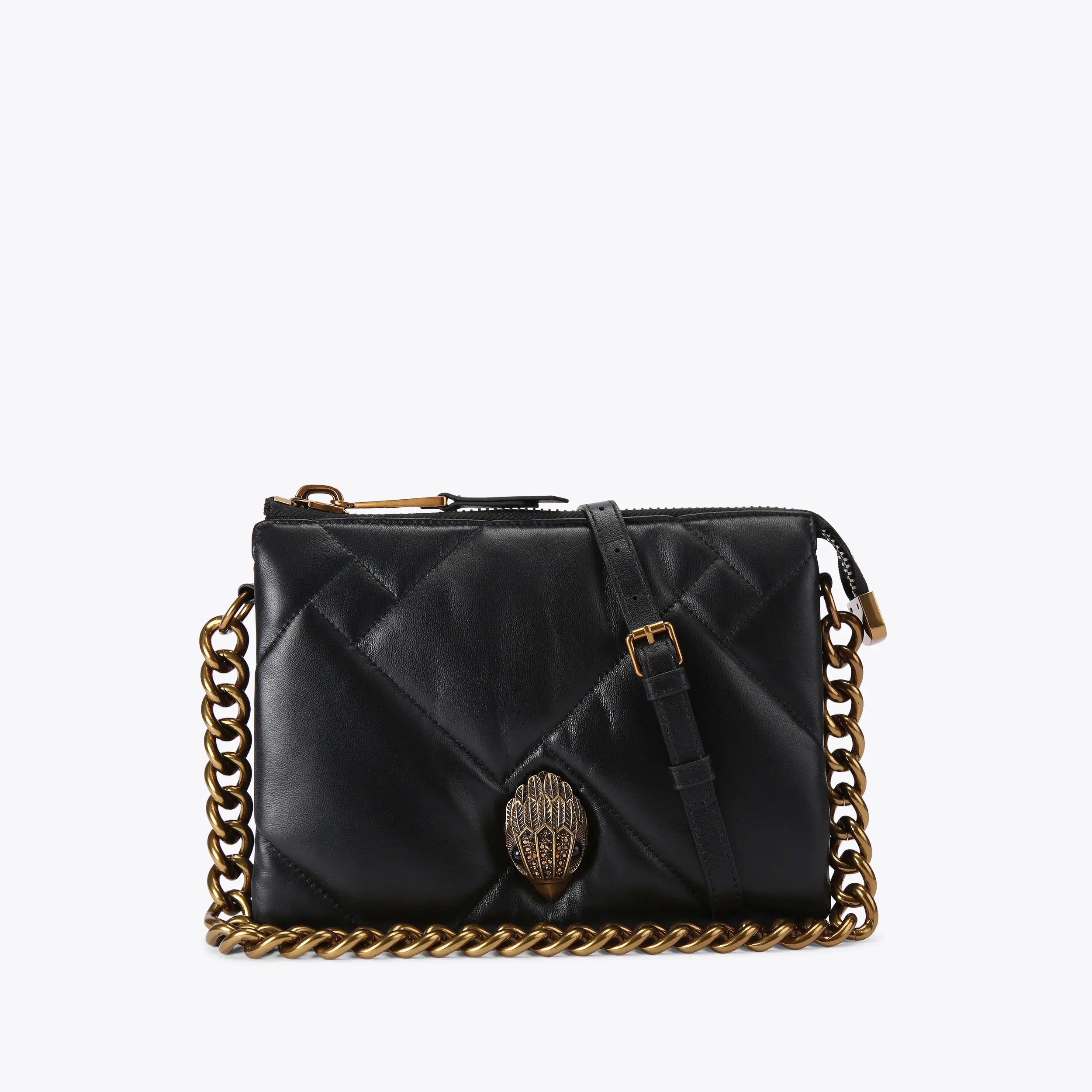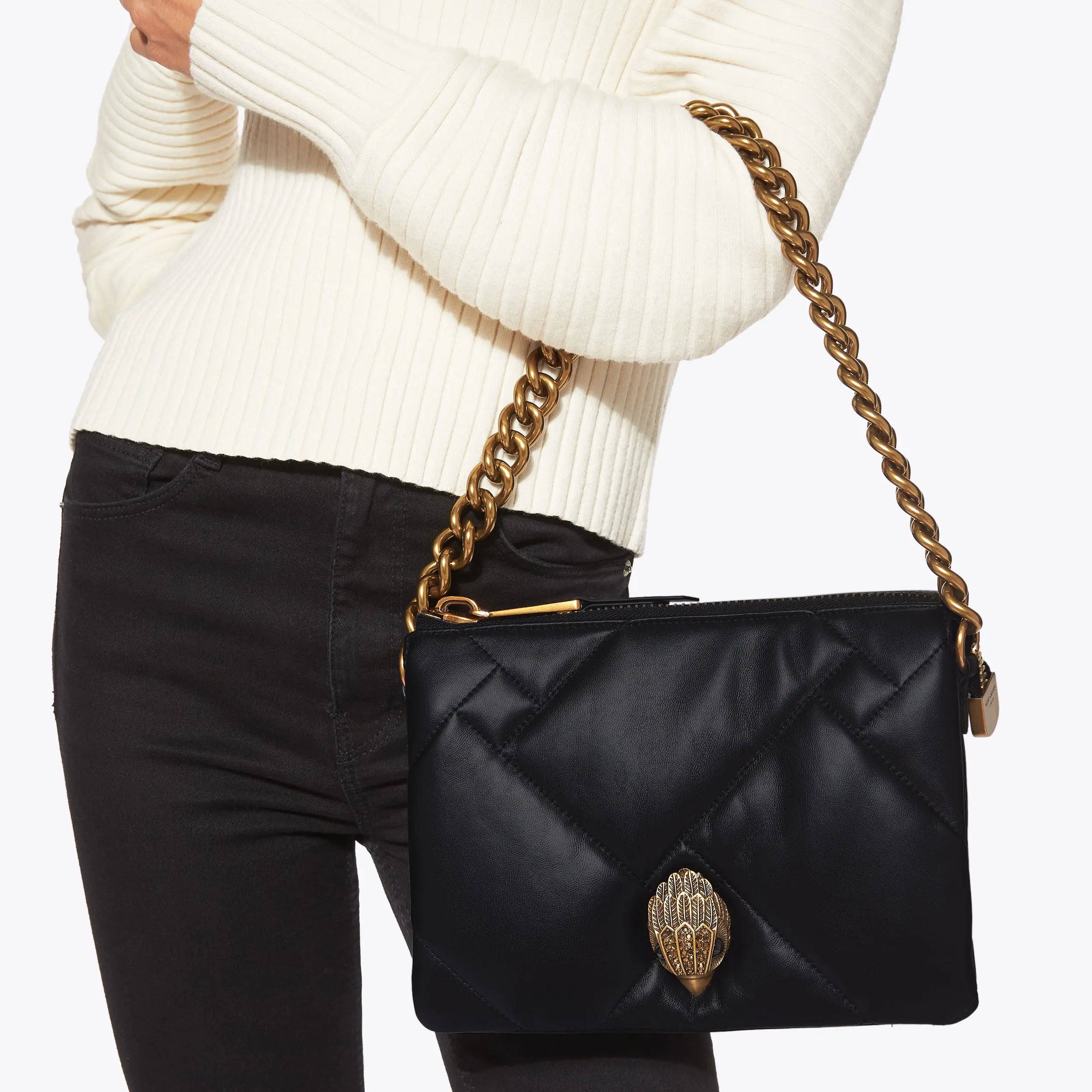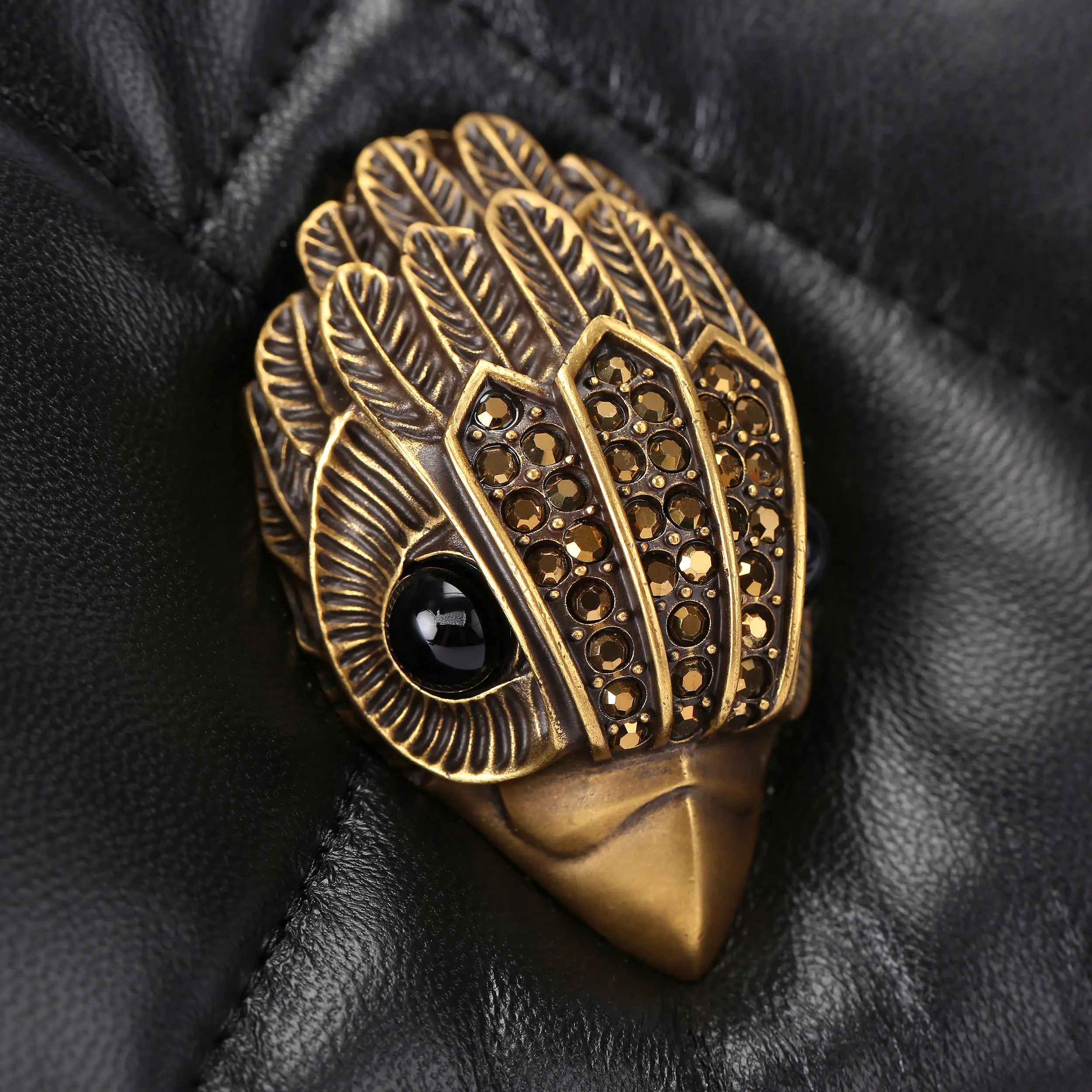 This Kensington Puff Pouch features a black leather exterior with large quilting design that is softly padded. There is a large antiqued brass eagle head on the front of the purse.
