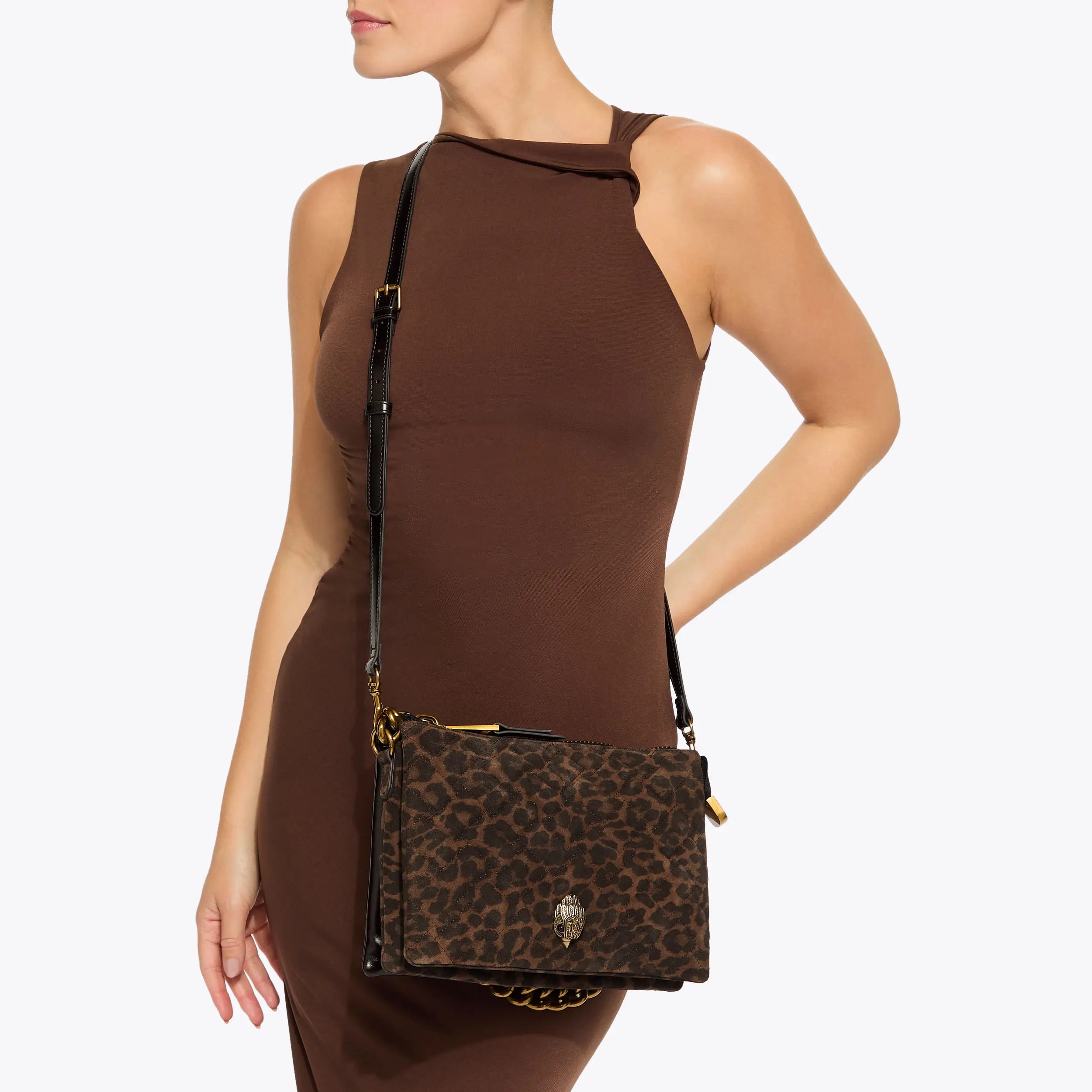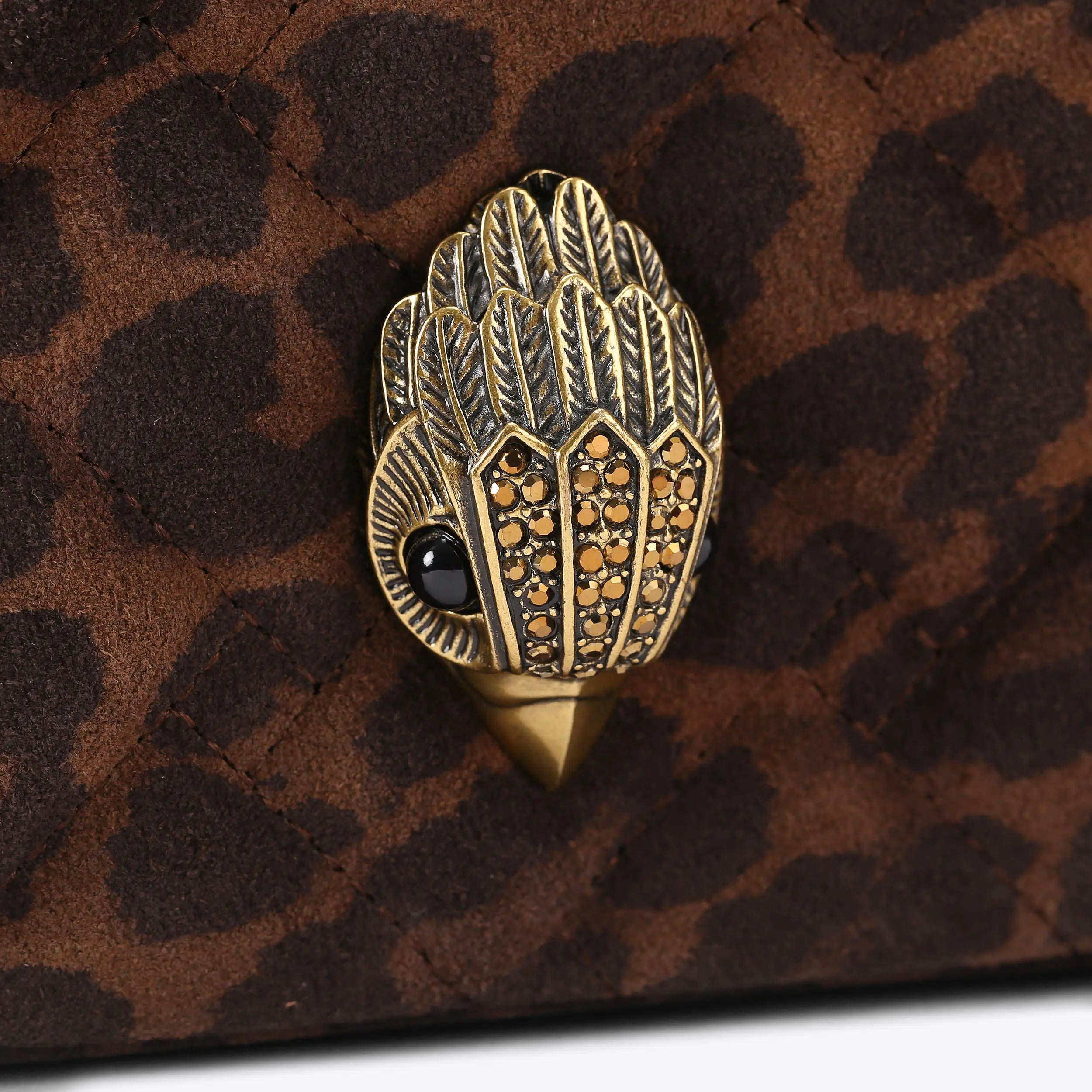This Kensington 3 Pouch purse is crafted from a leopard printed suede and deep brown leather. There is an antiqued brass eagle head on the front complimenting the large zipper.