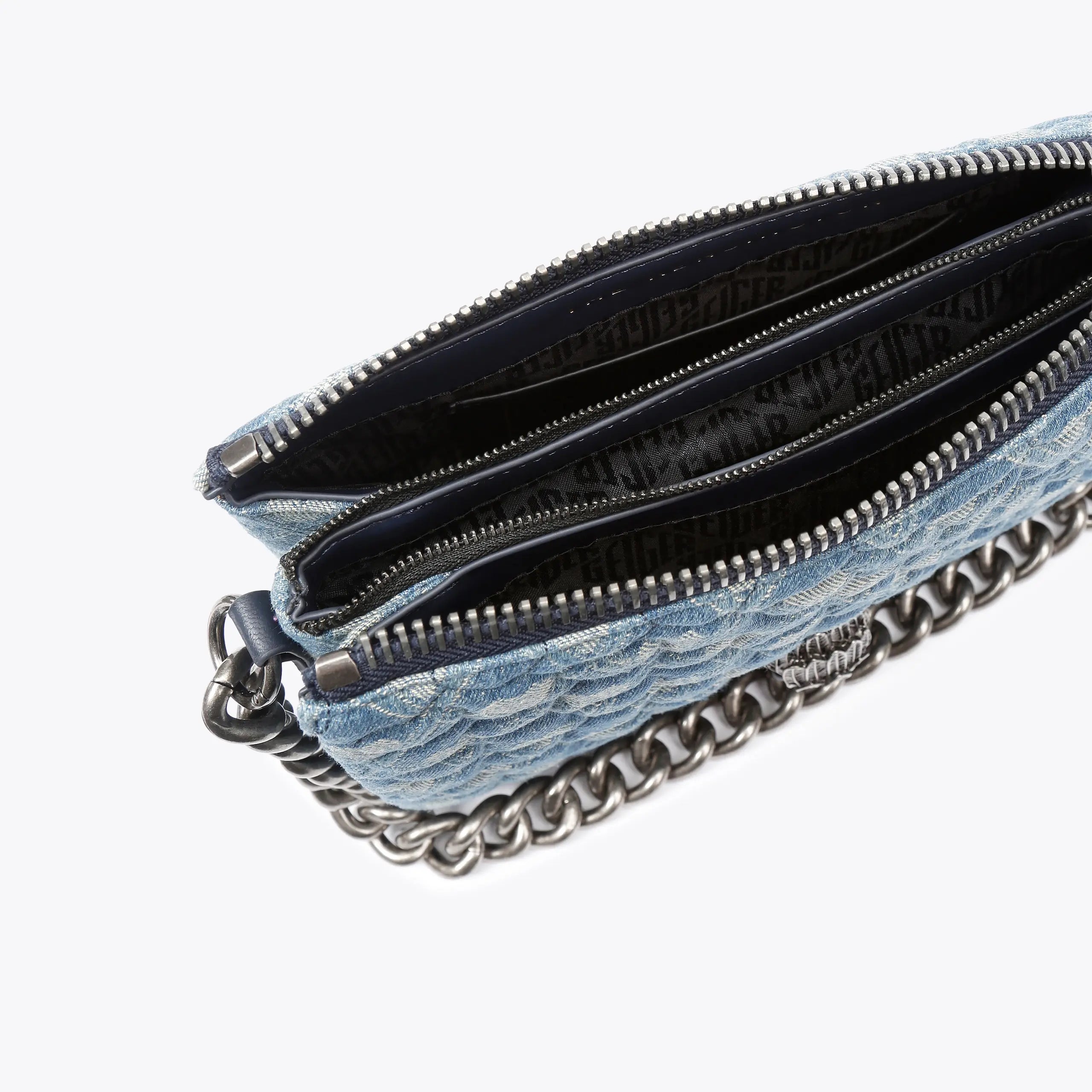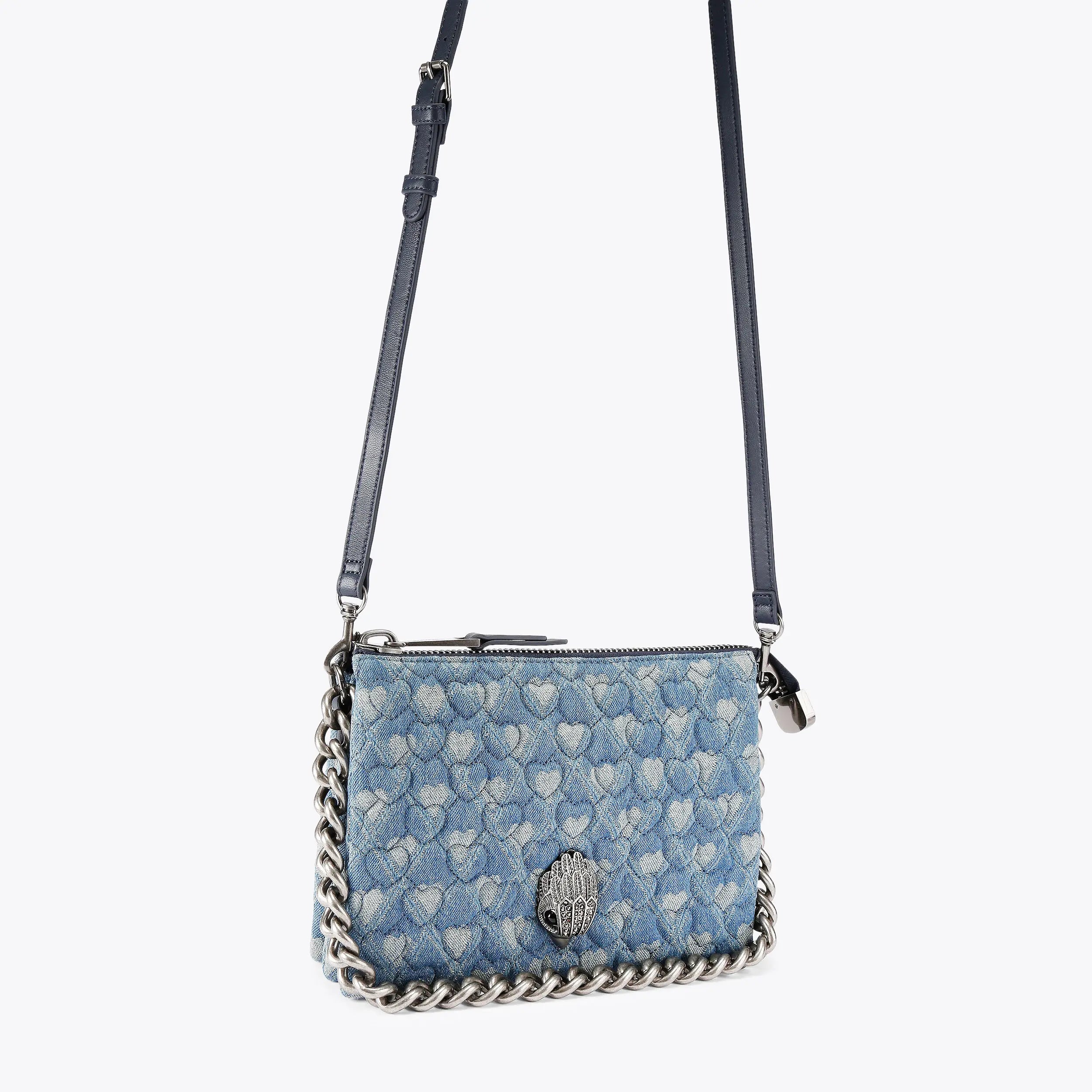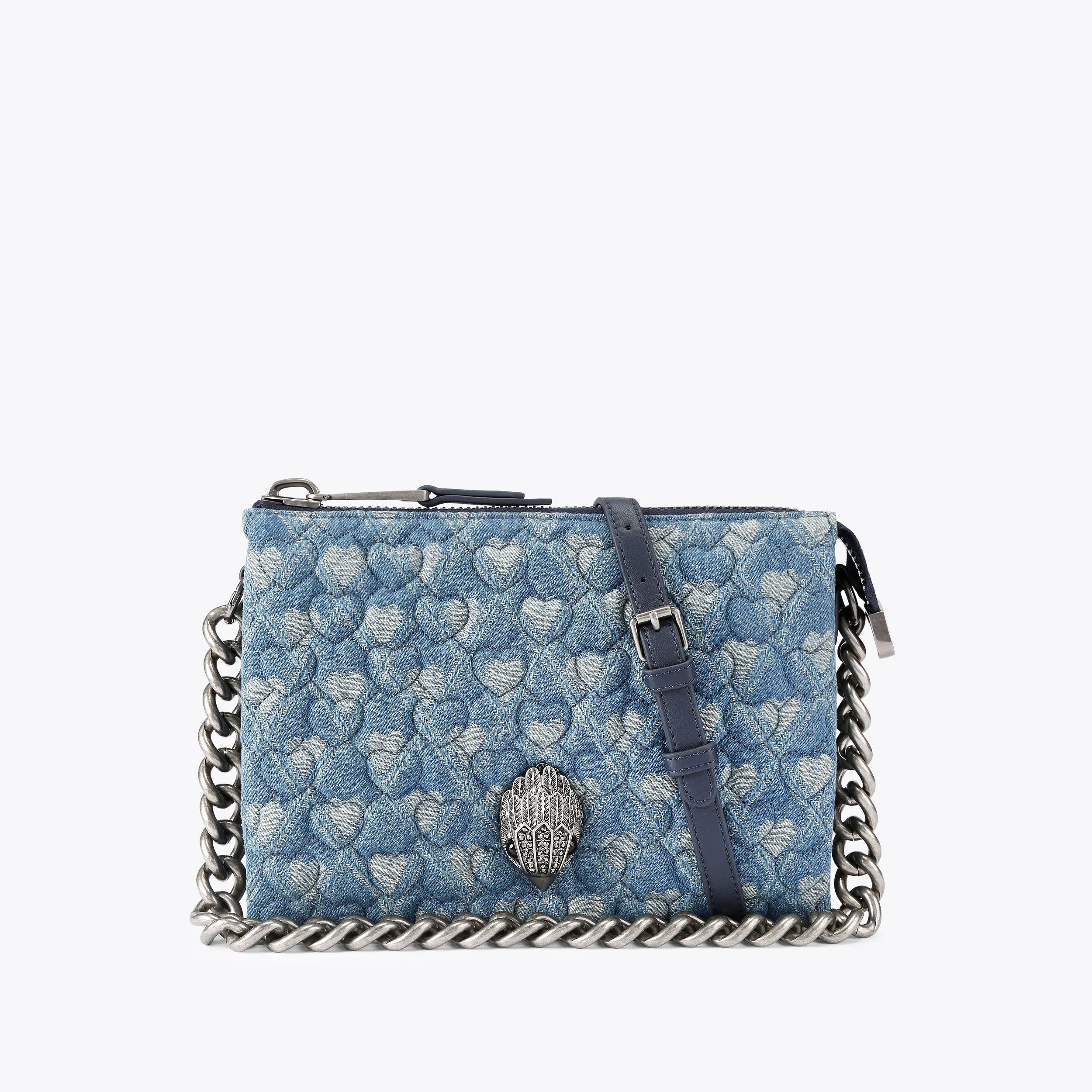 This Kensington Drench Puff Pouch features a blue denim exterior with bleached and embroidered heart design. There is a large antiqued silver eagle head on the front of the purse.