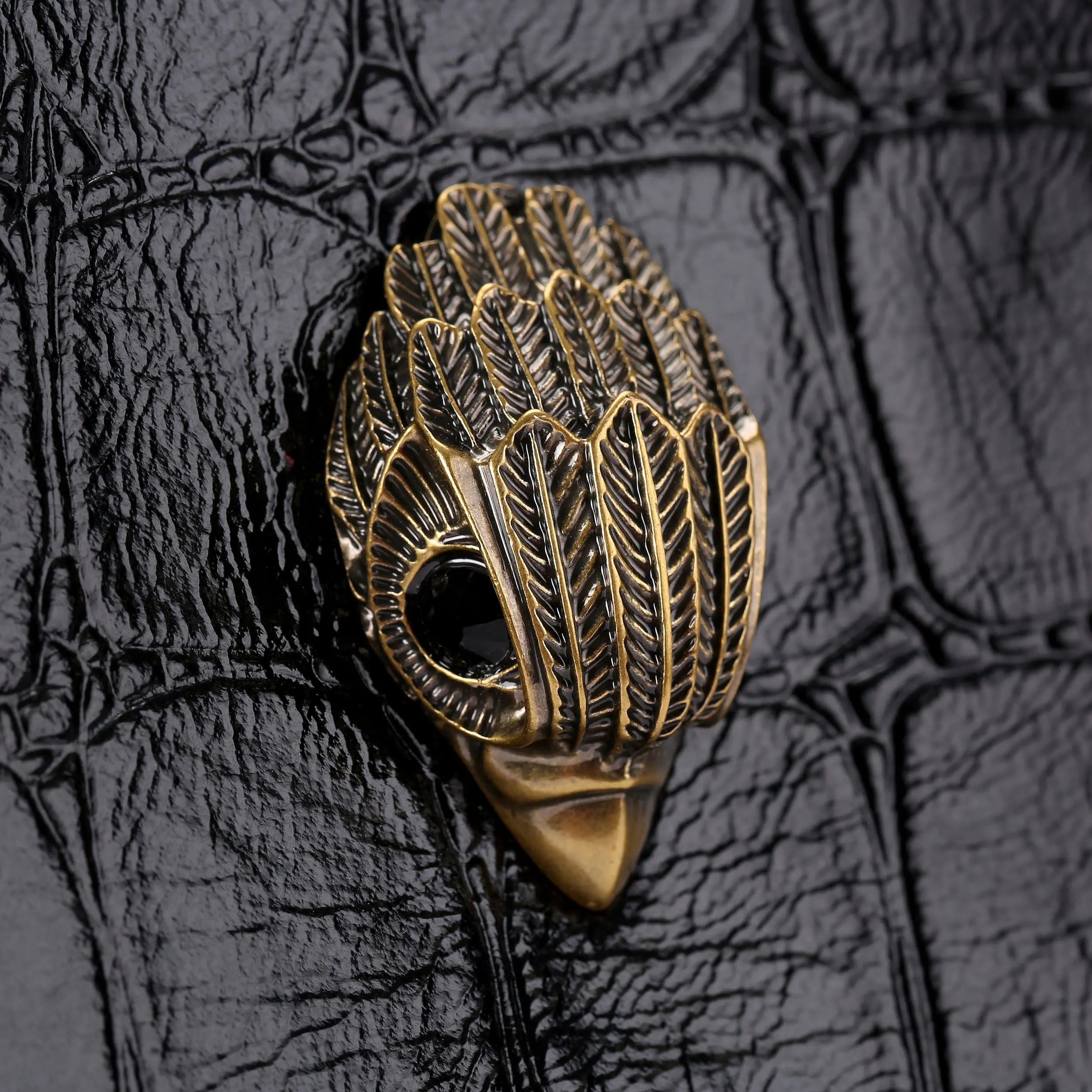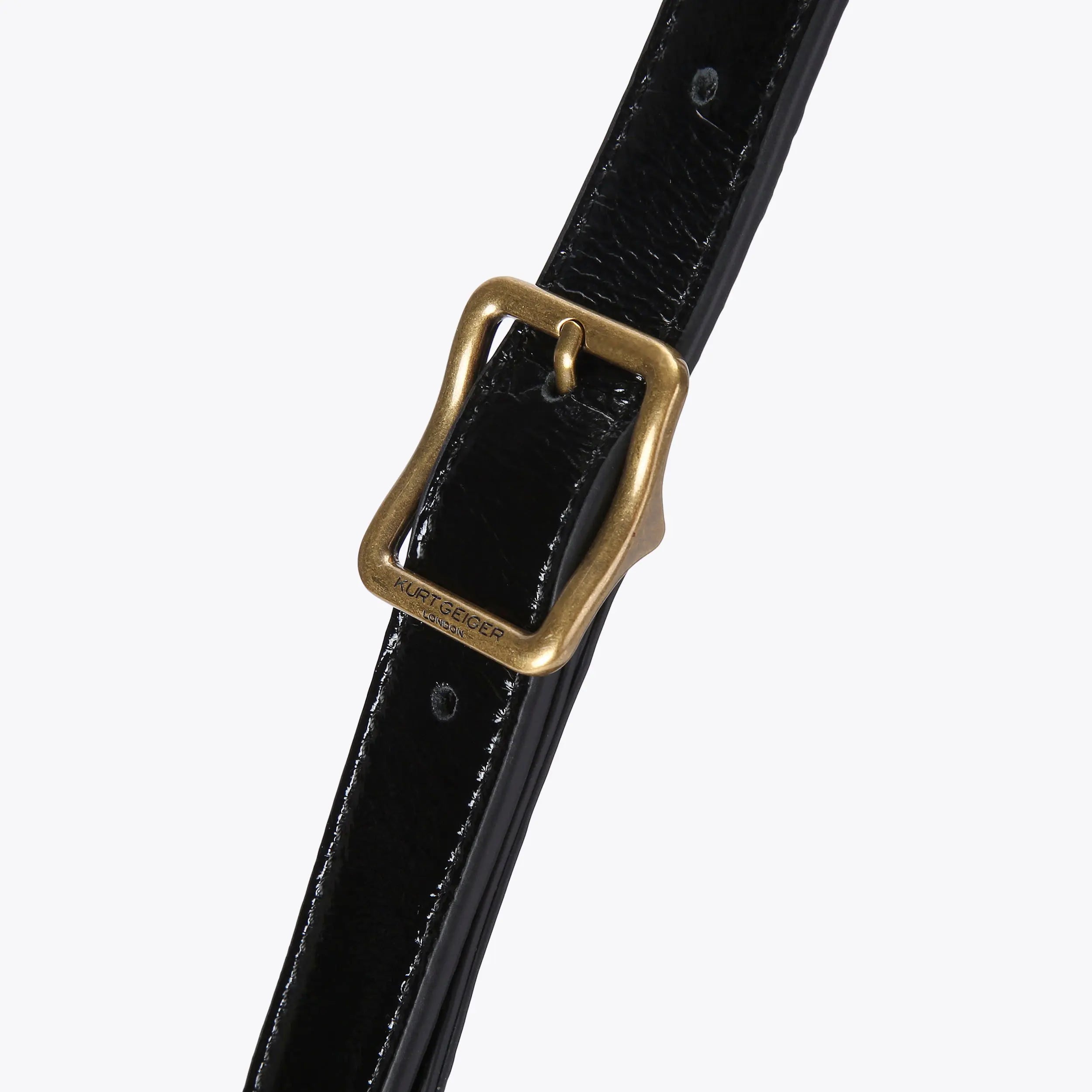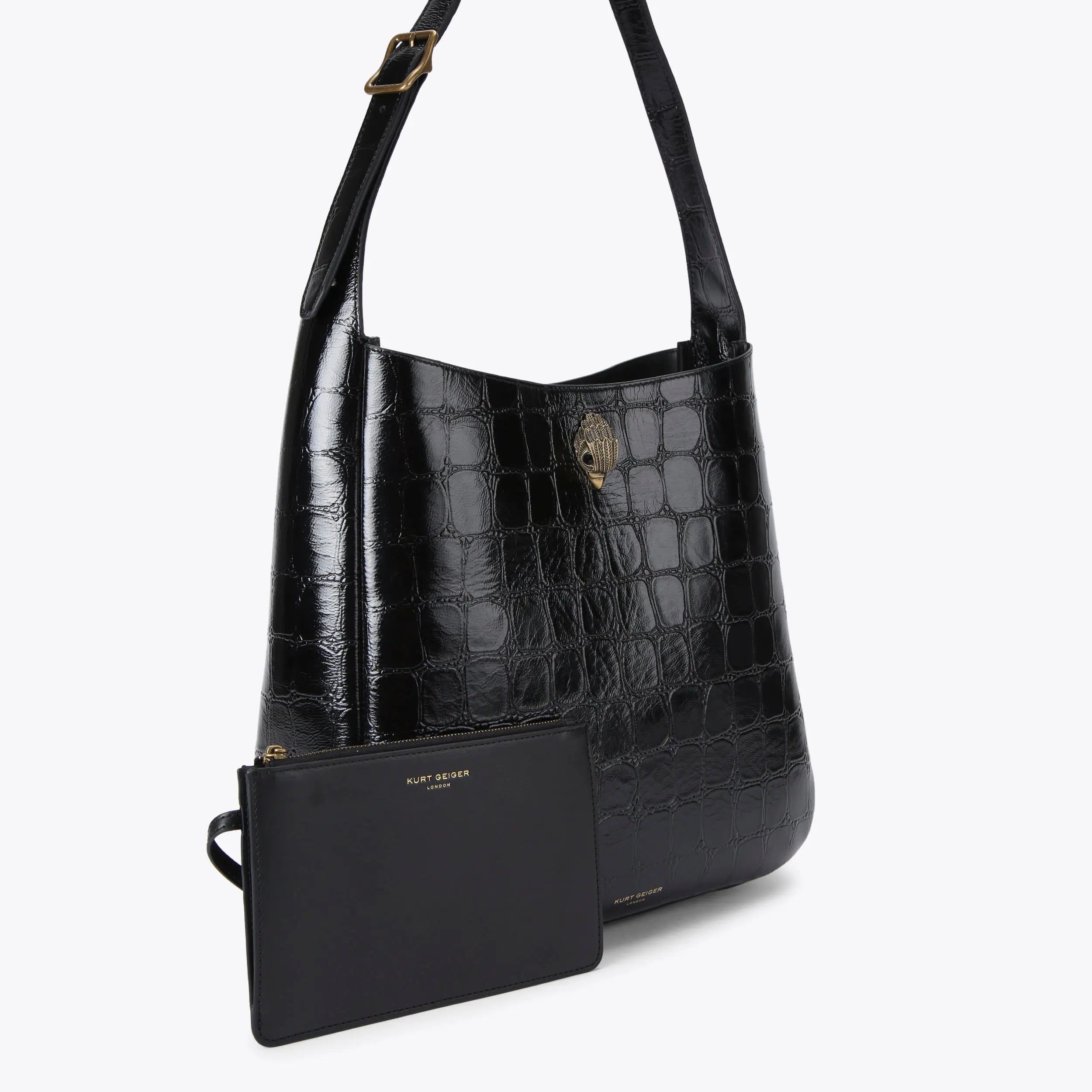 The Large Bond Hobo purse features a patent black croc embossed leather. There is an antiqued brass eagle head on the front above gold foil branding.