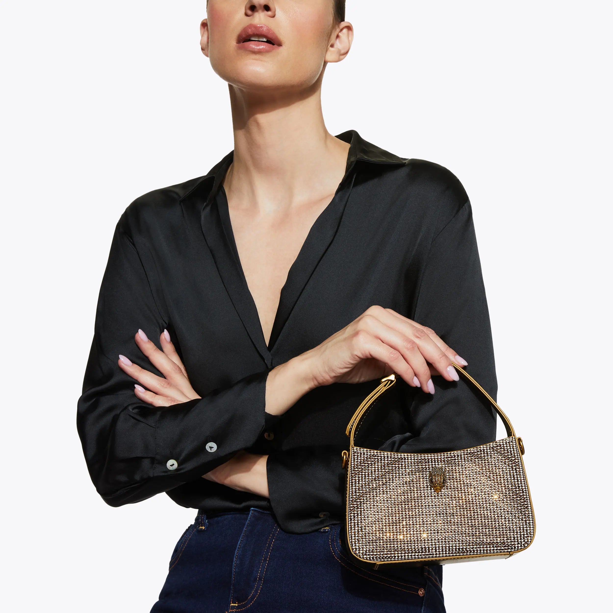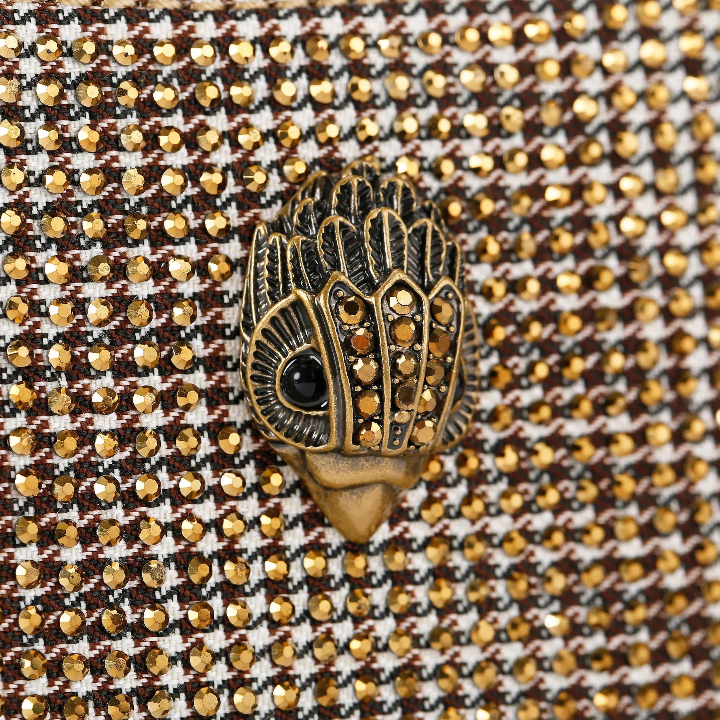 This Mini Bond Shoulder Purse features a beige houndstooth exterior with gold crystals. The shoulder strap and trims are crafted in gold leather.