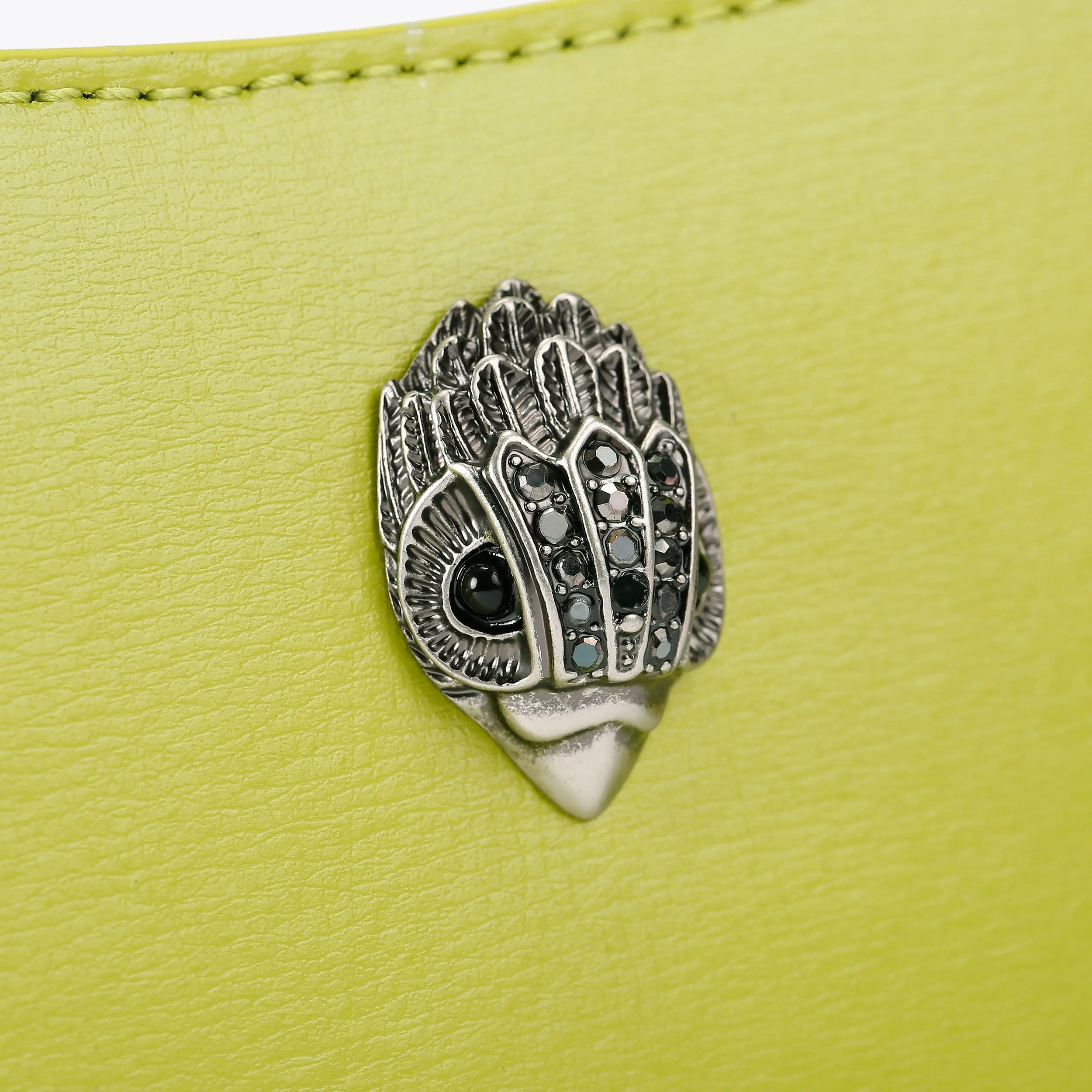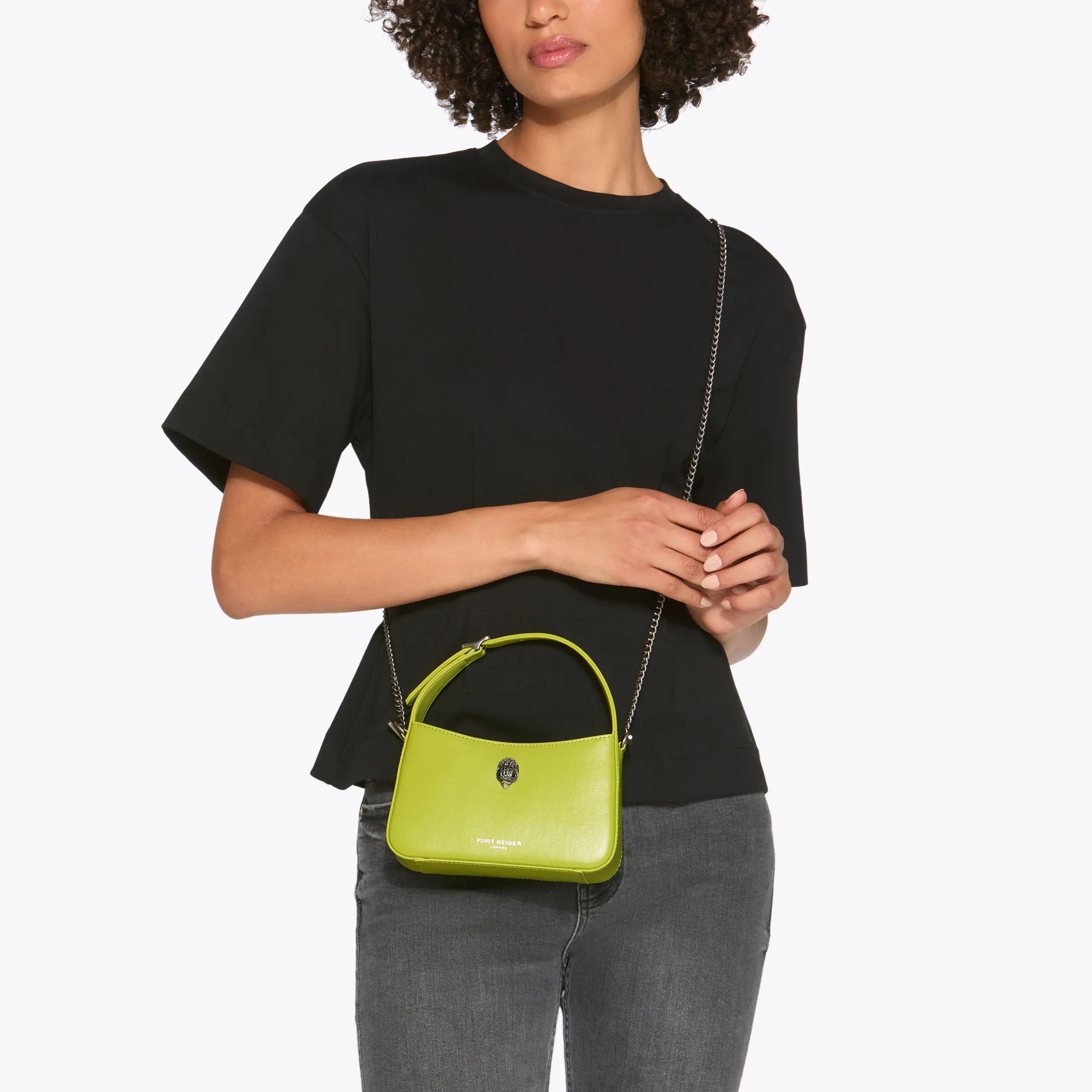 This Mini Leather Bond Shoulder Purse features a lime green leather exterior. The shoulder strap and trims are crafted in leather.