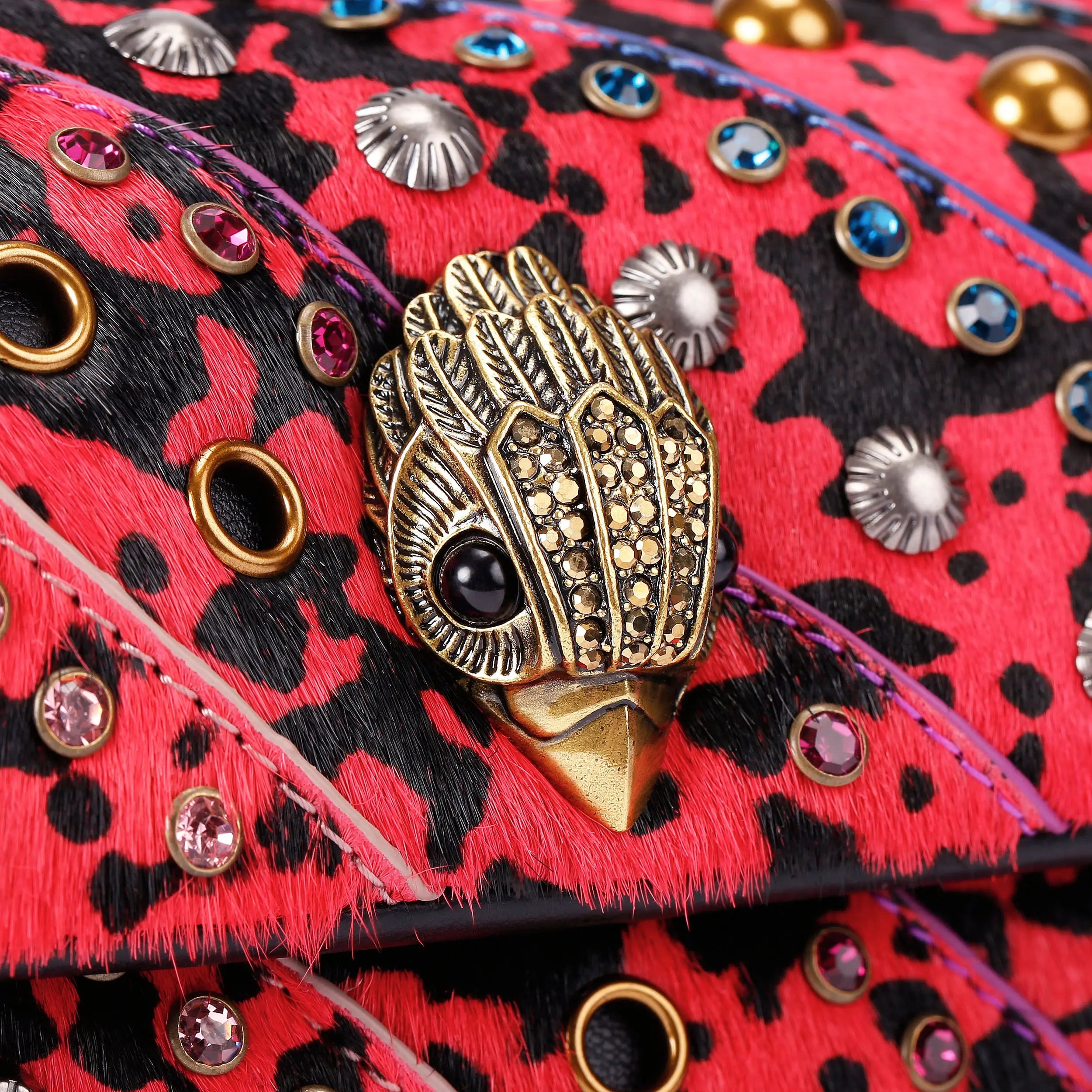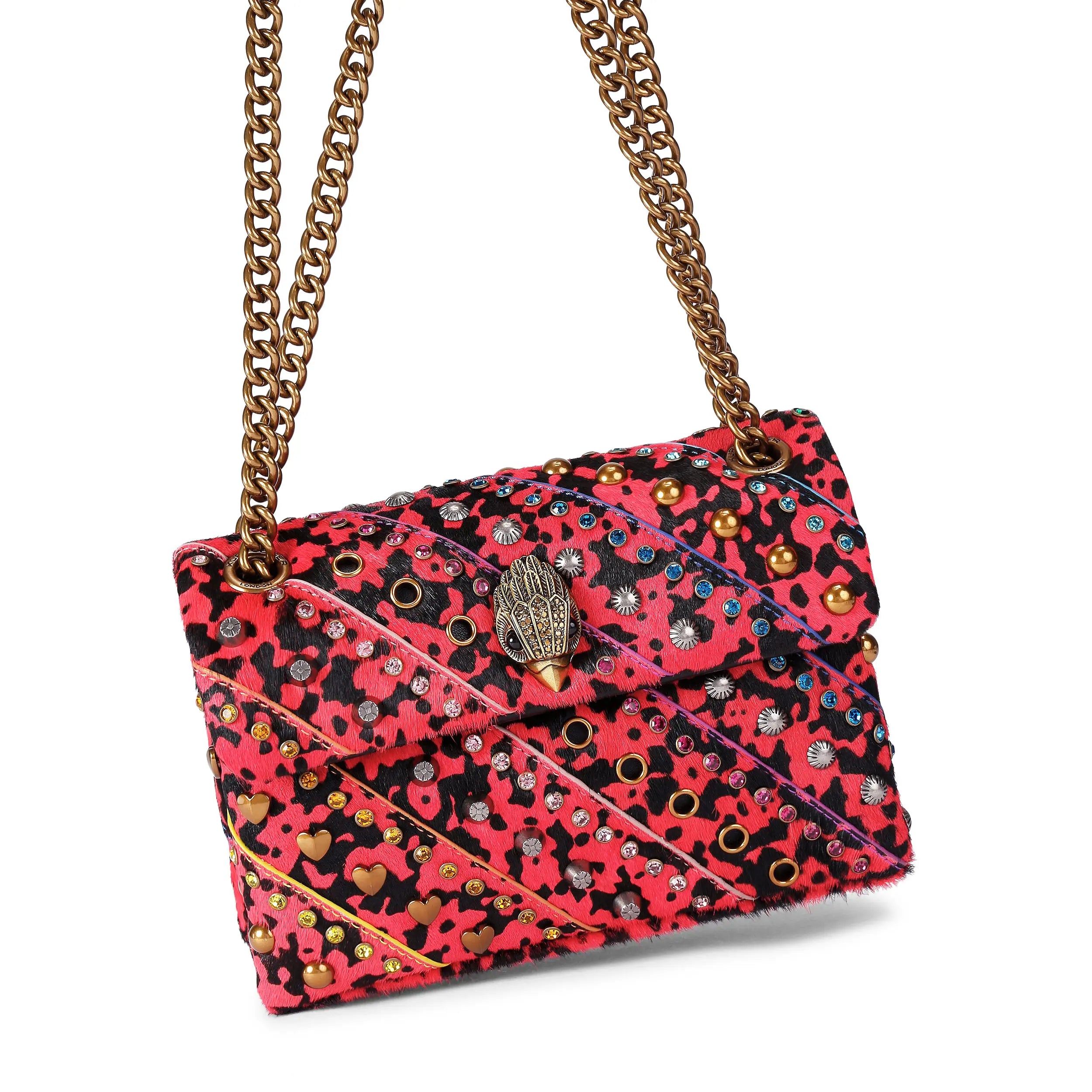 The Mini Leather Kensington purse is crafted from a pink animal printed calfhair leather which is embellished with crystals and antiqued metal studs. gold crystal eagle head sits on the front flap.