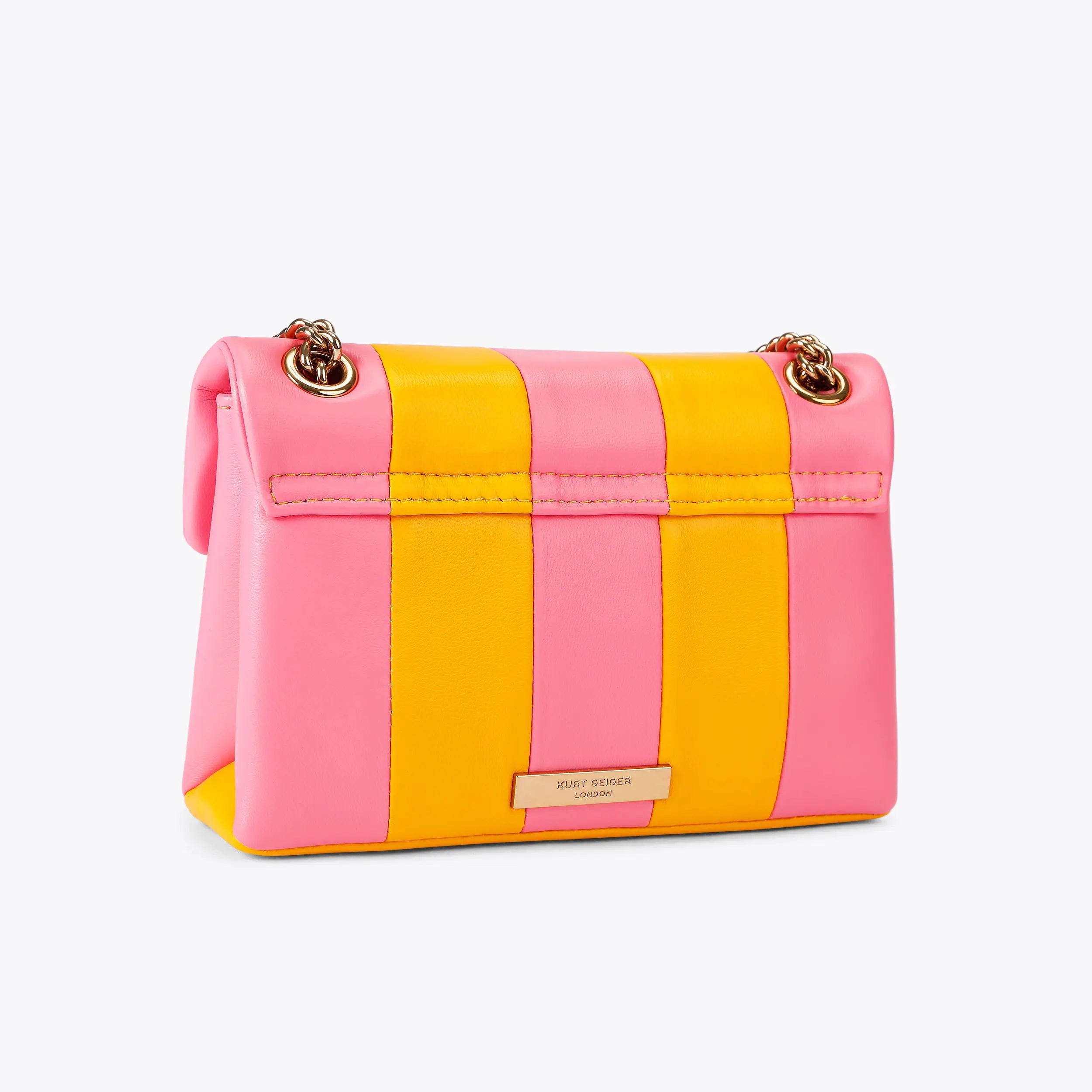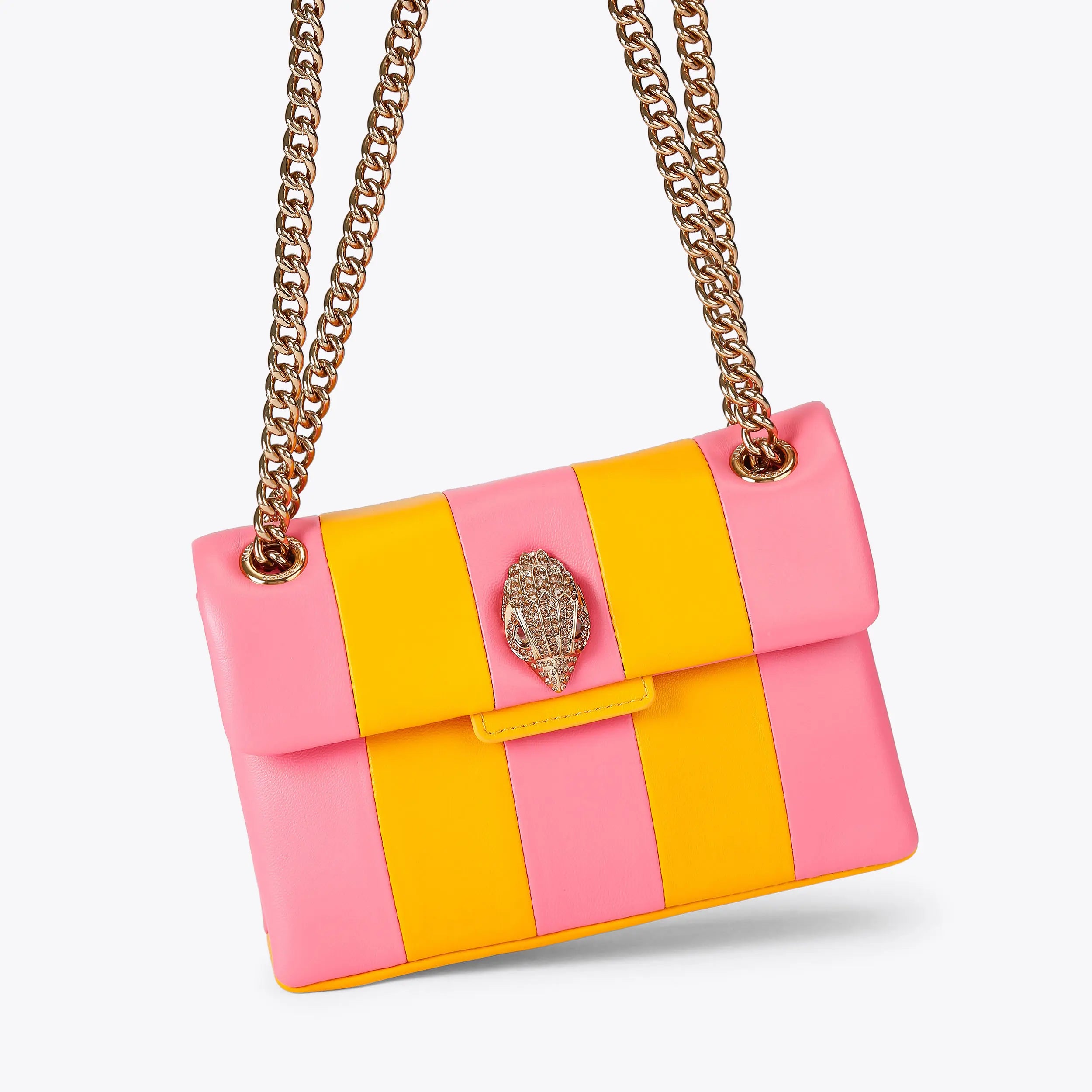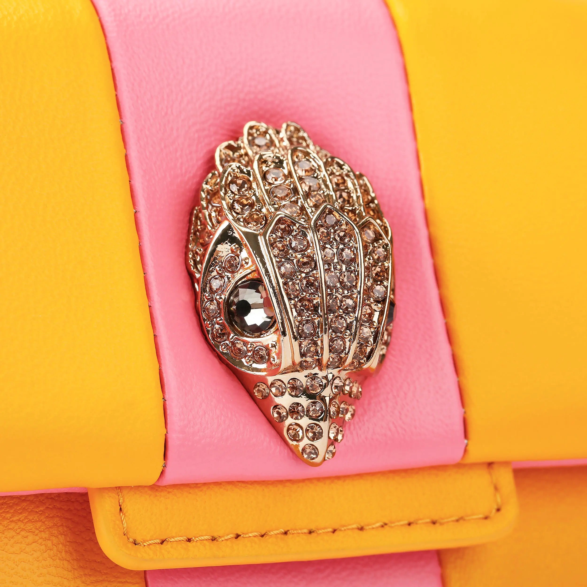 The Mini Leather Kensington purse is crafted from an orange and pink leather in stripes. gold crystal eagle head sits on the front flap.