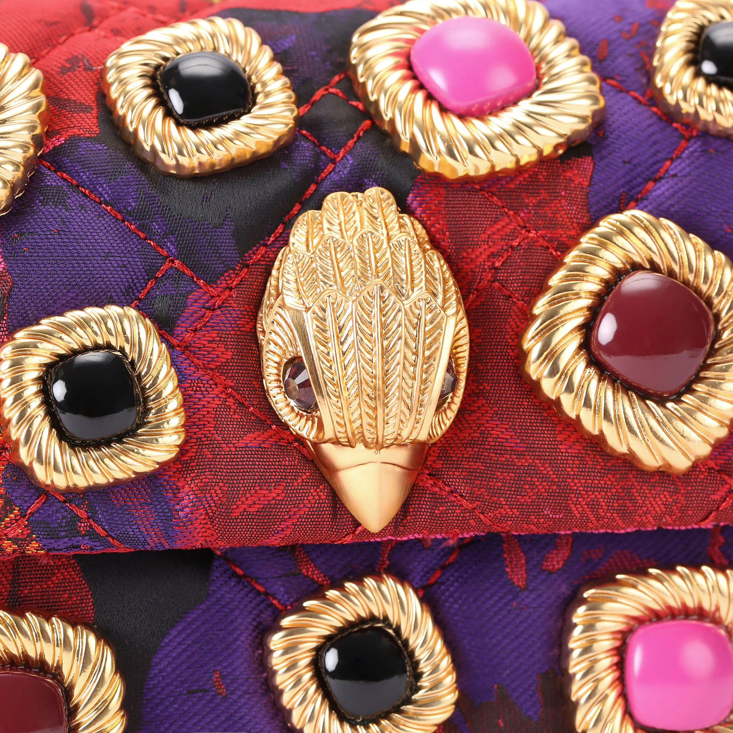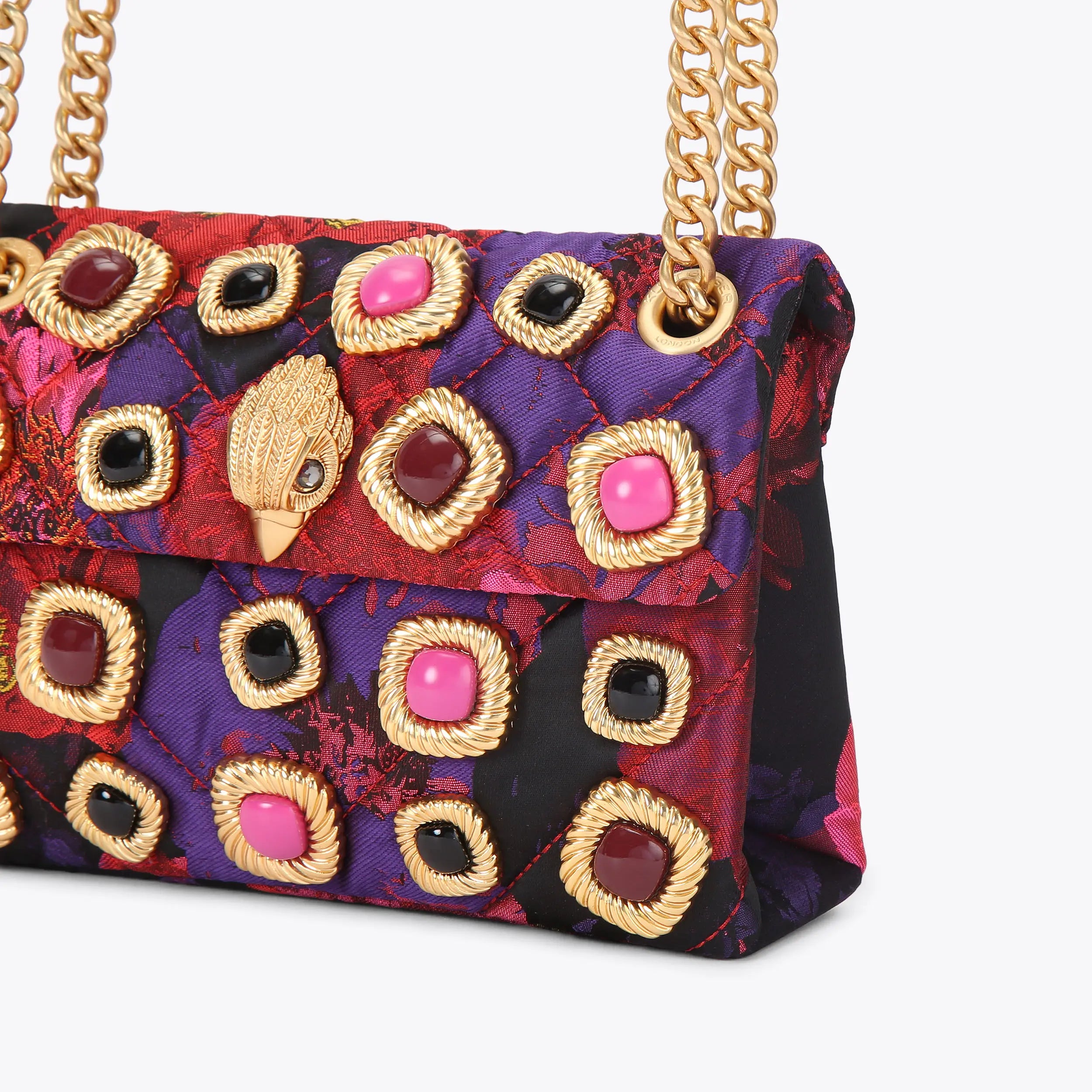 This Mini Kensington Purse is crafted in a purple and fuchsia floral fabric that is accented with stones surrounded by brushed gold. The brushed gold eagle head features crystals on the front flap.