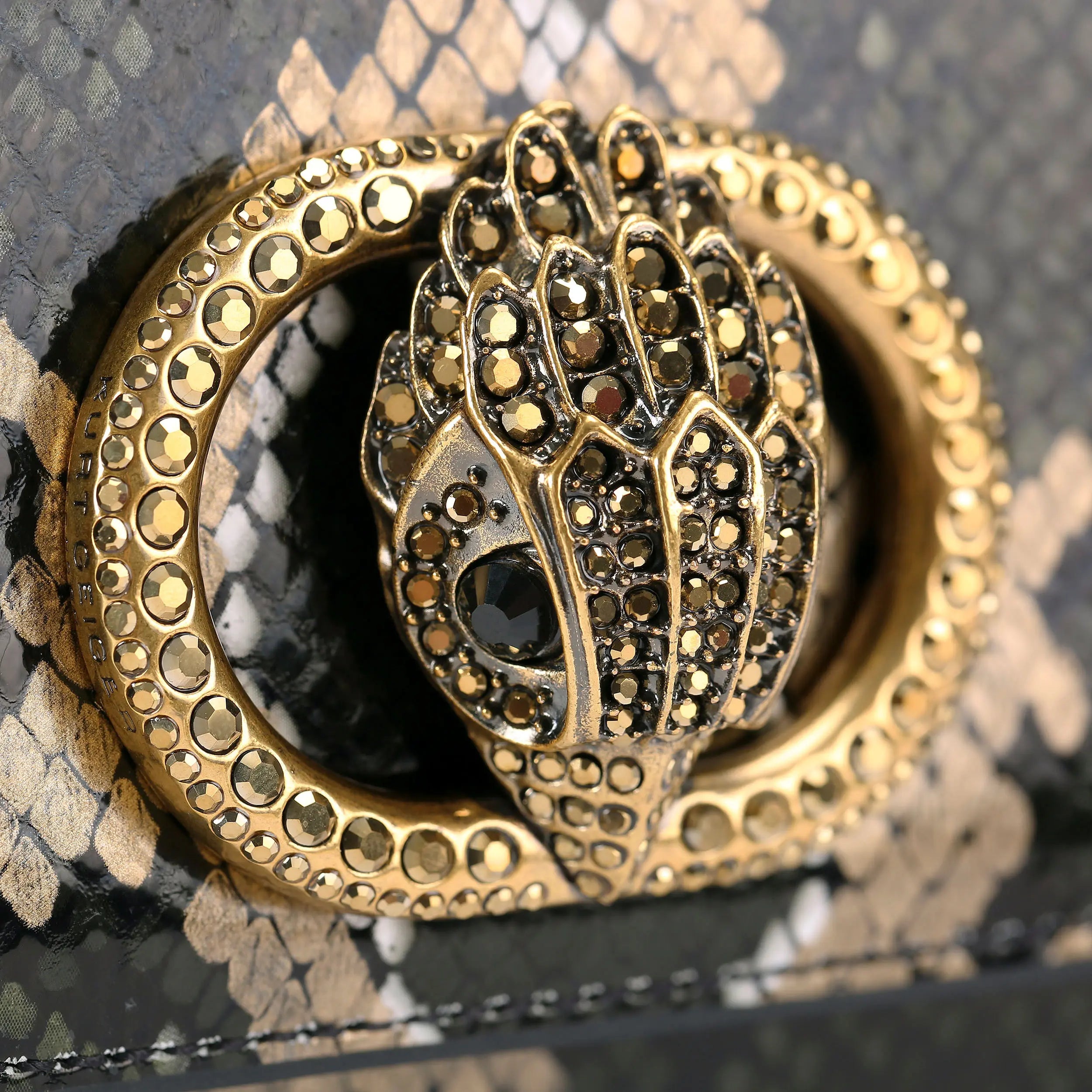 This Small Leather Chelsea Cross Body Purse features a leather exterior with a snake print design. There is an antiqued brass oval trim with crystal eagle head at the centre on the front flap.