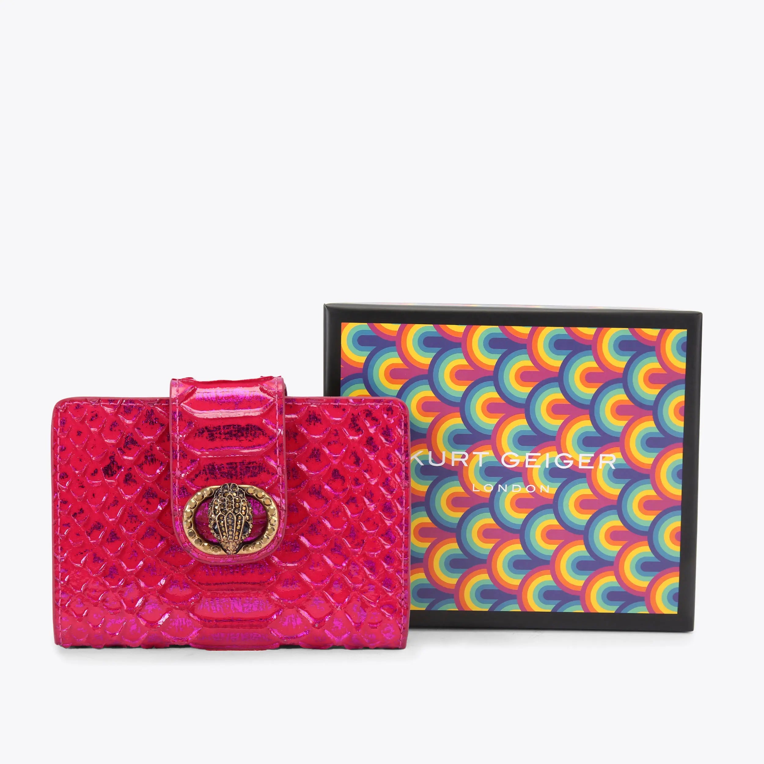 This Chelsea Fold Wallet features a metallic fuchsia 3D embossed snake exterior with single flap closure. There is an antiqued brass oval trim with eagle head and crystal embellishment at the centre of the flap.