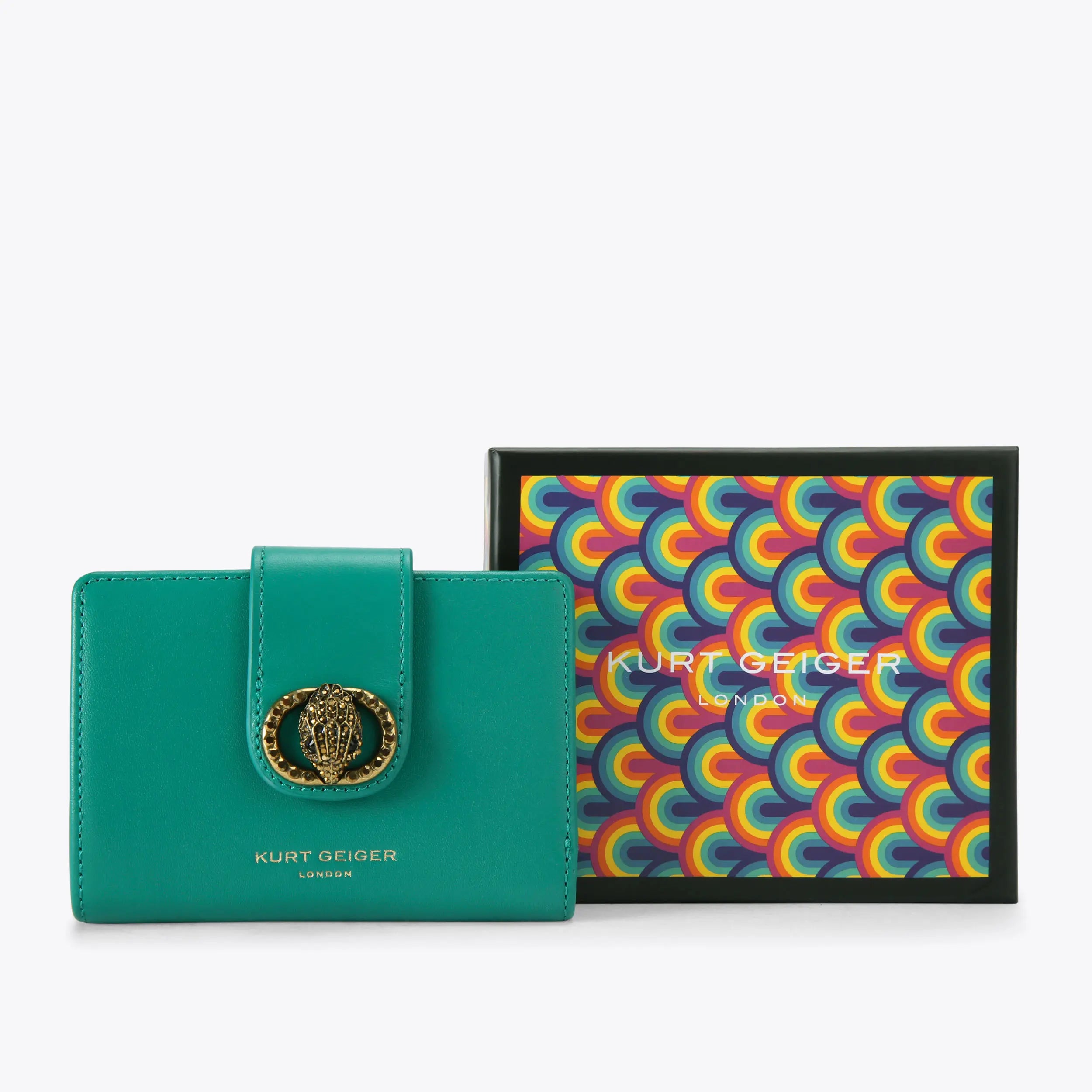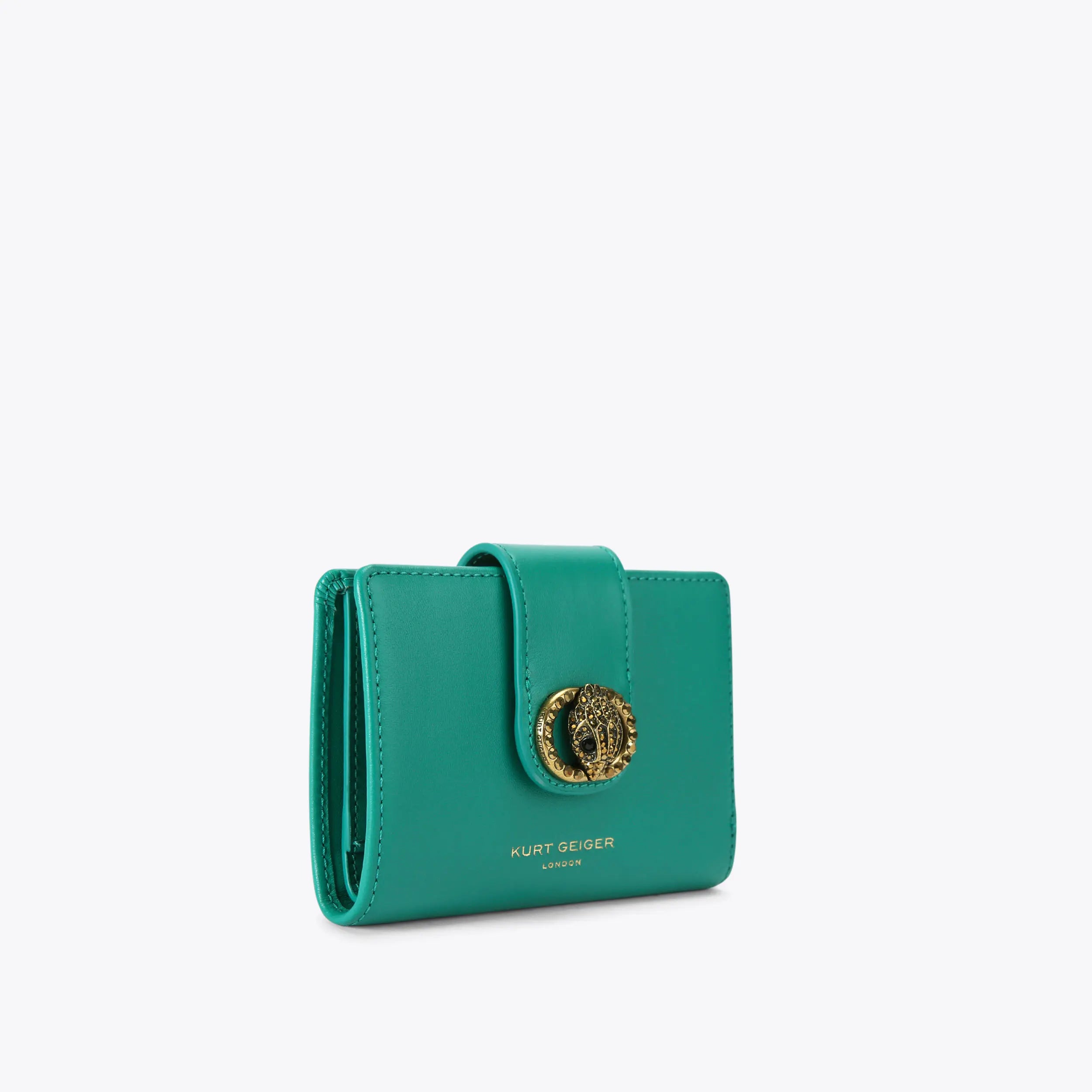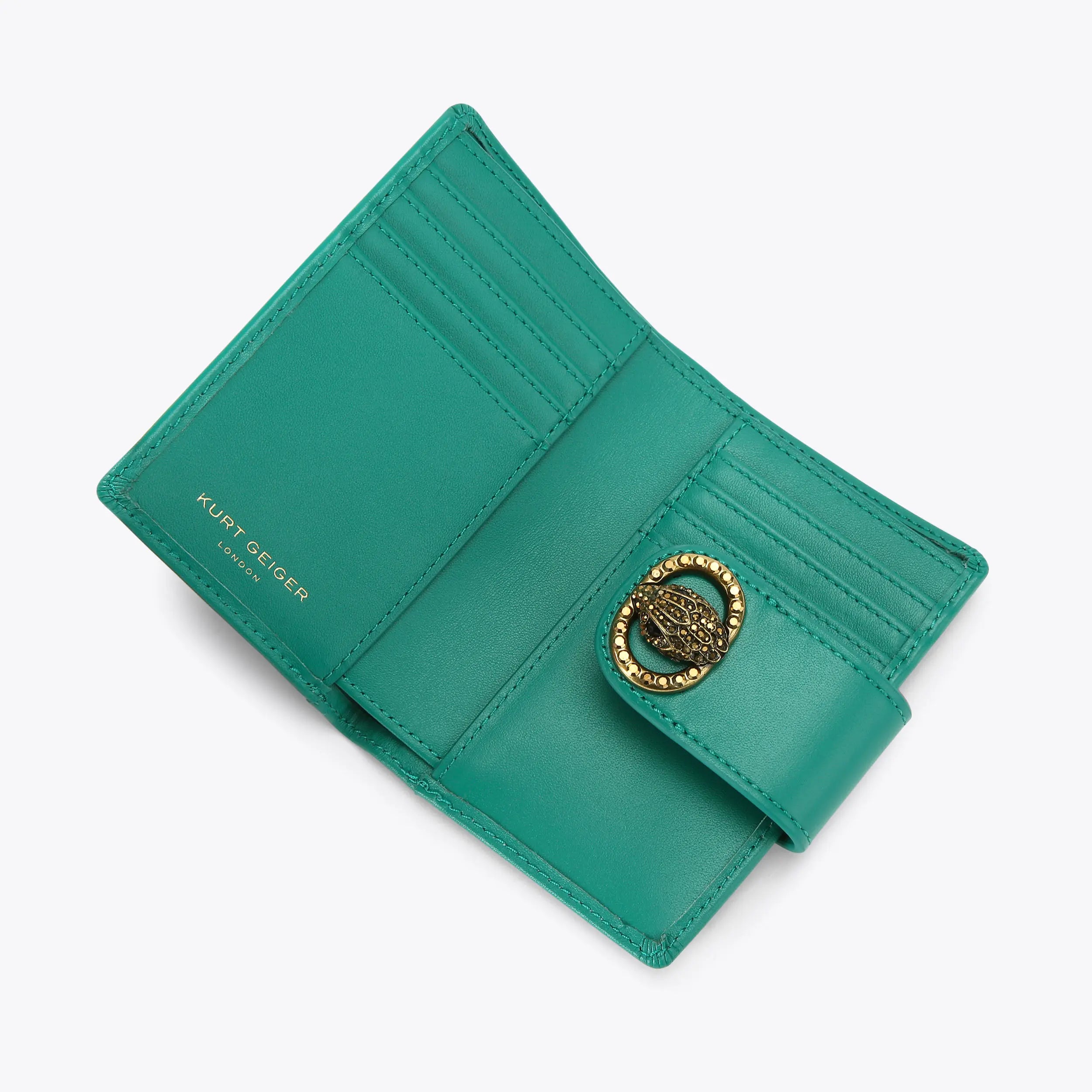 This Chelsea Fold Wallet features a sleek green exterior with single flap closure. There is an antiqued brass oval trim with eagle head and crystal embellishment at the centre of the flap.