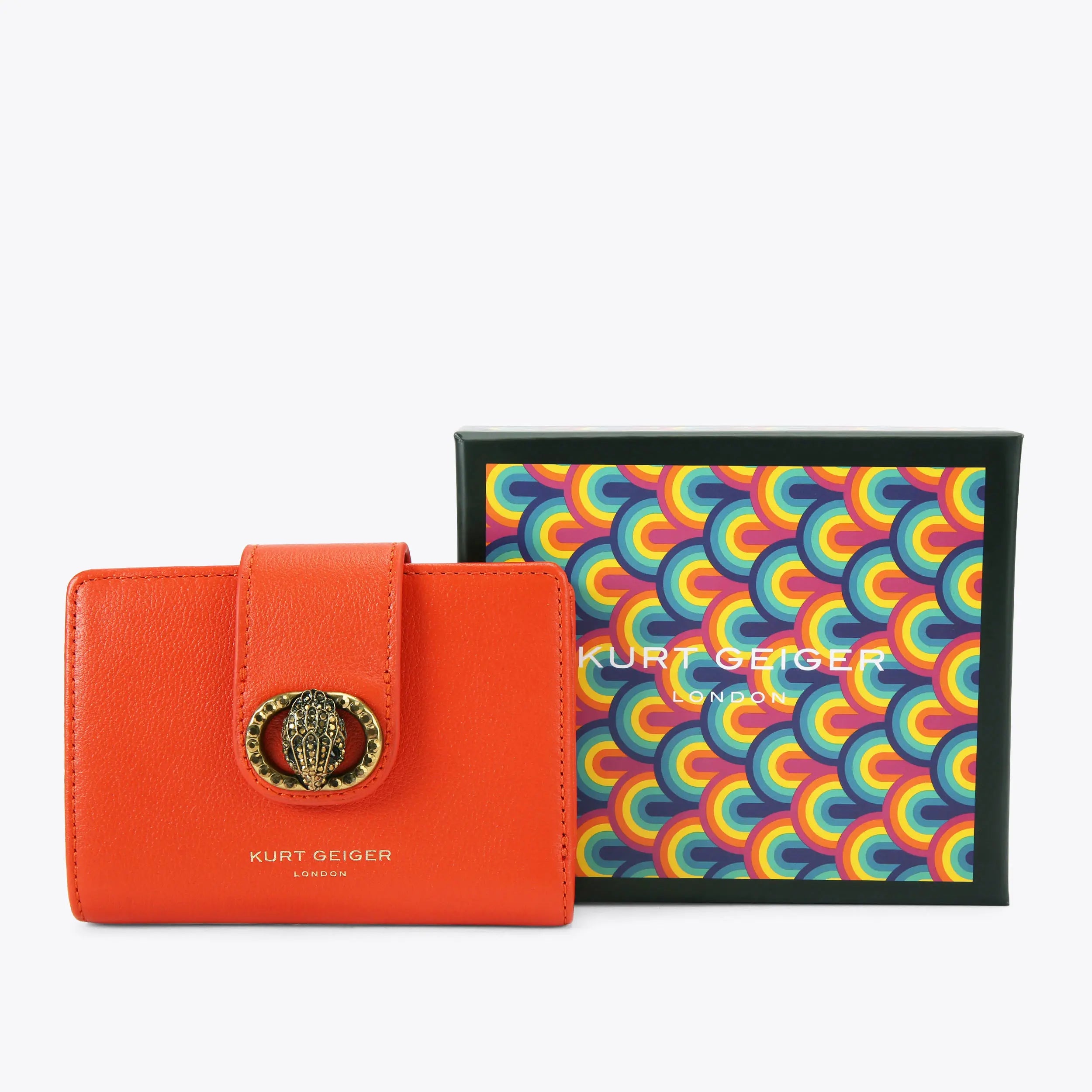 This Chelsea Fold Wallet features an orange exterior with single flap closure. There is an antiqued brass oval trim with eagle head and crystal embellishment at the centre of the flap.