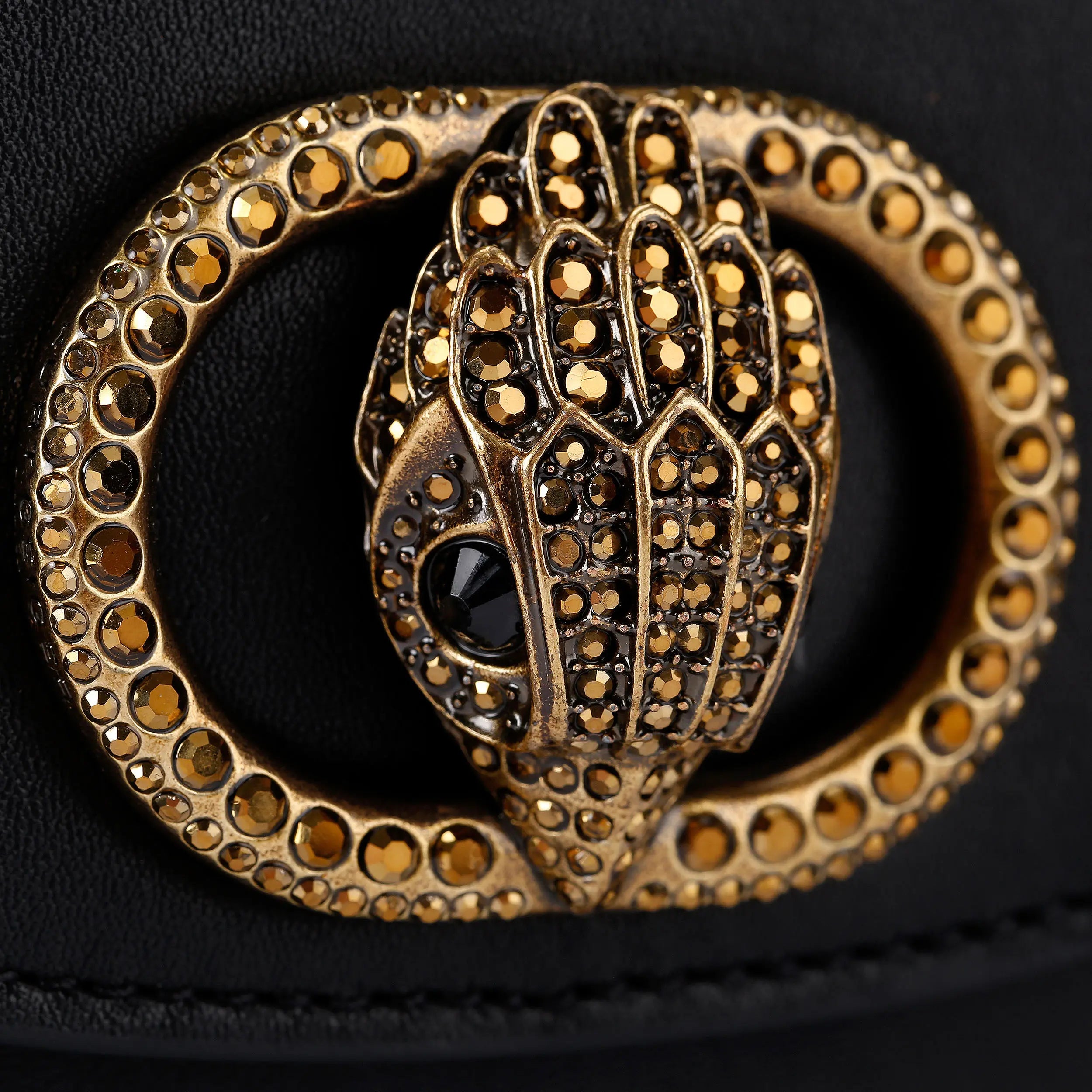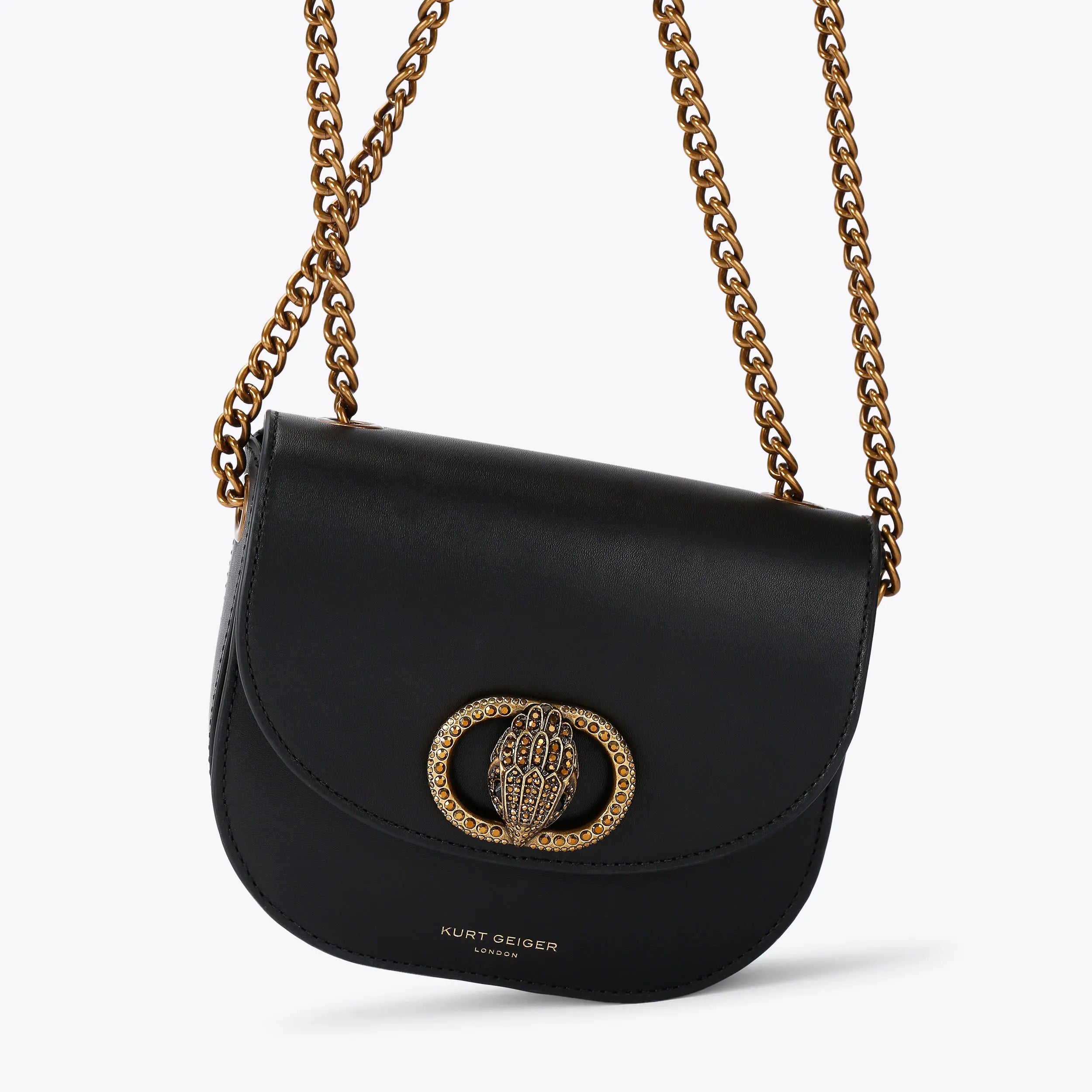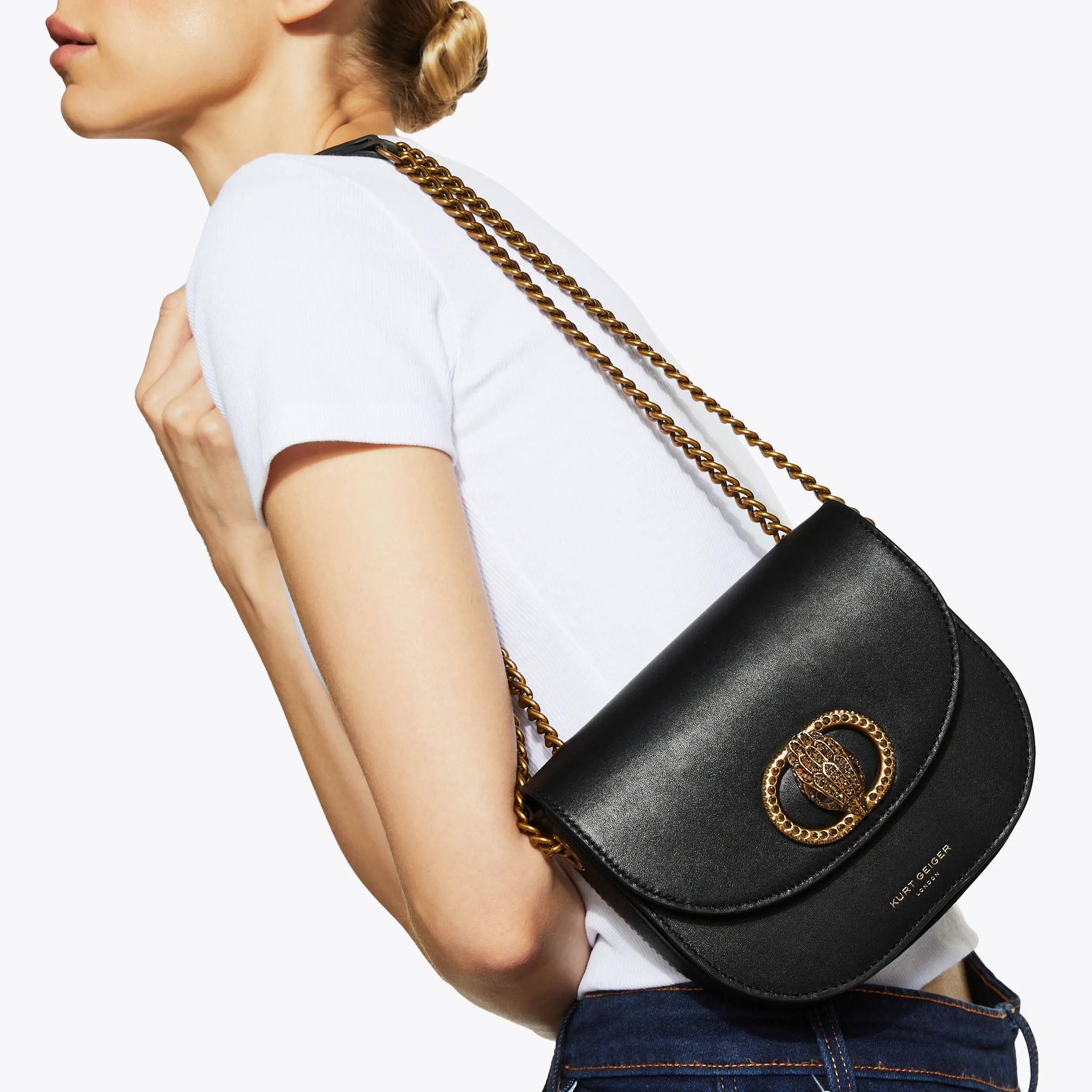 This Chelsea Saddle Purse is a black leather cross body. There is an antiqued brass oval trim with eagle head at the centre on the front flap. There is a front open pocket and zipped pocket inside.