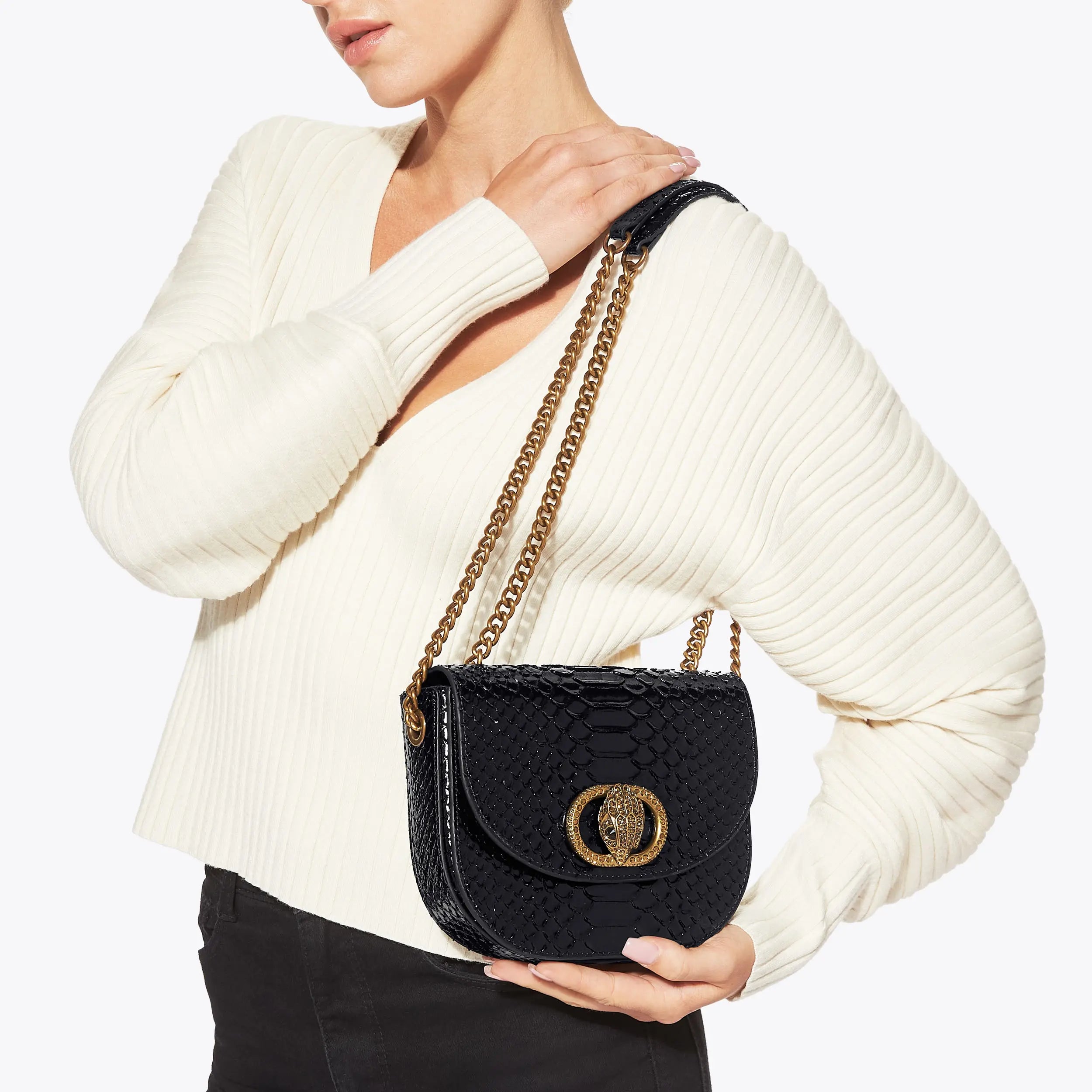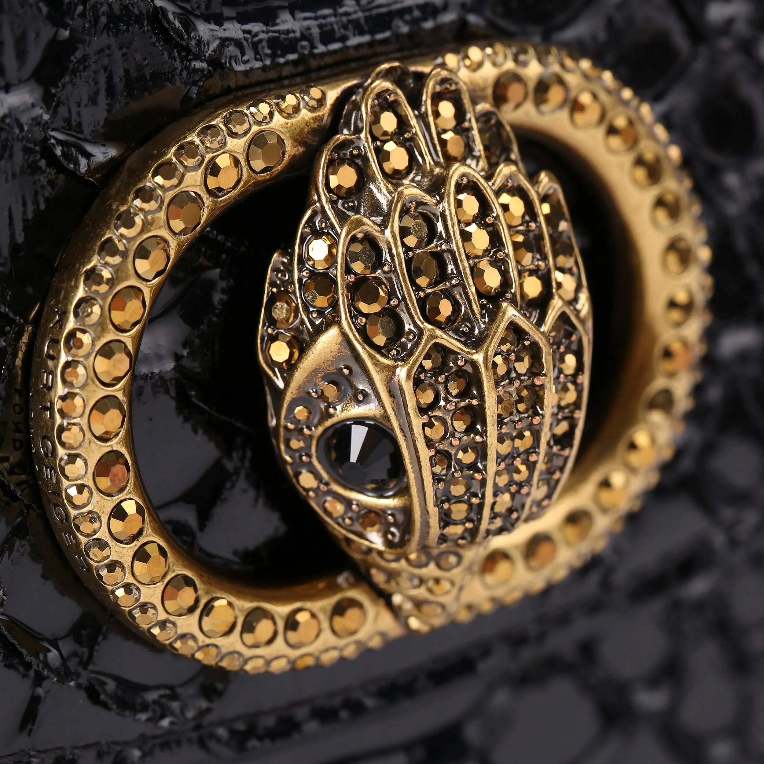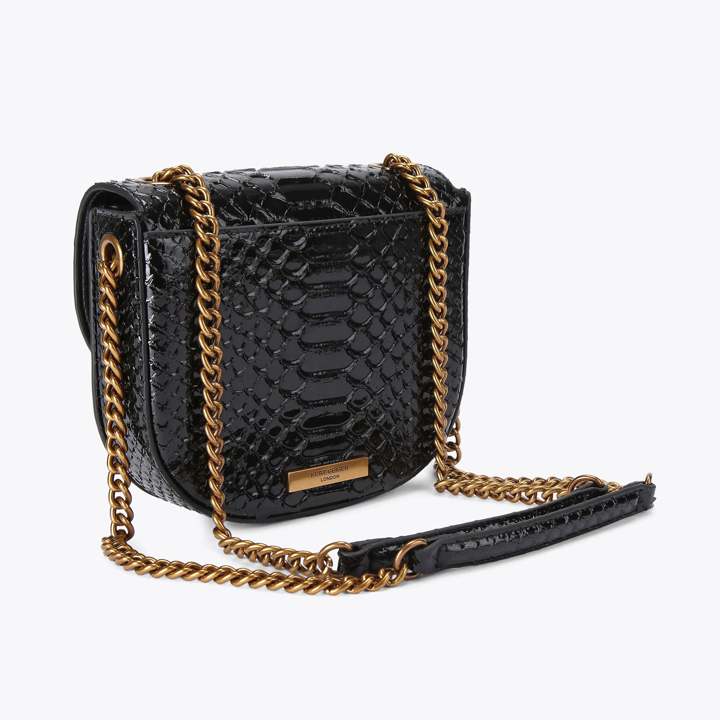 This Chelsea Saddle Bag is a black leather cross body with embossed lizard design. There is an antiqued brass oval trim with eagle head at the centre on the front flap. There is a front open pocket and zipped pocket inside.