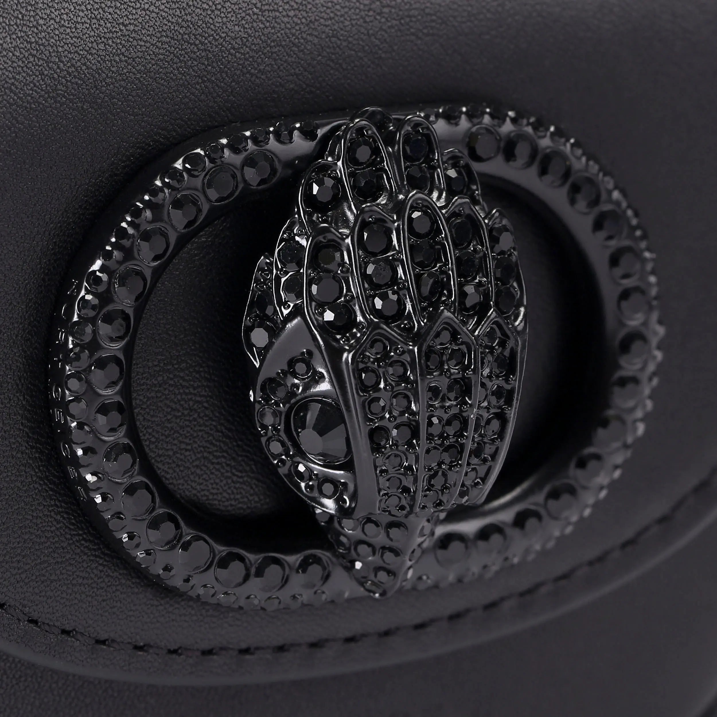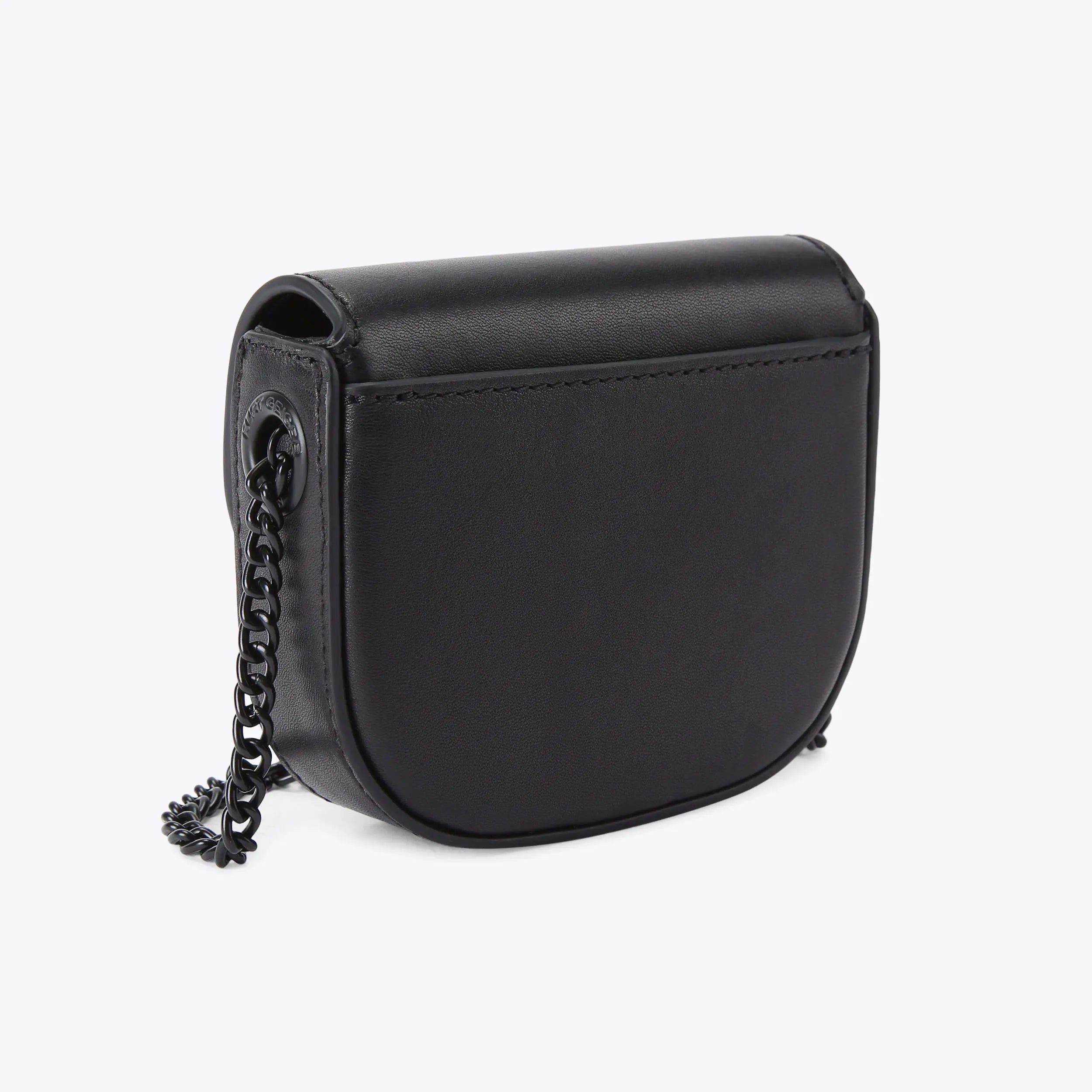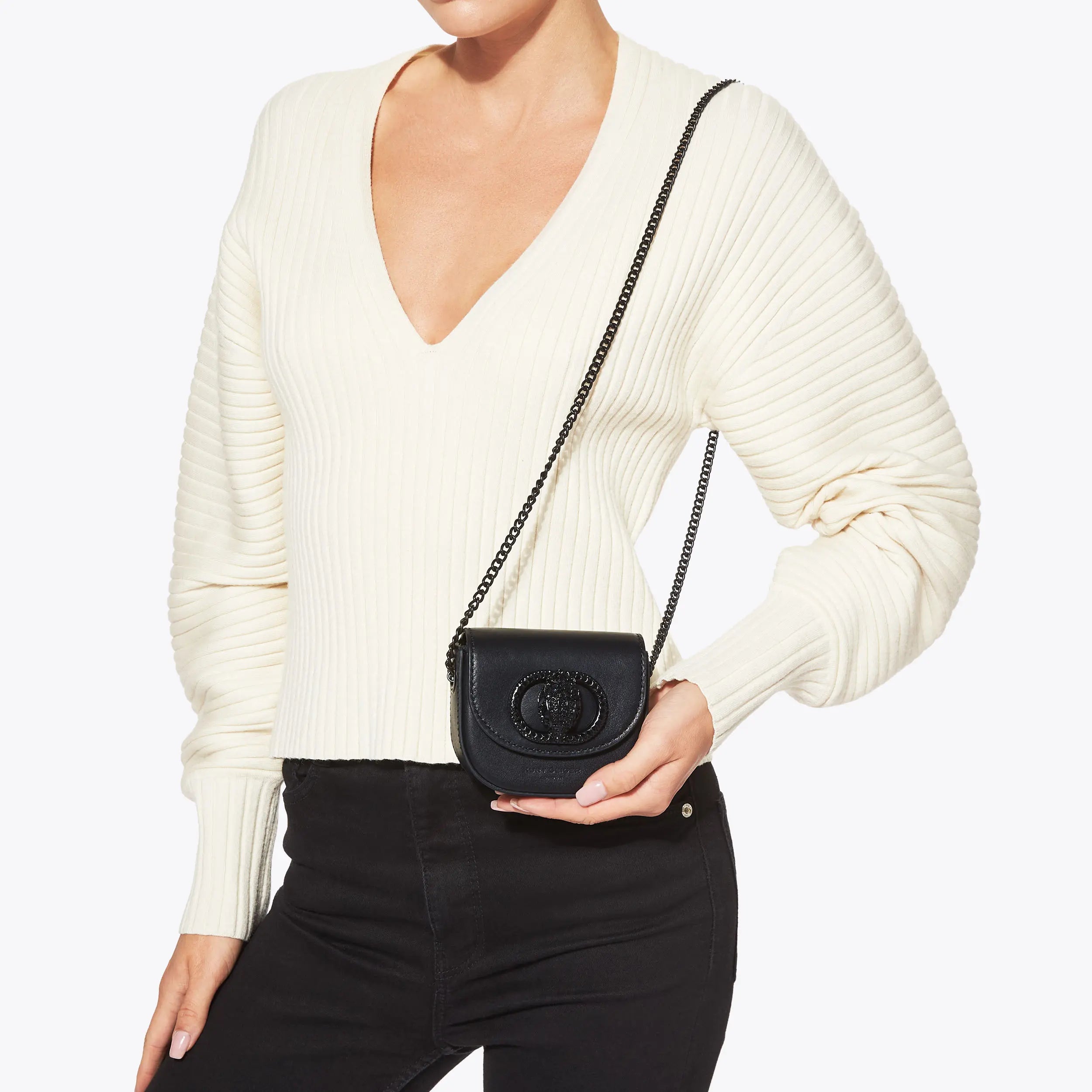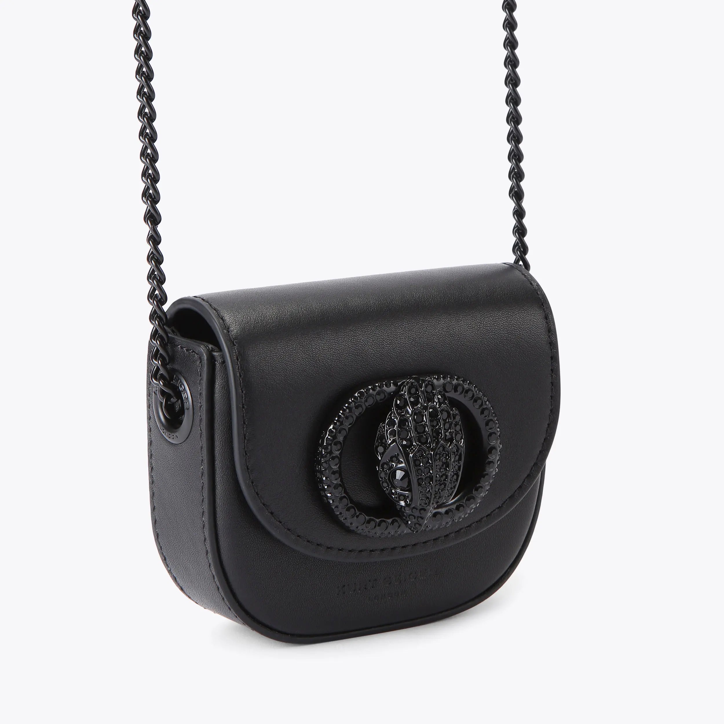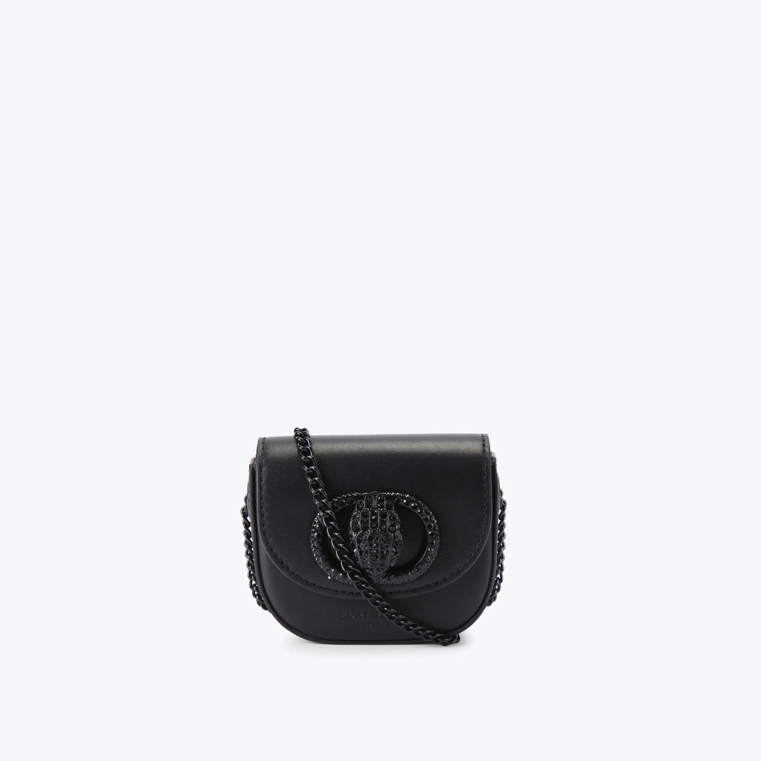 This Micro Drench Chelsea Saddle Purse features a black leather exterior with structure. There is a black oval trim with crystal eagle head at the centre of the front flap.